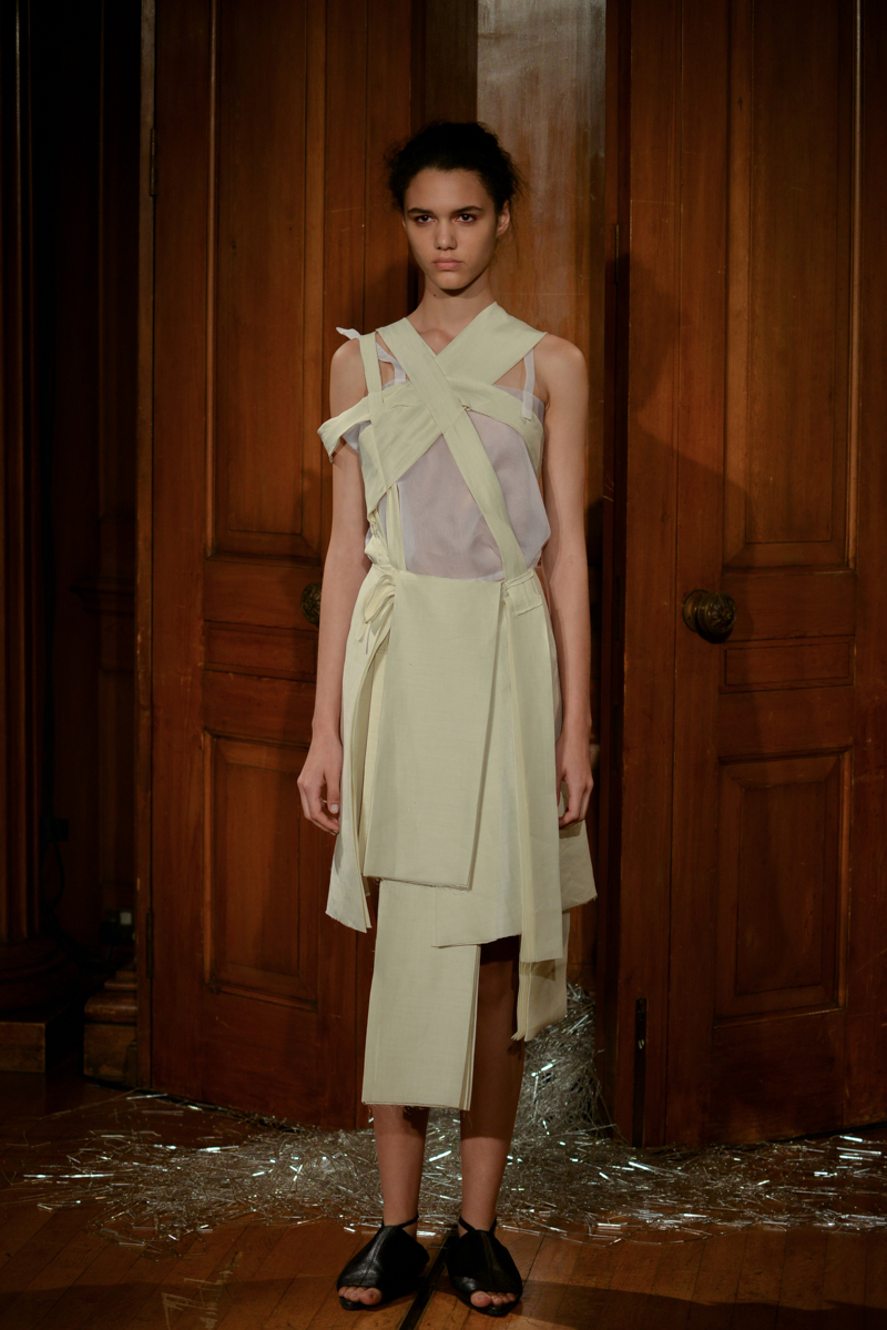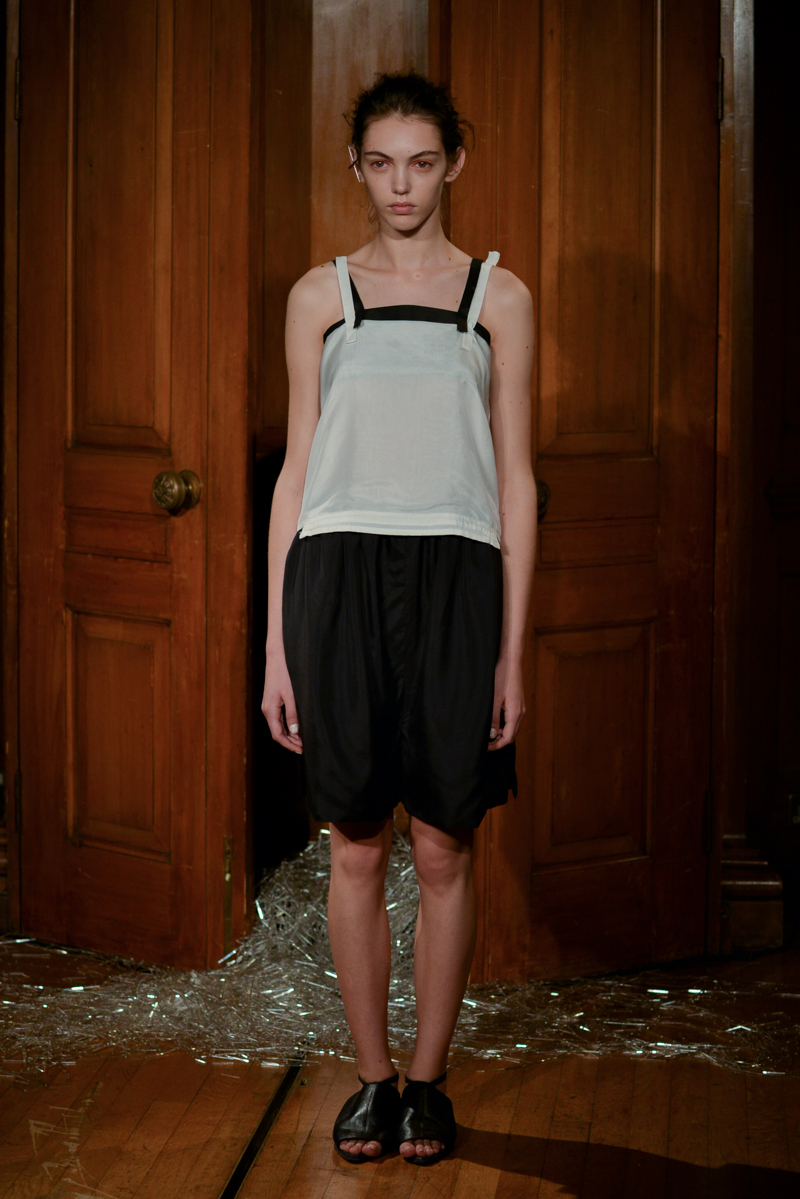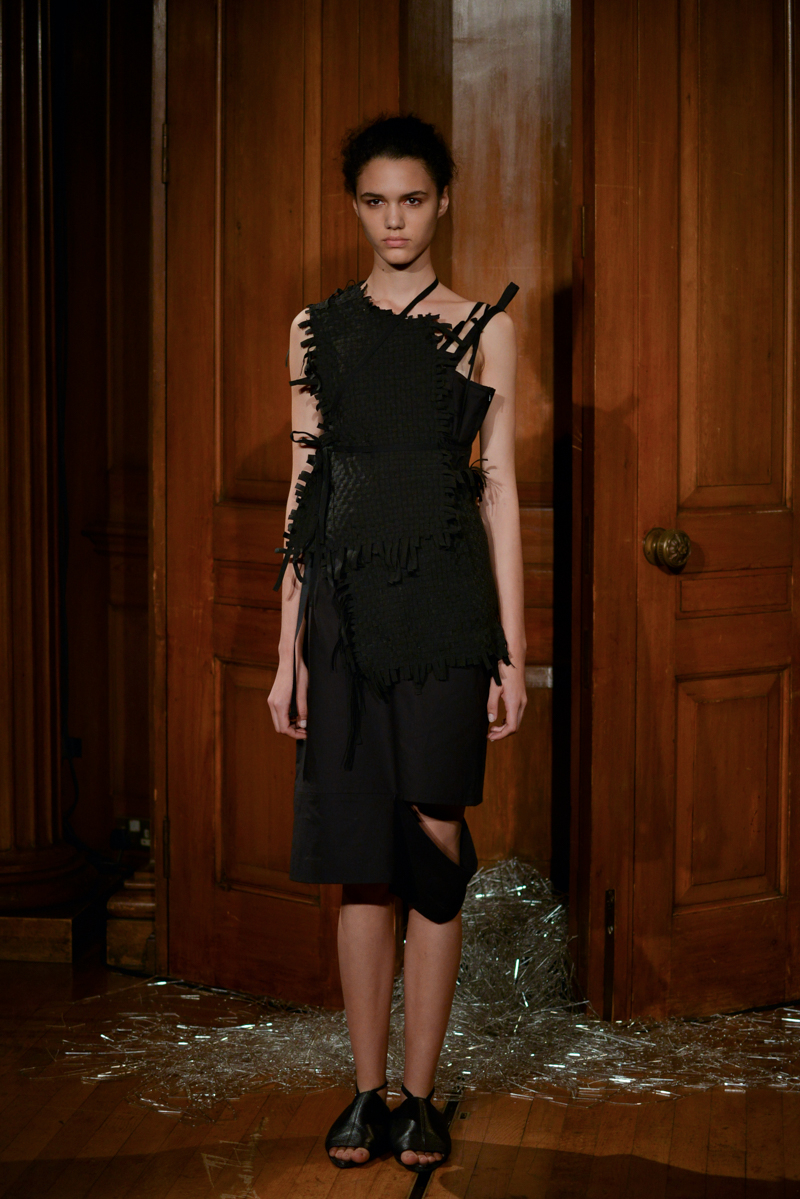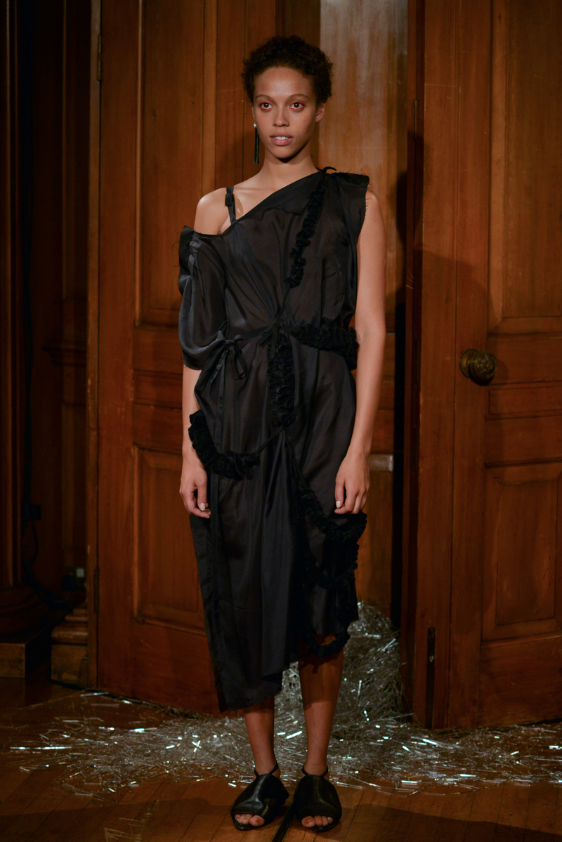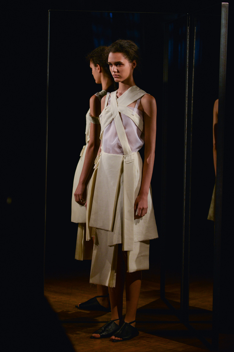 Having recently relocated her studio and team from Hackney to Deptford, it felt like a natural progression for English to translate this new beginning by taking apart then rebuilding materials over the body. Double and triple layers of strapped black and white silk textures formed shirts, dresses and skirts, worn with crêpe and linen draped skirts – the hems of which were fraying. Models wore flat, Japanese-style leather sandals with open backs, echoing the cut-out elements of the garments.