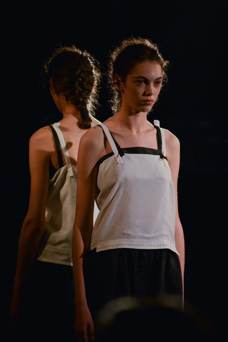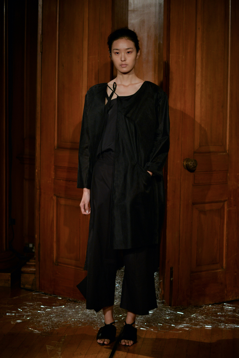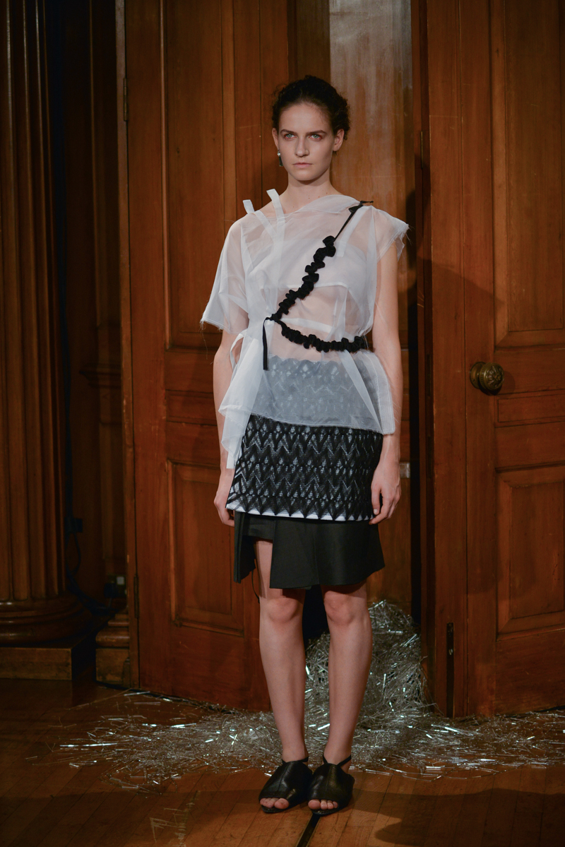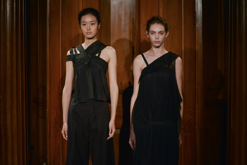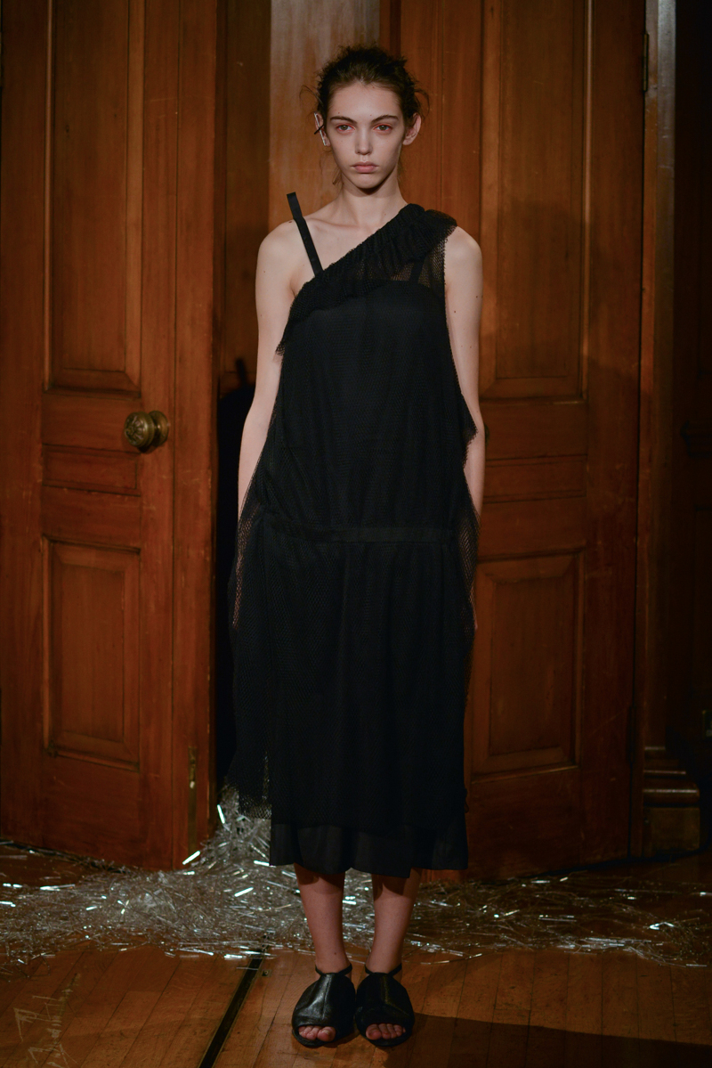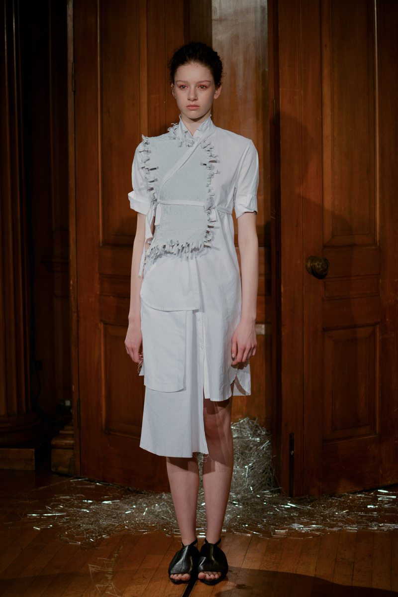 Having recently relocated her studio and team from Hackney to Deptford, it felt like a natural progression for English to translate this new beginning by taking apart then rebuilding materials over the body. Double and triple layers of strapped black and white silk textures formed shirts, dresses and skirts, worn with crêpe and linen draped skirts – the hems of which were fraying. Models wore flat, Japanese-style leather sandals with open backs, echoing the cut-out elements of the garments.
