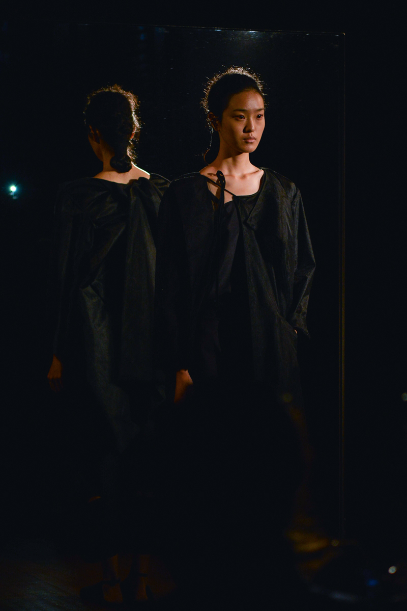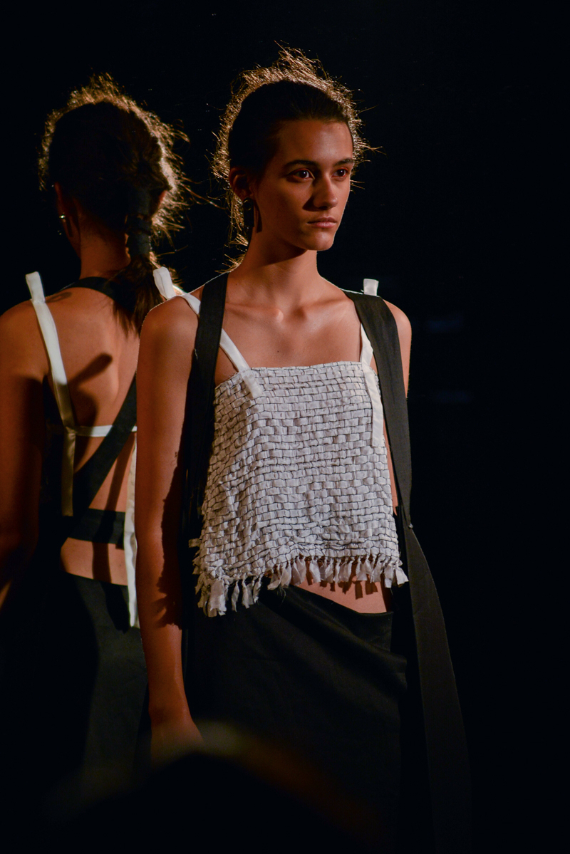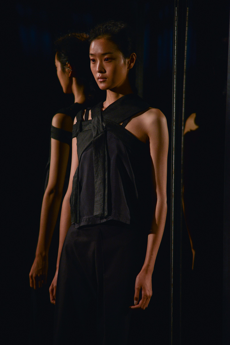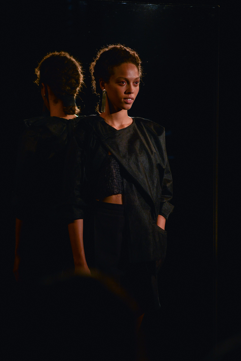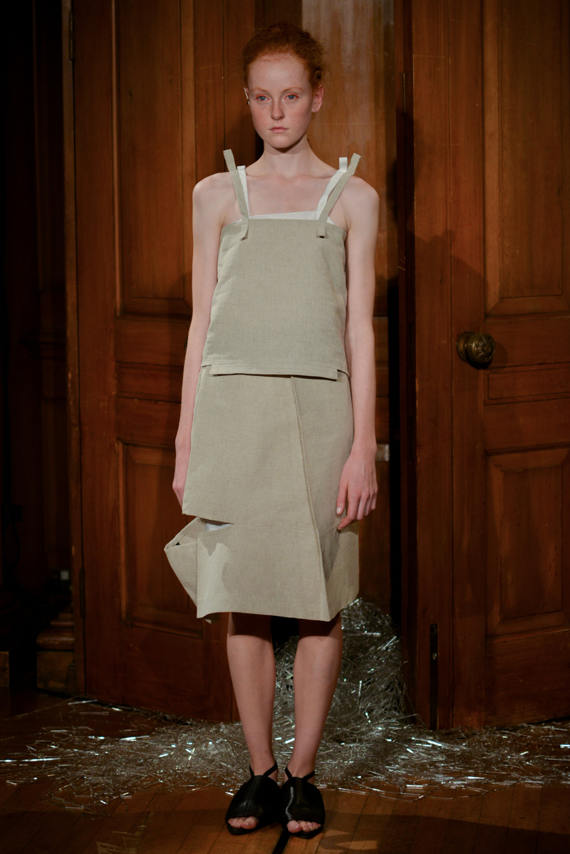 Having recently relocated her studio and team from Hackney to Deptford, it felt like a natural progression for English to translate this new beginning by taking apart then rebuilding materials over the body. Double and triple layers of strapped black and white silk textures formed shirts, dresses and skirts, worn with crêpe and linen draped skirts – the hems of which were fraying. Models wore flat, Japanese-style leather sandals with open backs, echoing the cut-out elements of the garments.