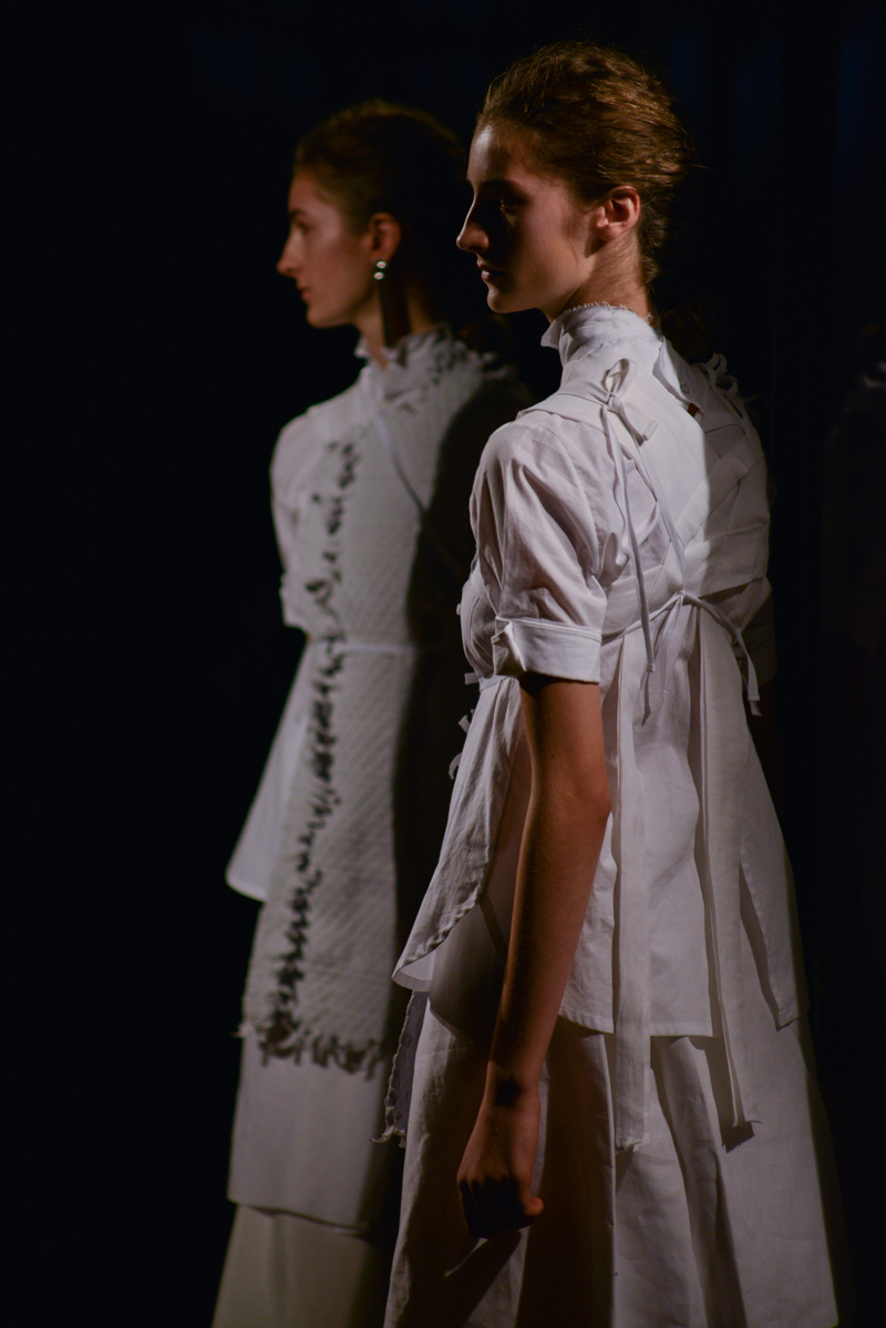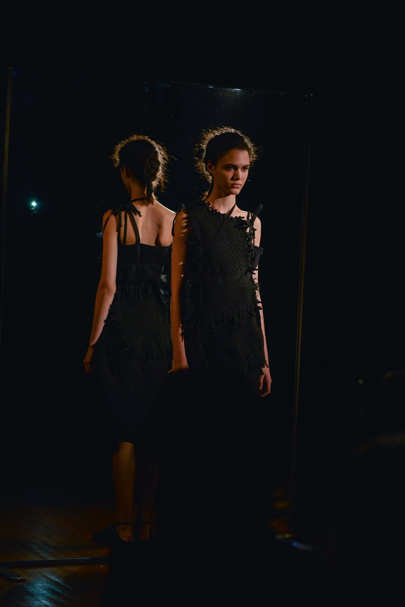 Spliced, jagged seams, multiple layers of fabric and frayed hemlines stood on a floor of shattered glass, whilst jarring discordant chords and faint voices echoed above. This exploration between the deconstructed and reconstructed was carried on to the body, governing Phoebe English’s garments.