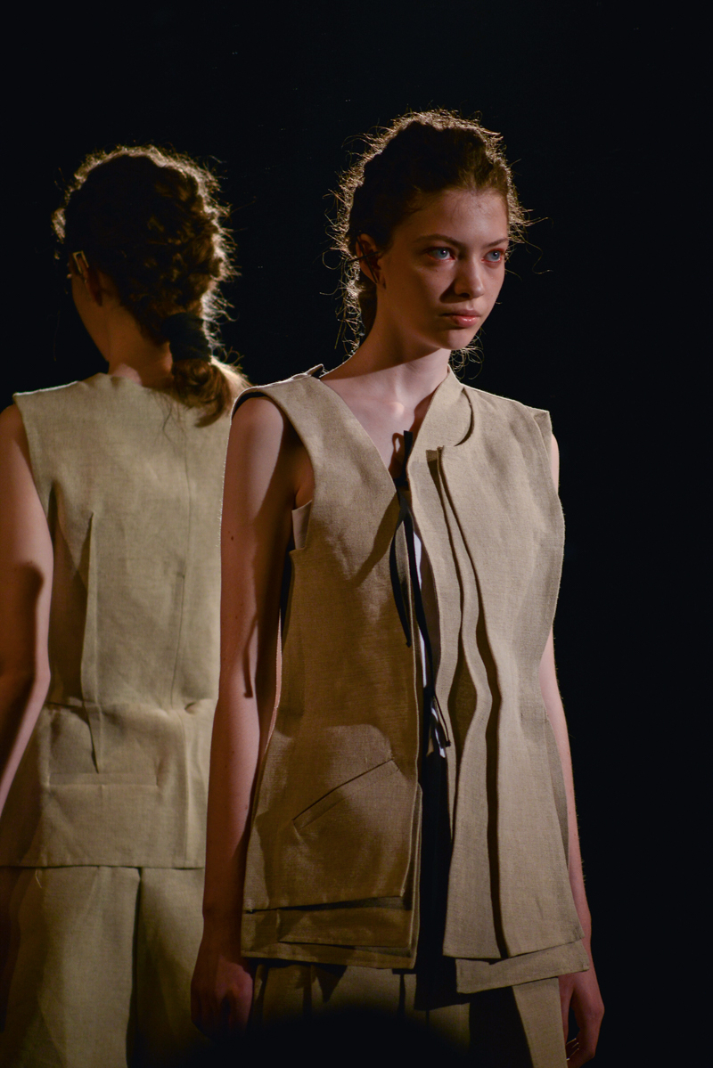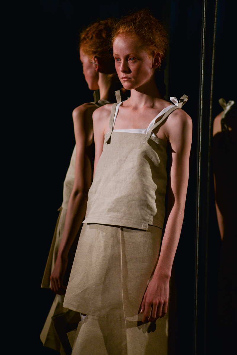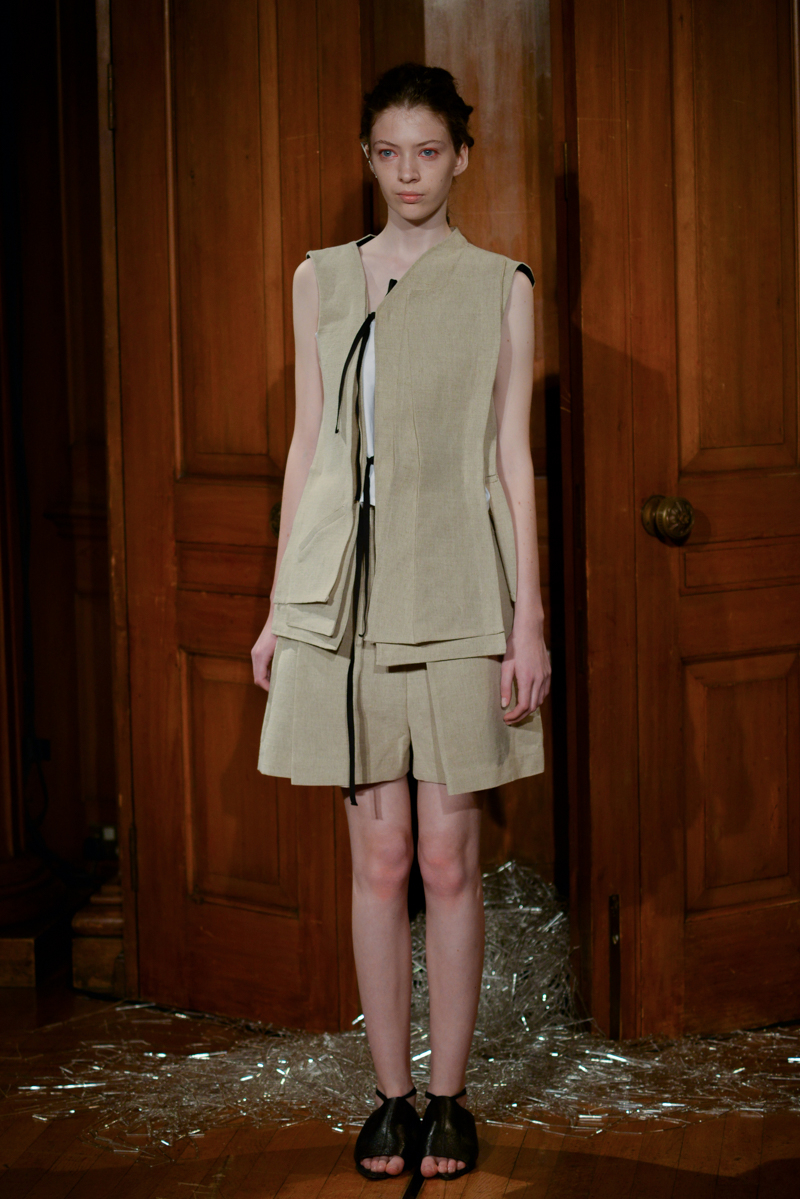 Phoebe English took full advantage of her new, larger studios by using the space to explore surface and texture with hand-woven, almost Arte Povera inspired canvas and plastic weaves intertwined jauntily over the models. String was used to cinch in the oversized linen waists, bandage style straps were patched across the top and backs, and heat-set pleats hung down adding volume in flax. Shorts, soft crêpe shirts and loose-fitting straps incorporated elements of masculine style tailoring, timely after English showed her first menswear collection in June.