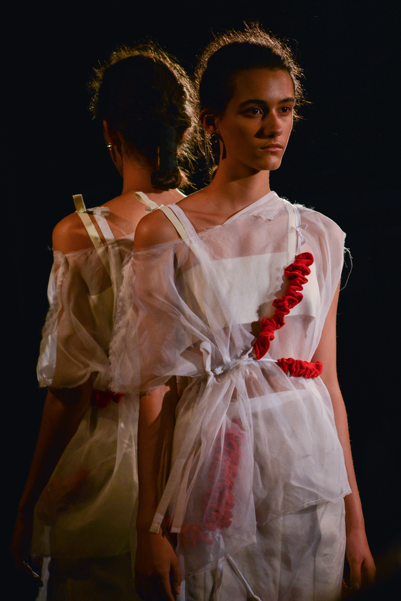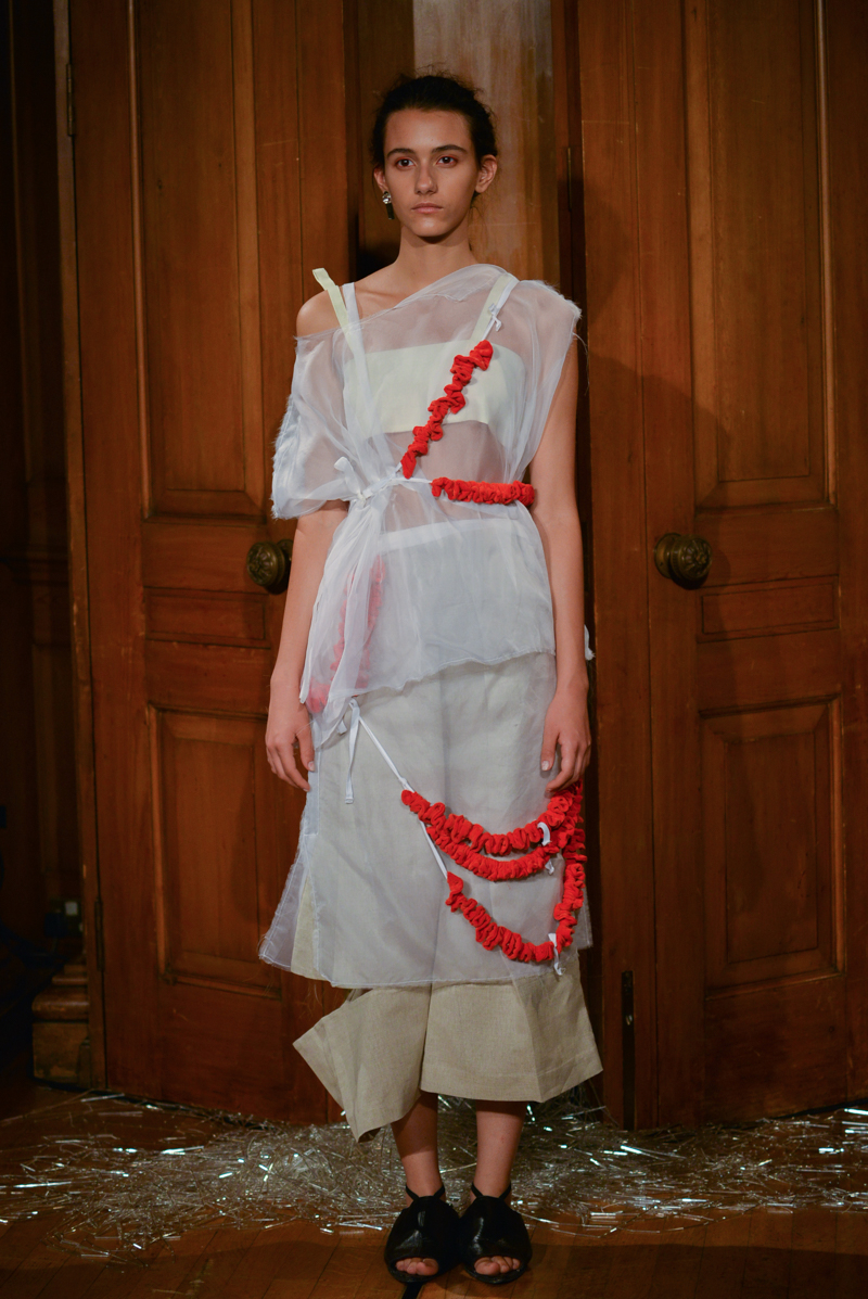 Garlands of red velvet frills overhung sheer, disassembled and oversized layers in black, white and beige, as though English had used a skilled surgeon’s knife to dissect and carefully reassemble her spring/summer 2016 collection. How topical then to introduce her latest work at the Royal College of Surgeon’s – home to the rather gruesome yet intrinsically beguiling Hunterian Museum.