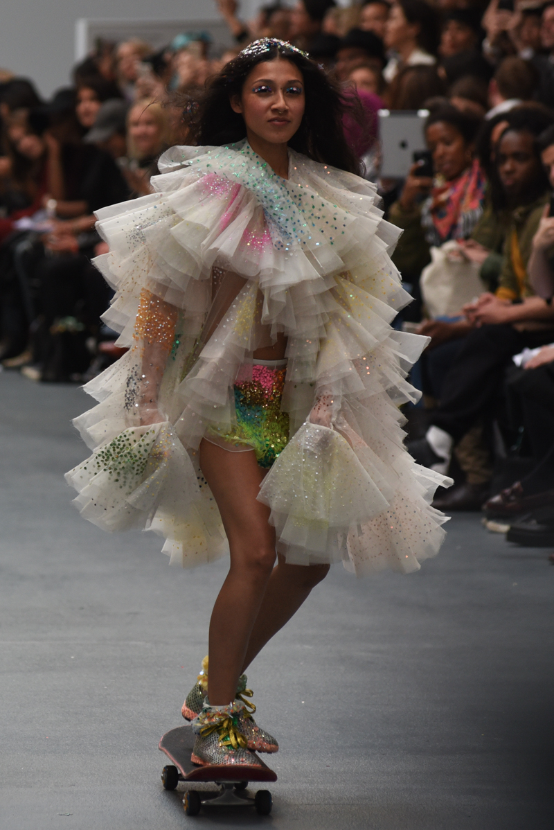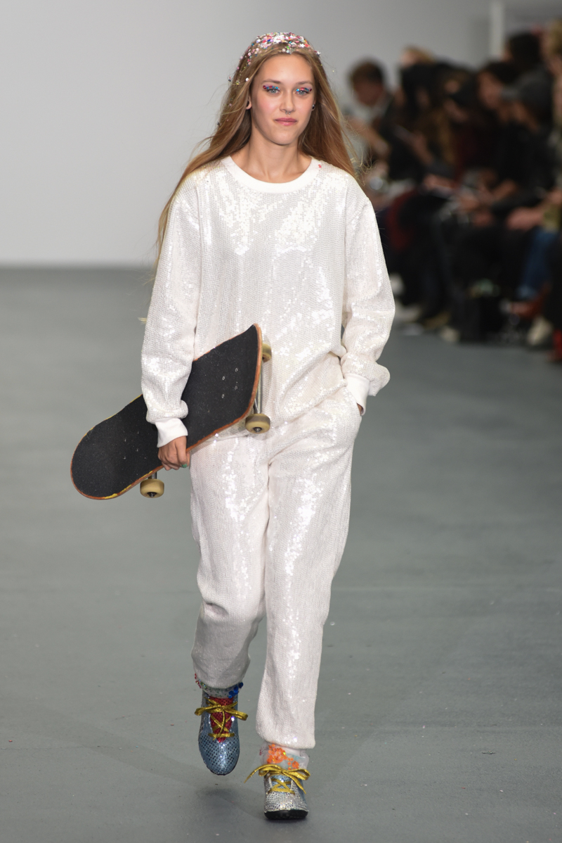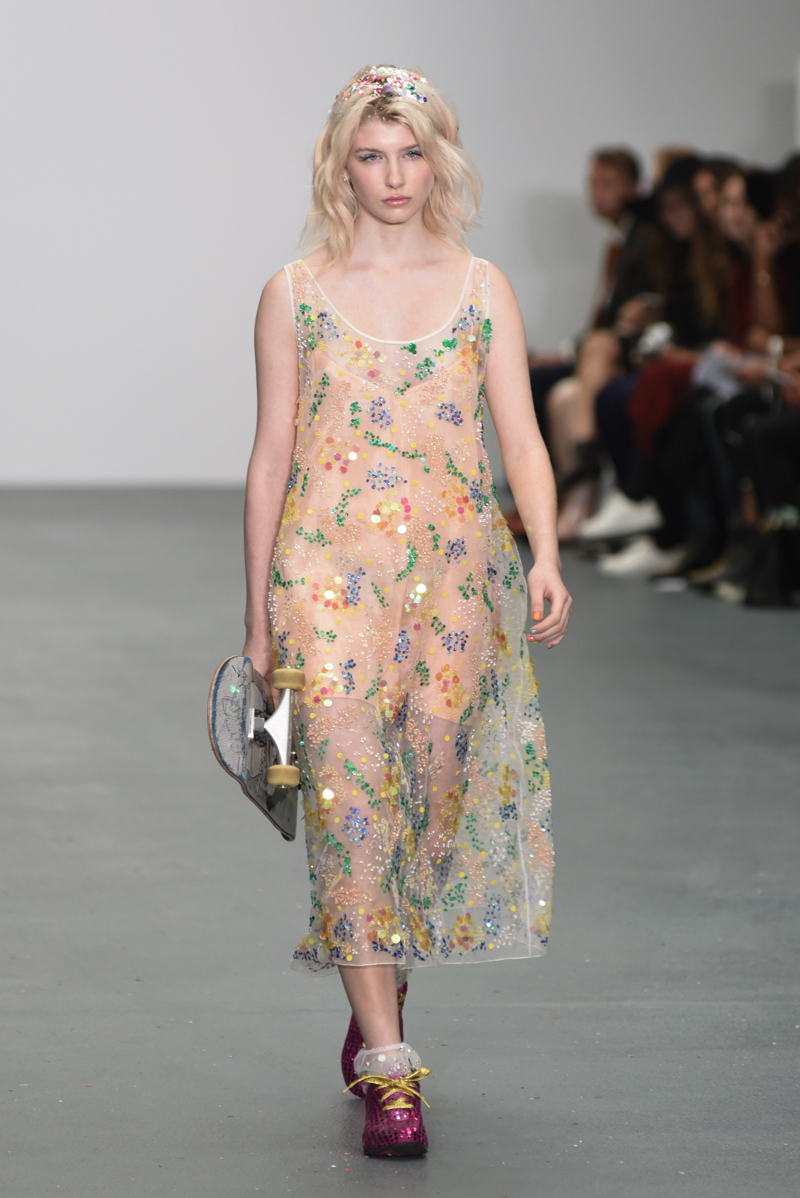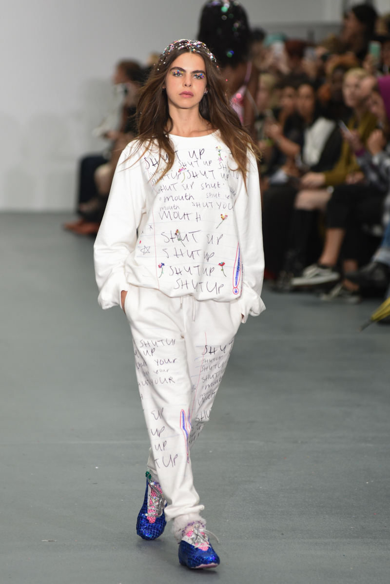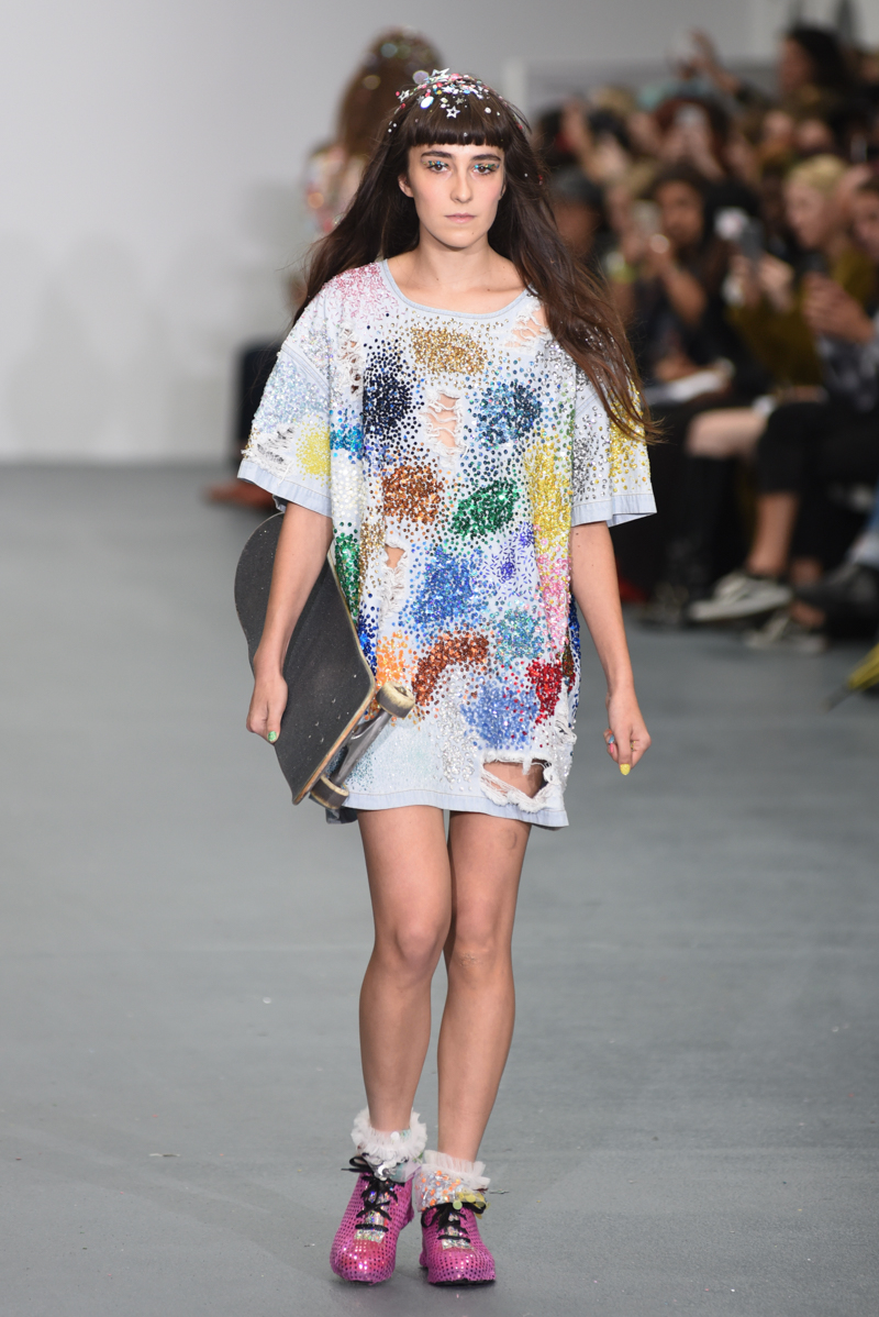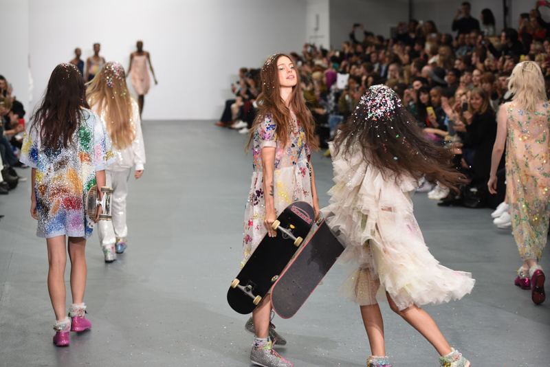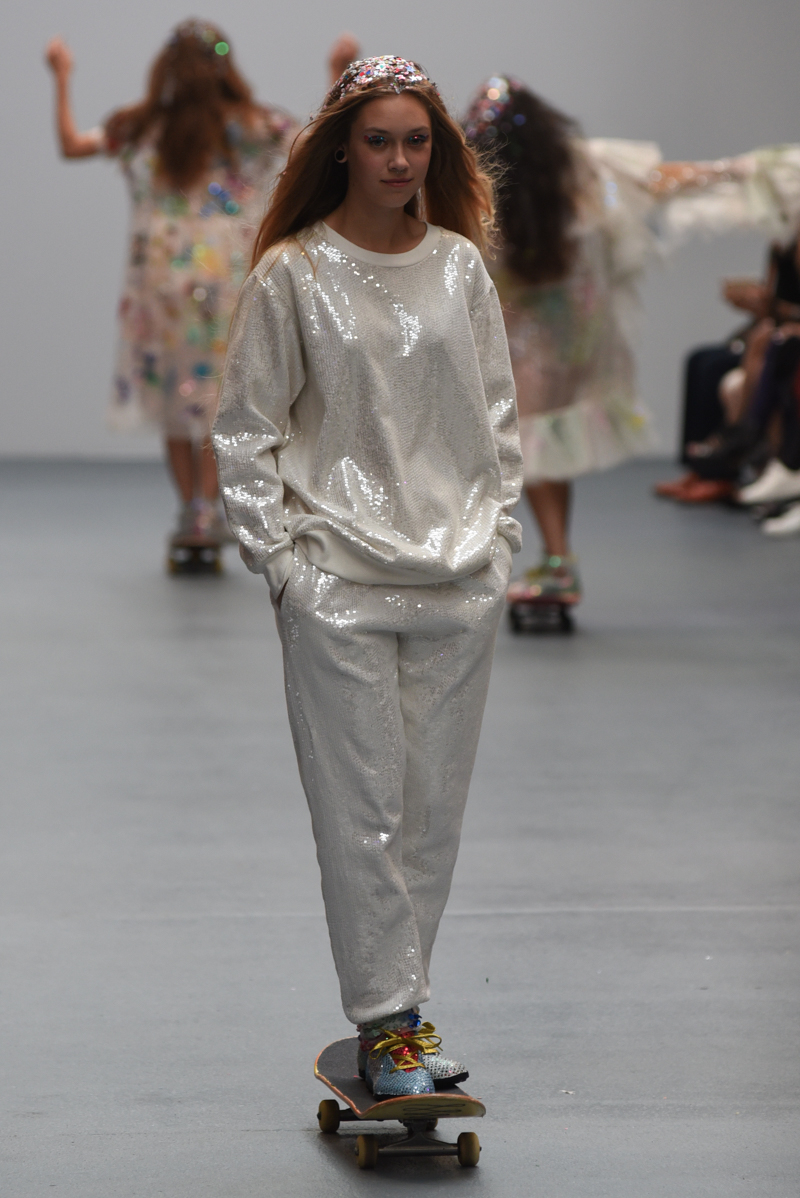 Led by the troop of 90s glitter fairies on skateboards, models appeared sporting white tulle puffed prom dresses patched with rainbow beads, gigantic ruffles, fully glitter encrusted joggers and hotpants, oversized denim bombers and tennis shorts fraying at the seams, glitter trainers and handfuls of sequins were strewn in hair. There was a distinct devil-may-care attitude with ‘Shut your mouth’ repeated as though hand-written on a school chalk board, over slogan jumpers and trousers. Double set spaghetti straps on loose silk nightdresses, one strap purposefully hanging down added to this carefree, fun attitude.