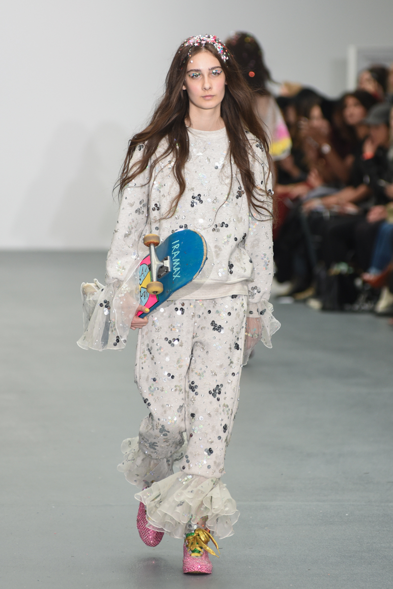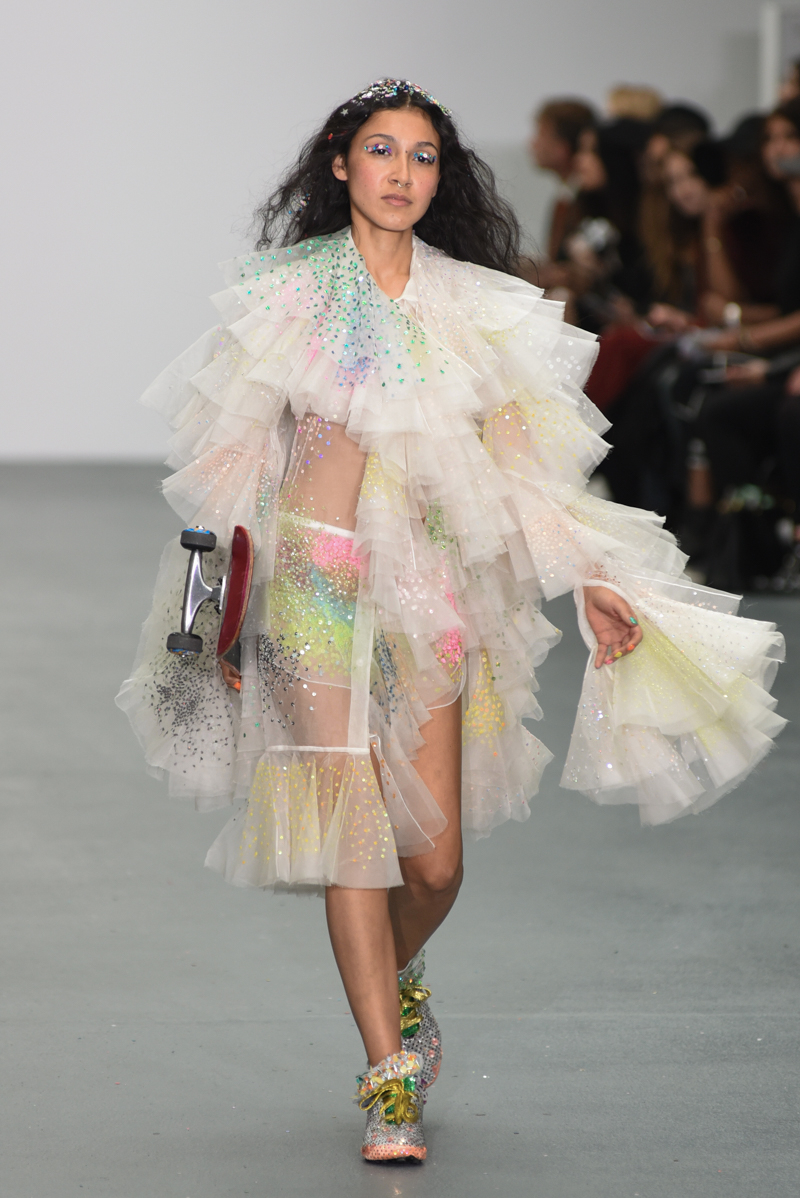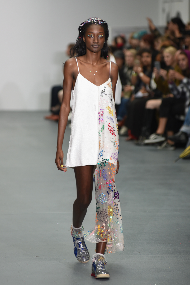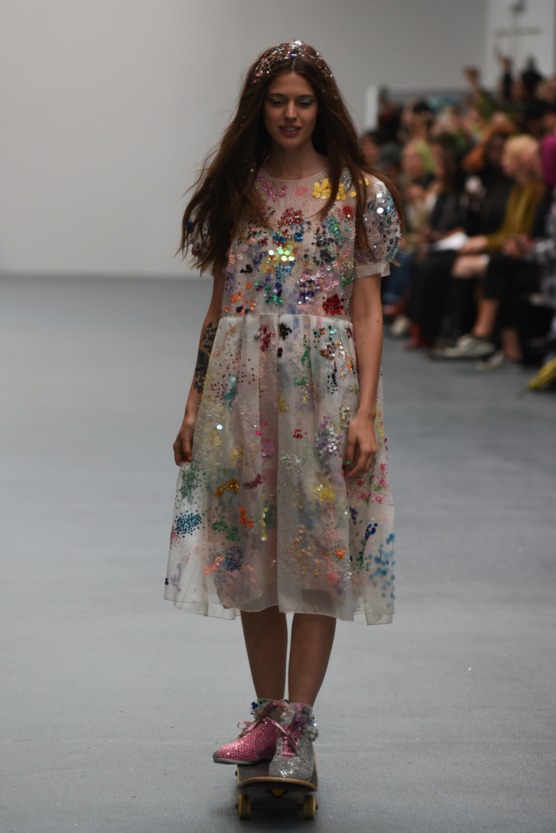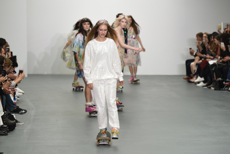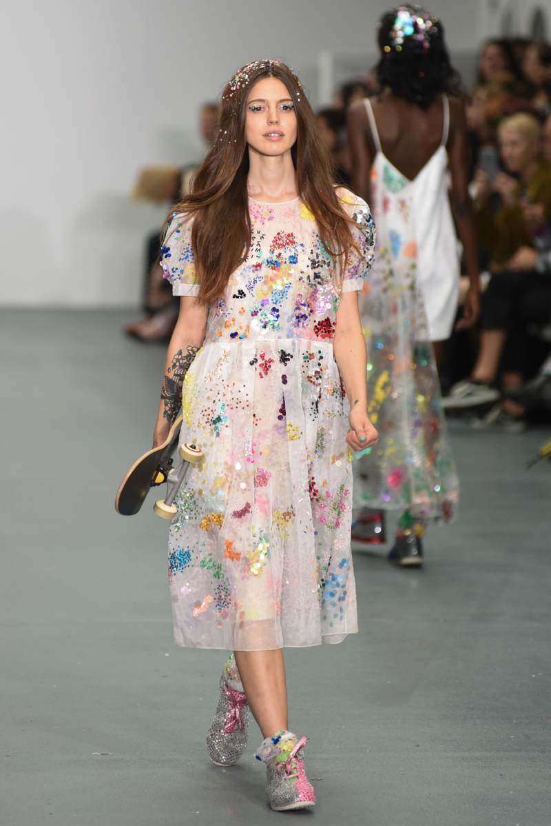 Led by the troop of 90s glitter fairies on skateboards, models appeared sporting white tulle puffed prom dresses patched with rainbow beads, gigantic ruffles, fully glitter encrusted joggers and hotpants, oversized denim bombers and tennis shorts fraying at the seams, glitter trainers and handfuls of sequins were strewn in hair. There was a distinct devil-may-care attitude with ‘Shut your mouth’ repeated as though hand-written on a school chalk board, over slogan jumpers and trousers. Double set spaghetti straps on loose silk nightdresses, one strap purposefully hanging down added to this carefree, fun attitude.