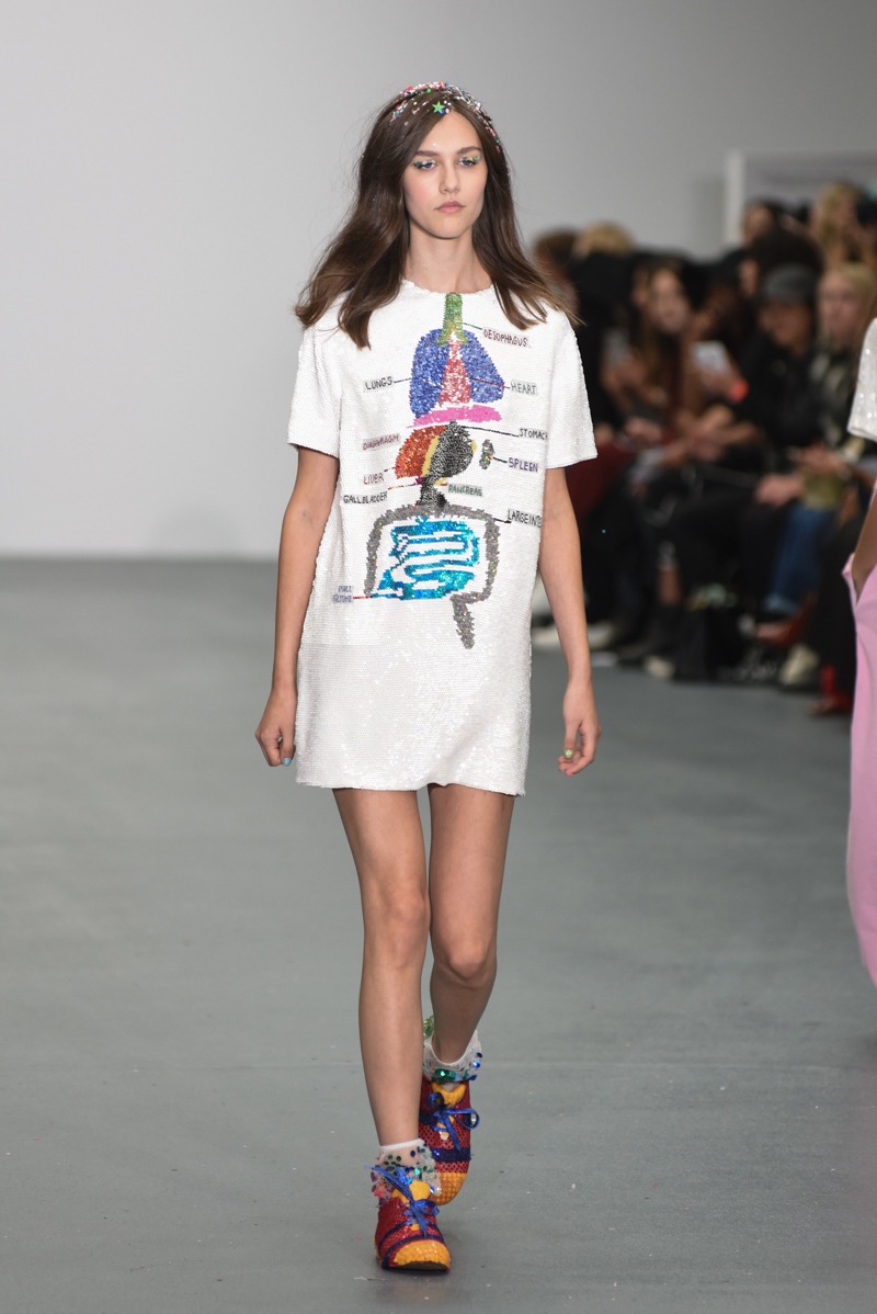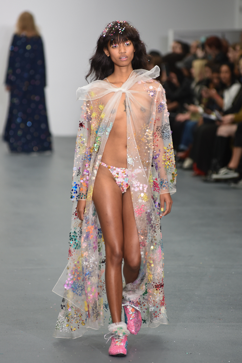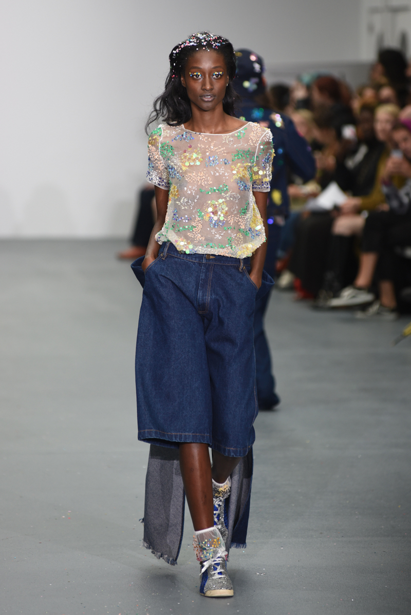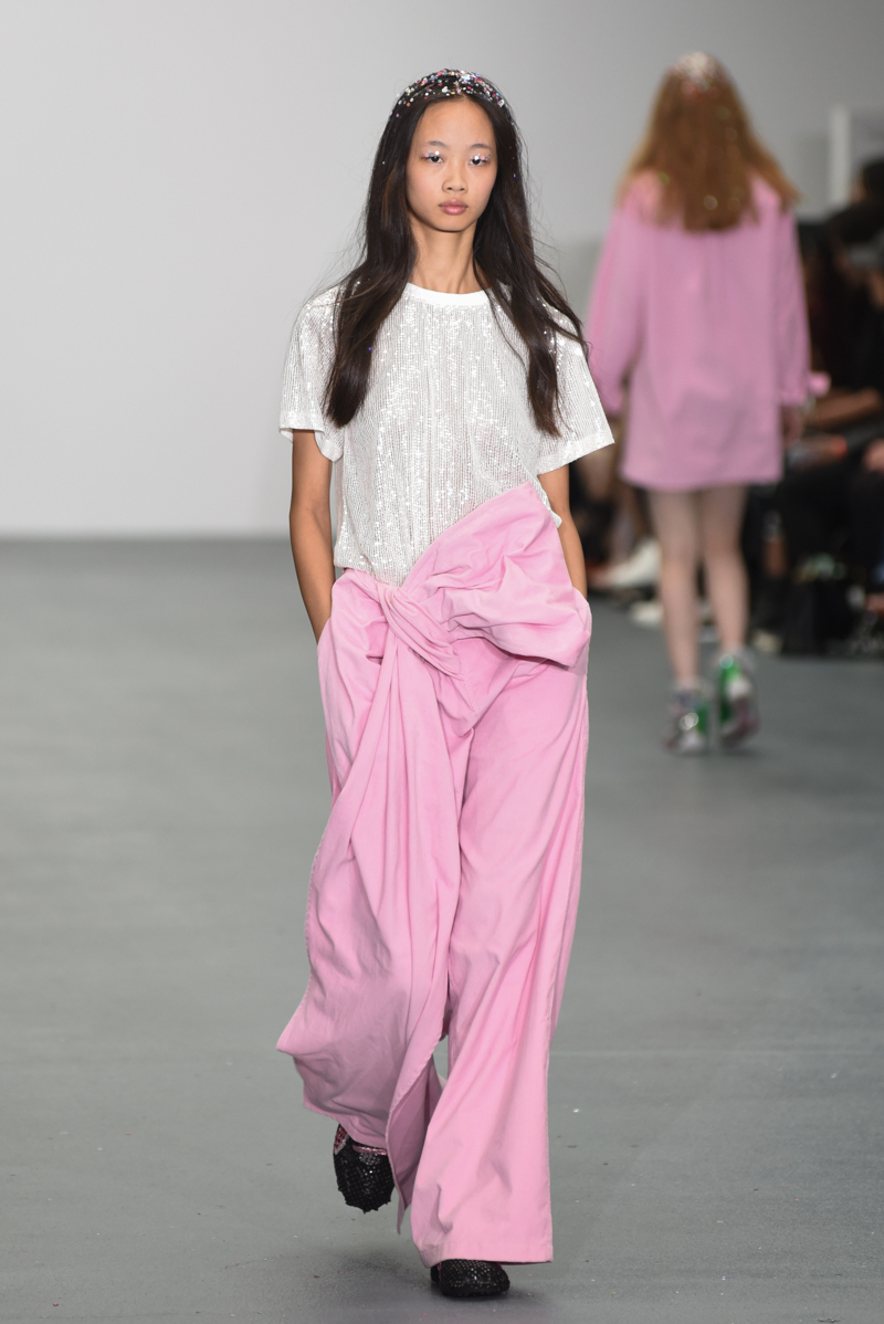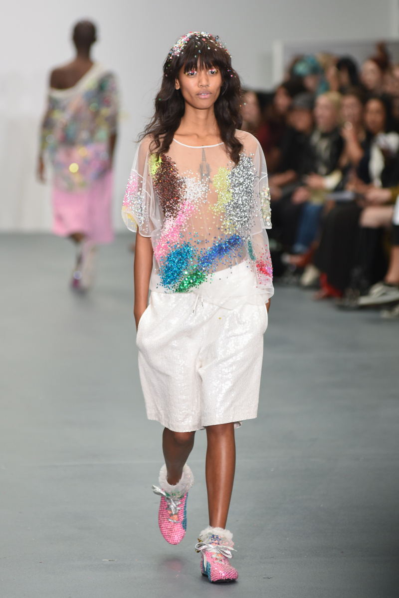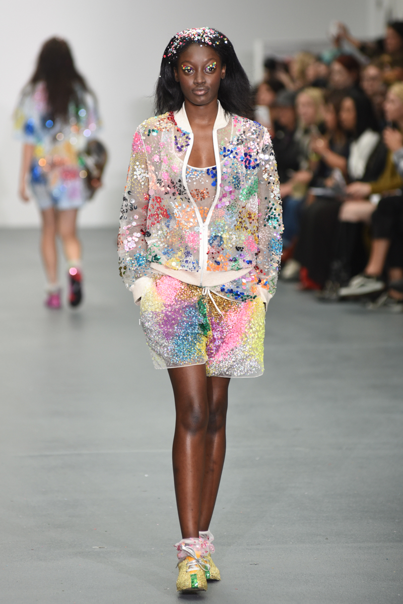 Led by the troop of 90s glitter fairies on skateboards, models appeared sporting white tulle puffed prom dresses patched with rainbow beads, gigantic ruffles, fully glitter encrusted joggers and hotpants, oversized denim bombers and tennis shorts fraying at the seams, glitter trainers and handfuls of sequins were strewn in hair. There was a distinct devil-may-care attitude with ‘Shut your mouth’ repeated as though hand-written on a school chalk board, over slogan jumpers and trousers. Double set spaghetti straps on loose silk nightdresses, one strap purposefully hanging down added to this carefree, fun attitude.