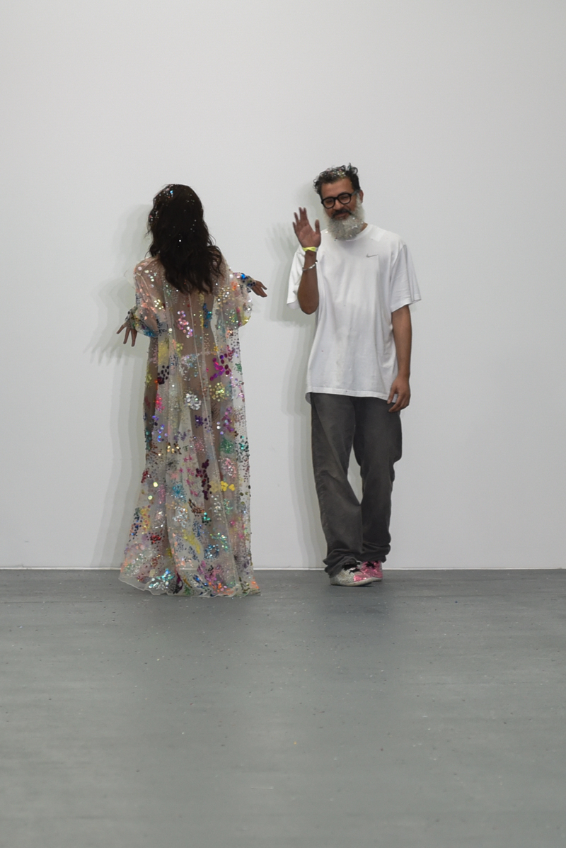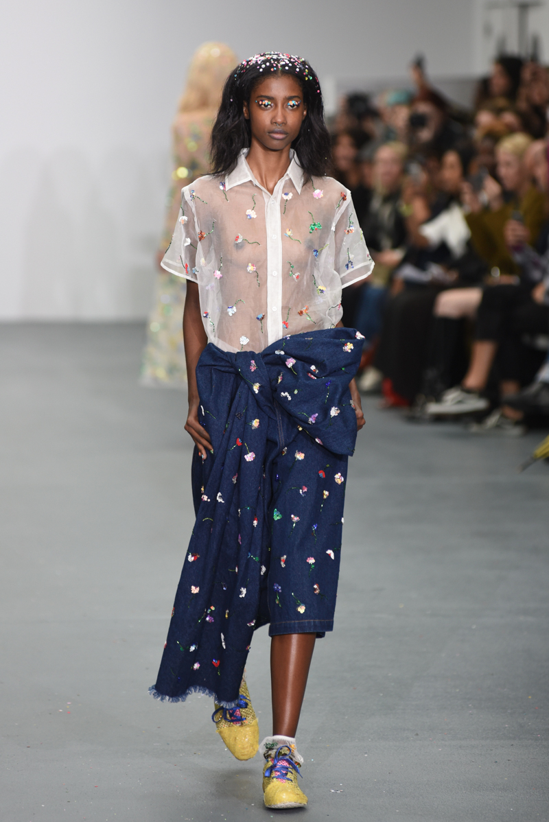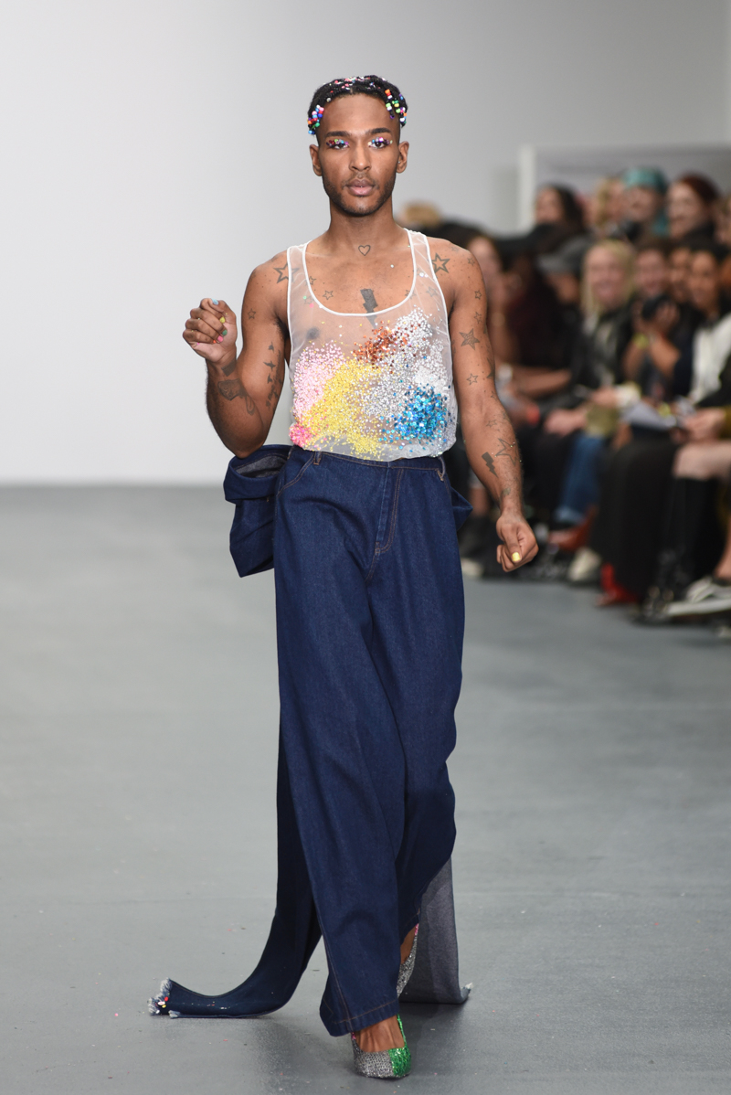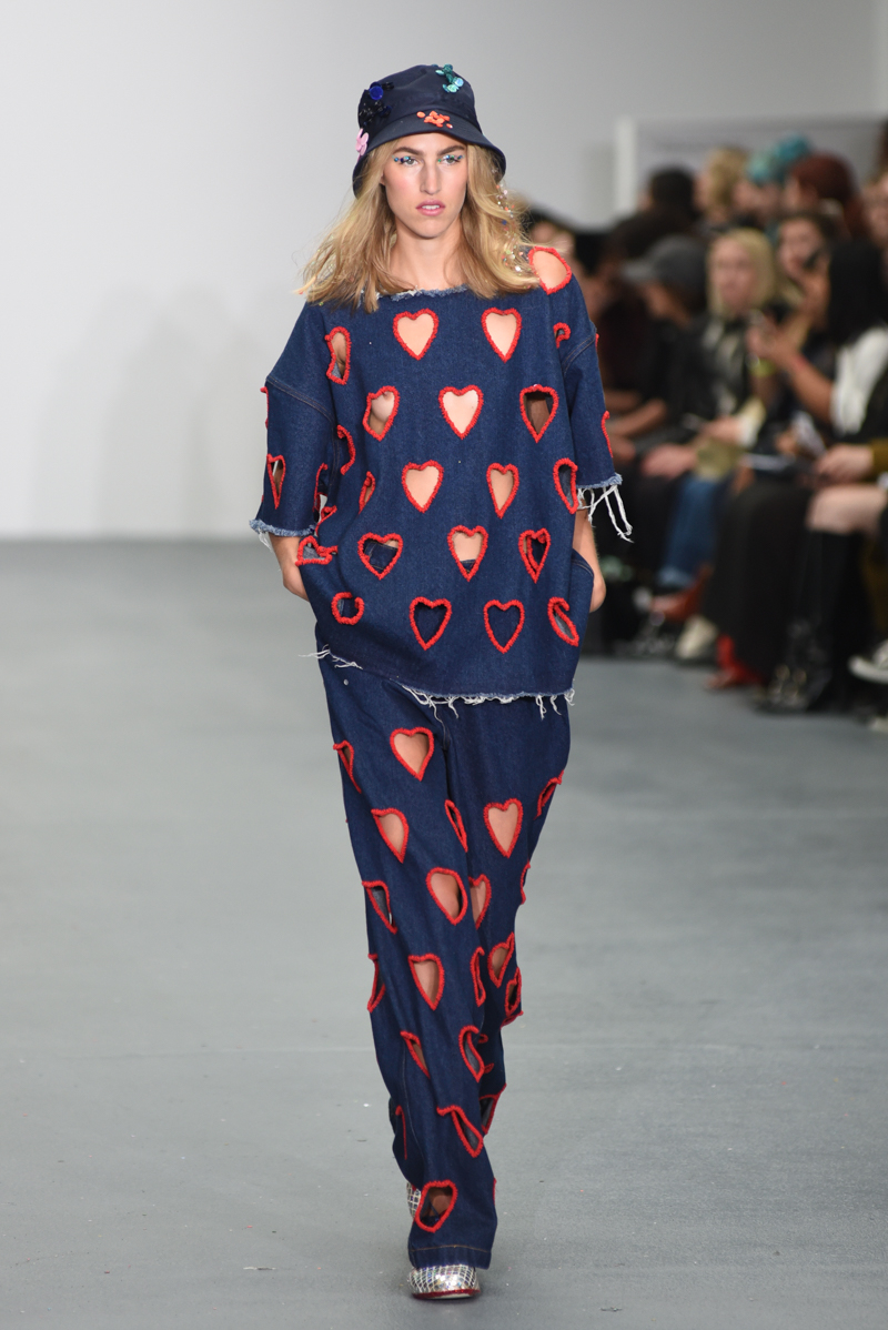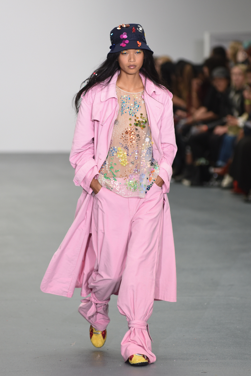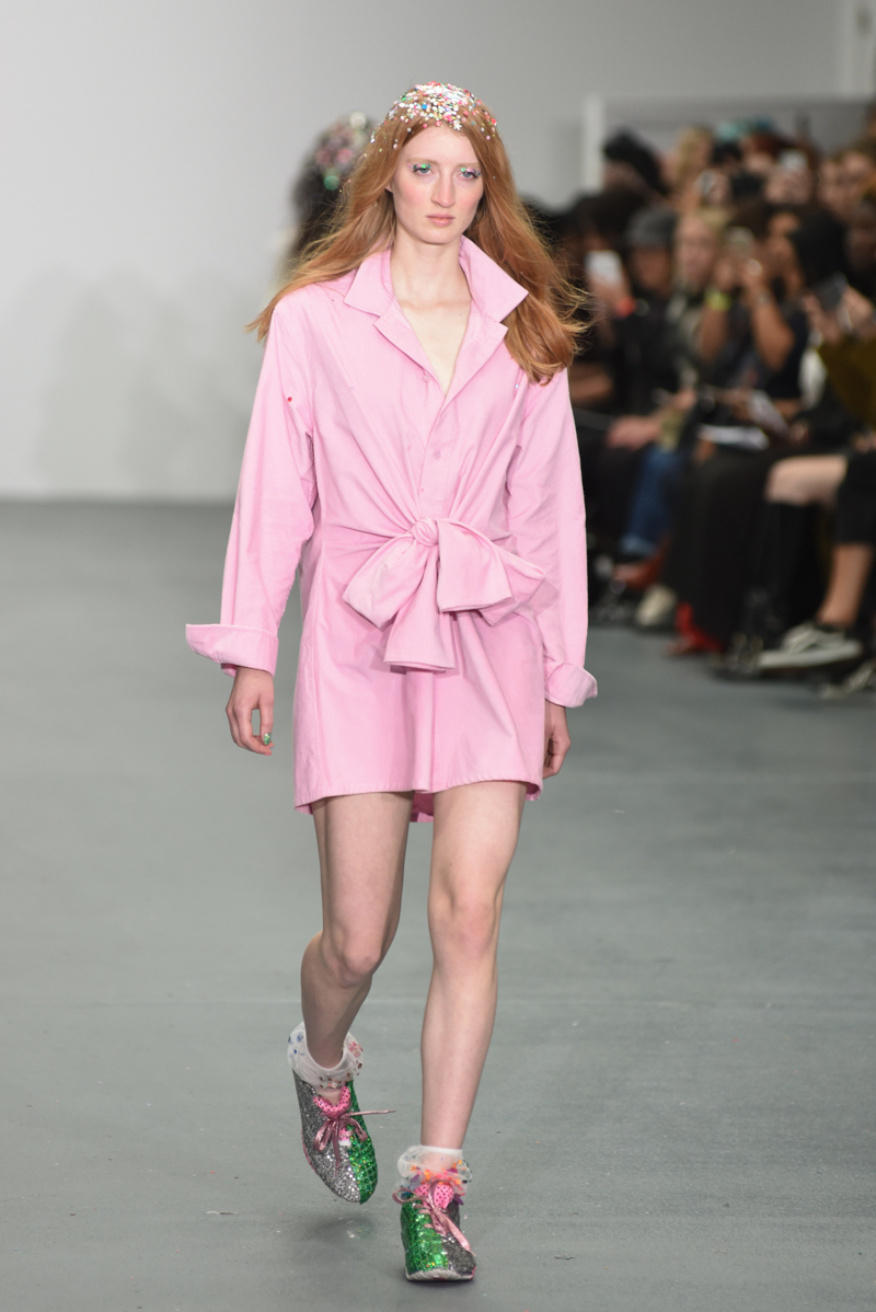 Led by the troop of 90s glitter fairies on skateboards, models appeared sporting white tulle puffed prom dresses patched with rainbow beads, gigantic ruffles, fully glitter encrusted joggers and hotpants, oversized denim bombers and tennis shorts fraying at the seams, glitter trainers and handfuls of sequins were strewn in hair. There was a distinct devil-may-care attitude with ‘Shut your mouth’ repeated as though hand-written on a school chalk board, over slogan jumpers and trousers. Double set spaghetti straps on loose silk nightdresses, one strap purposefully hanging down added to this carefree, fun attitude.