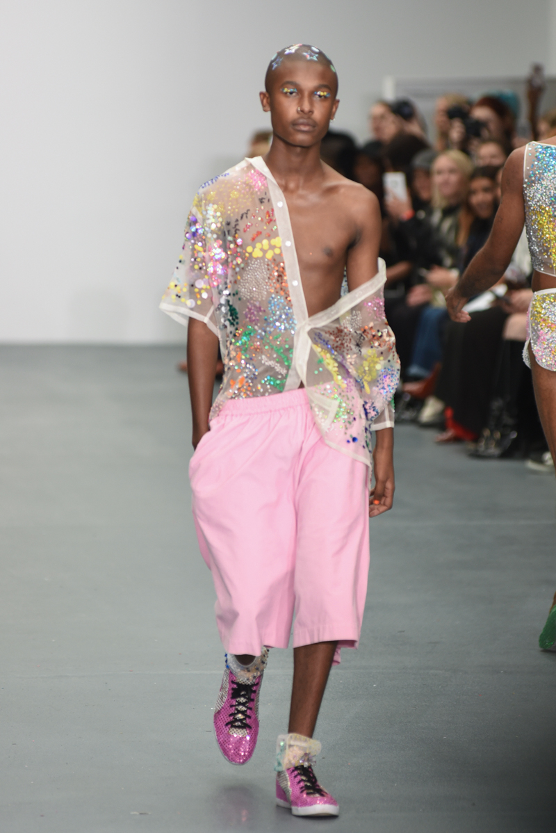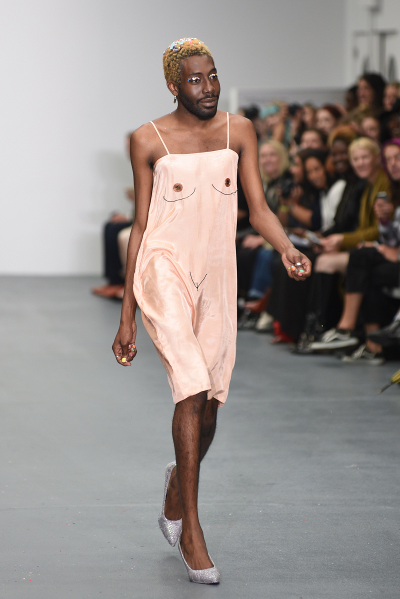 Be-heeled male models held hands whist strutting down the catwalk, later twerking to deafening cheers from the crowd and sending Will Young’s “#menindresses” hashtag berserk with one model wearing Ashish’s nude woman motif slip dress.
