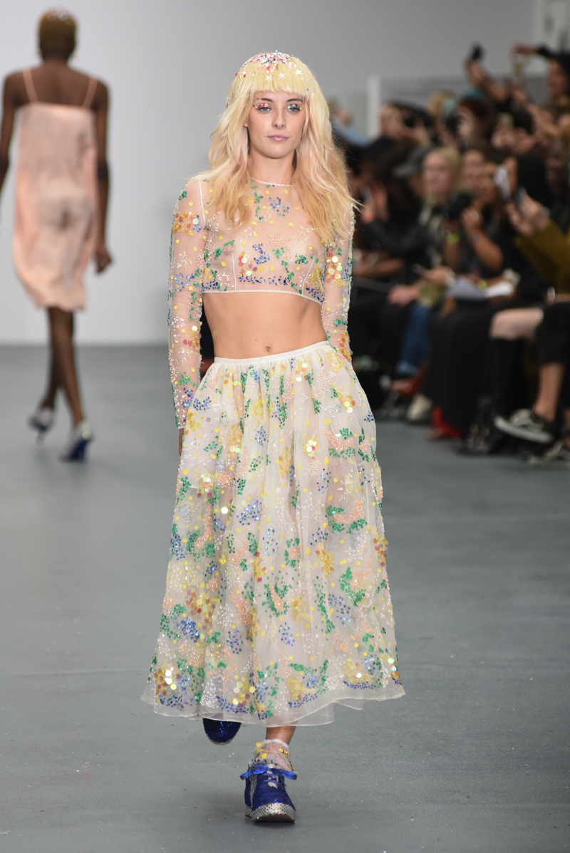 Rainbow coloured disco lights flashed away, illuminating a laudable celebration of kitsch, sparkly, sequin adorned models at Ashish, which was met by euphoric whoops of glee from the packed throng of a usually oh-so-conservative fashion crowd. Ashish delighted from the outset with kids’ glitter stars and sequins, kids rolling down the catwalk on skateboards, big kids whooping in the audience – the show was so rapturously received that it made you wish all catwalk shows could be like one big children’s party!