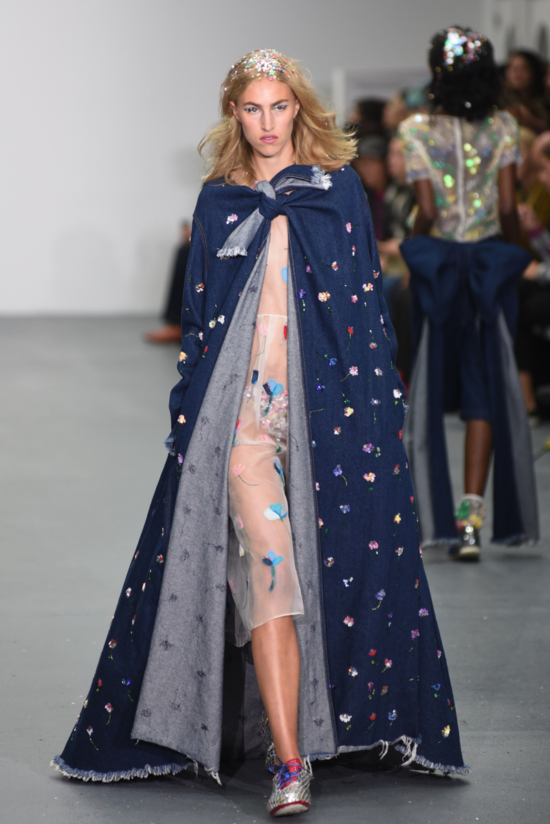 Rapper M.I.A, presenter Billie JD Porter, and upcoming girl band M.O watched Asish’s iridescent vision for Spring/Summer 2016 from the front row, presumably getting covered in the sequins thrown over the audience by the models. Dark denim dresses and were emblazoned with red hearts, laser cut and outlined in red cord, flamenco dancer frills excited in translucent organza, gigantic bows featured on casual pink shirting and denim co-ords, merging with Indian sashes and tulle capes covered in intricately beaded flowers.