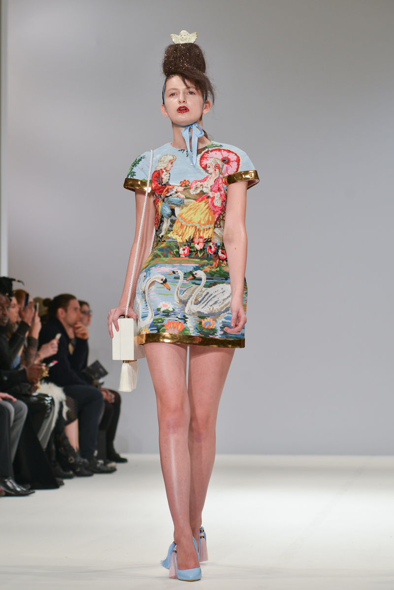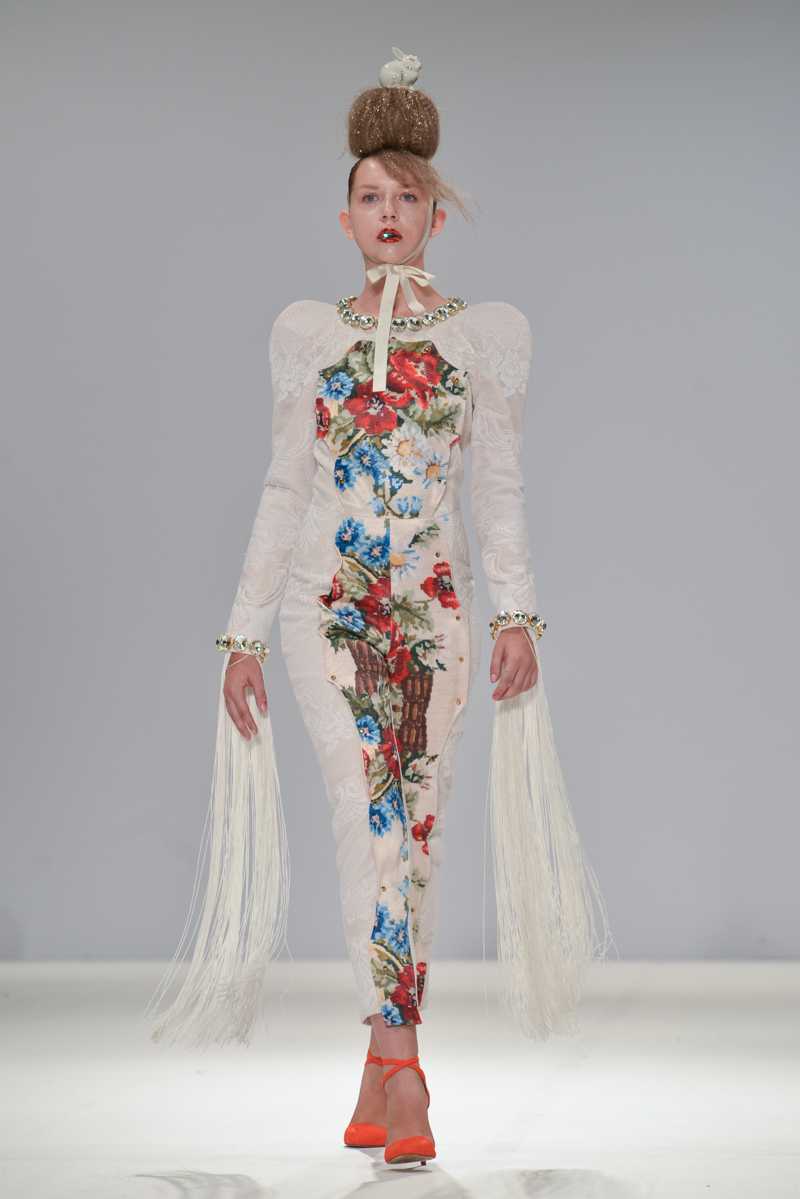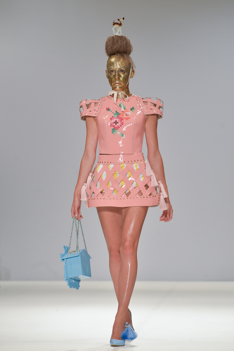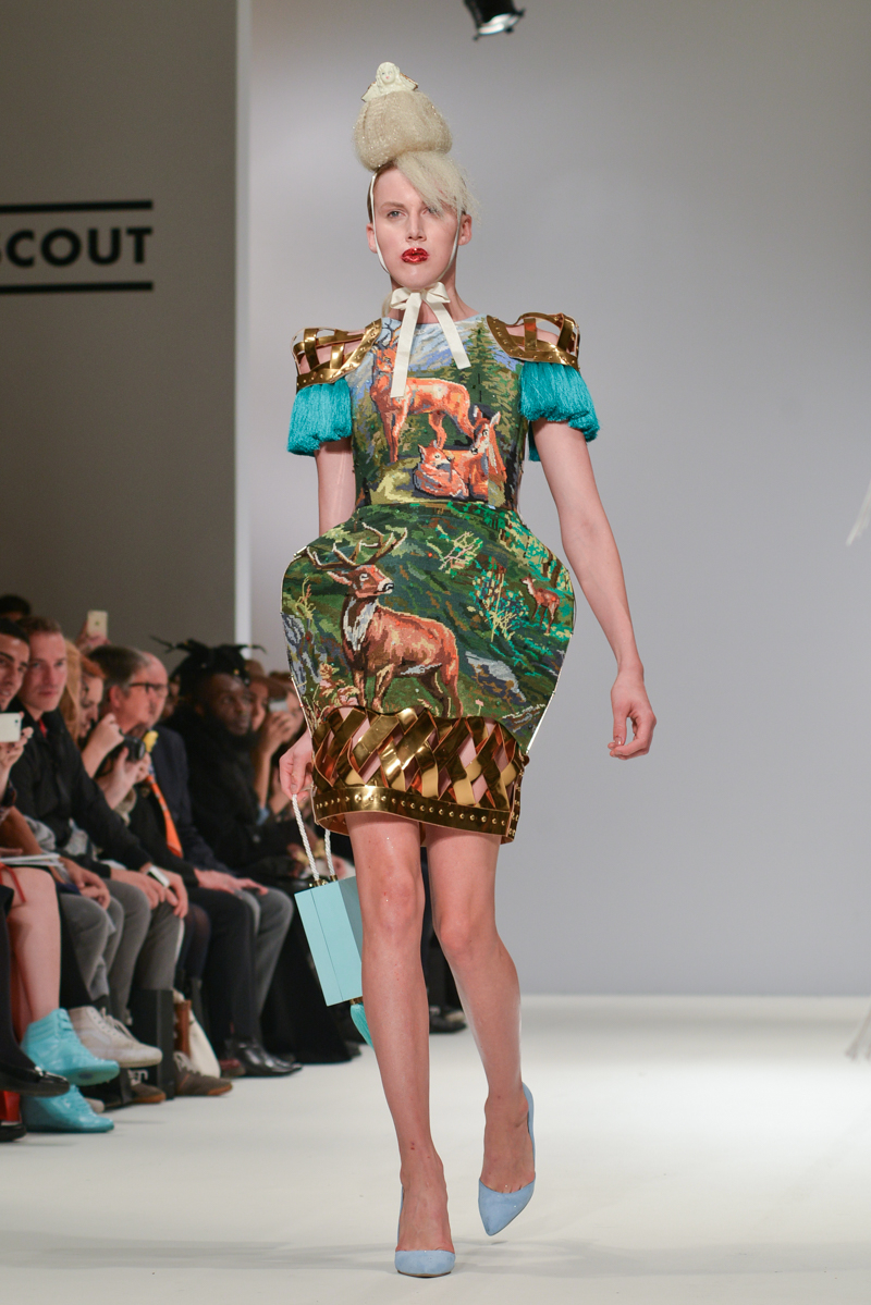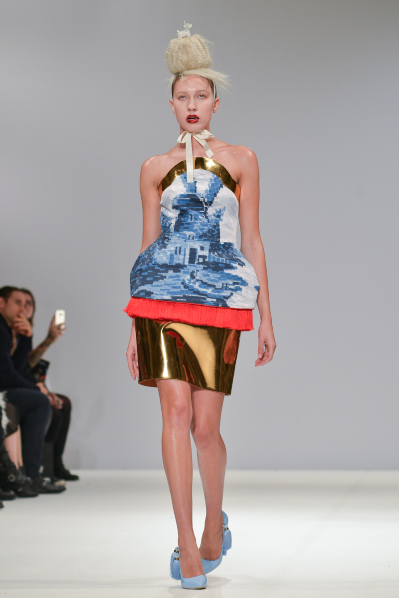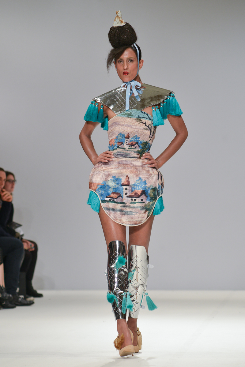 First onto the catwalk, Ana Ljubinkovic showed fantastical Alice-in-Wonderland meets naturalistic tapestries of swans, windmills, deer and kittens, tassels adorning sculptural dresses, forming extended curved shoulders and magnified hourglass hips. Gold glittered faces and necks, and delicate Tower of Pisa-esque buns jauntily clung to models heads, each topped with a china figurine of a dog. LED gum shields flashed in models’ mouths and pink and gold-foiled leathers framed the body with cage-like structures. It was a collection of over-the-top fabulousness in sky-high blue heels for the doll with ‘tude.