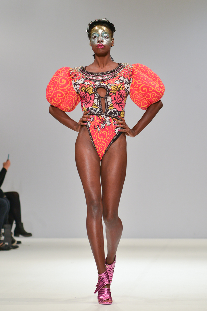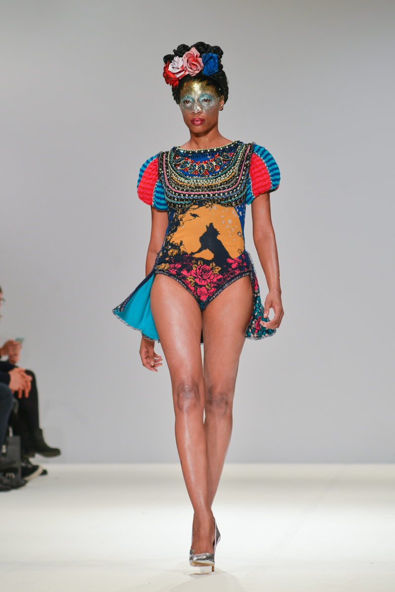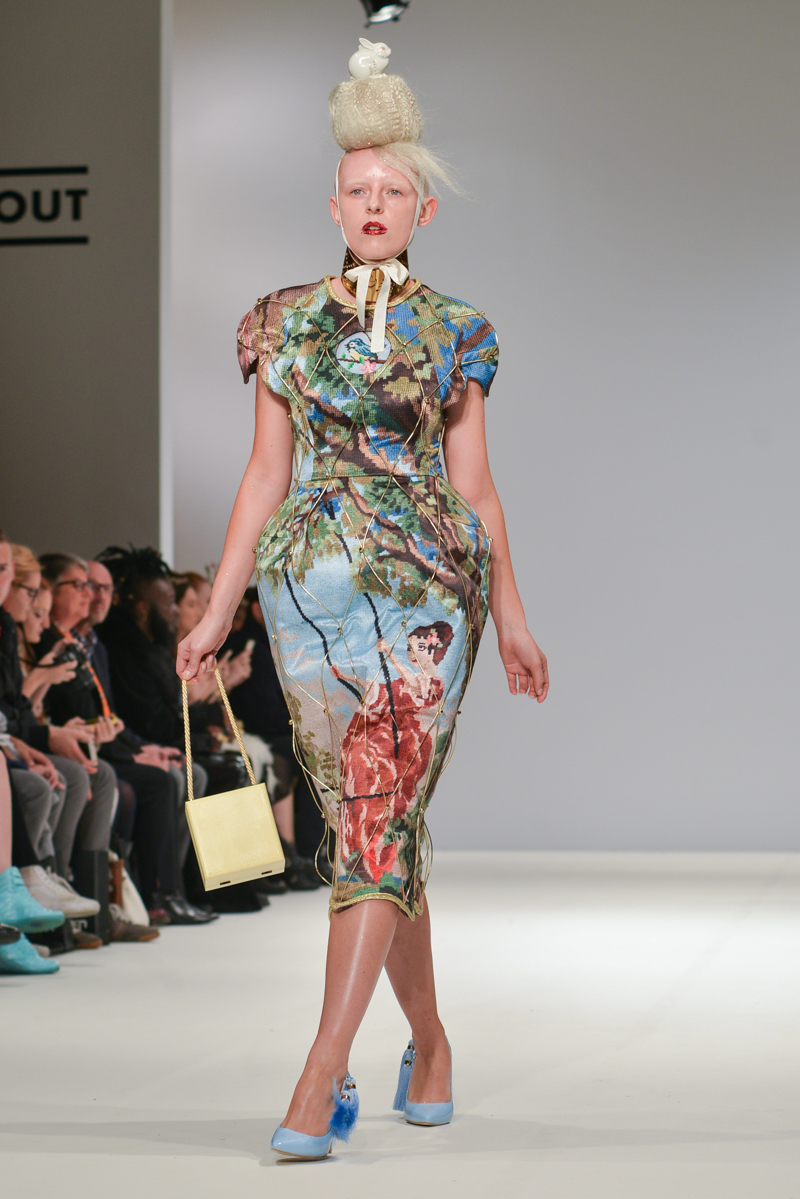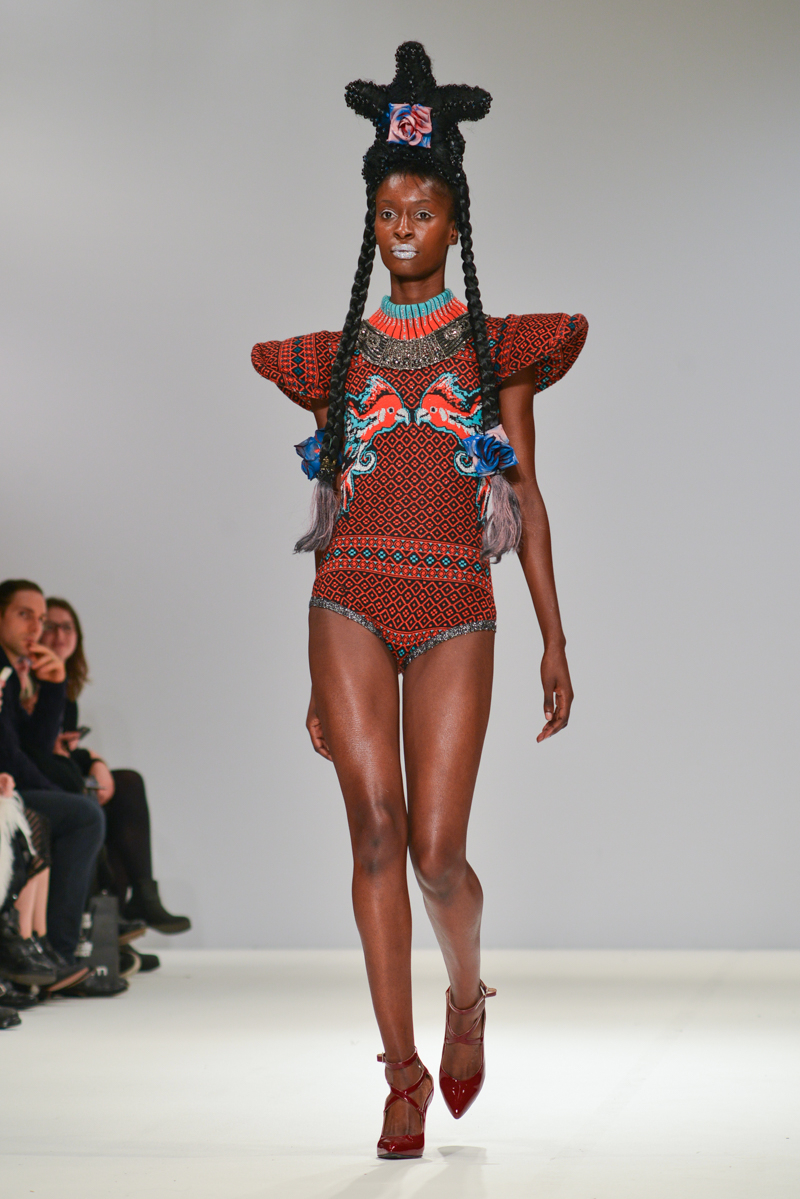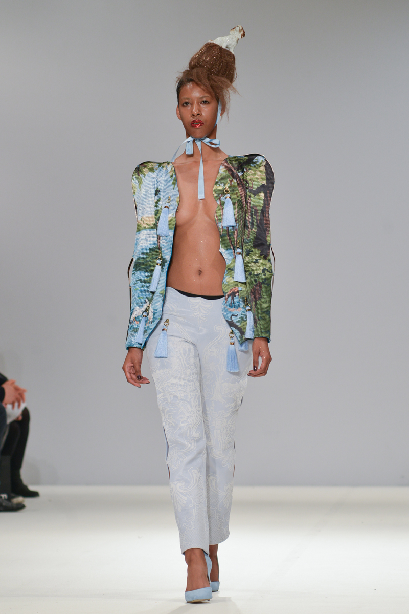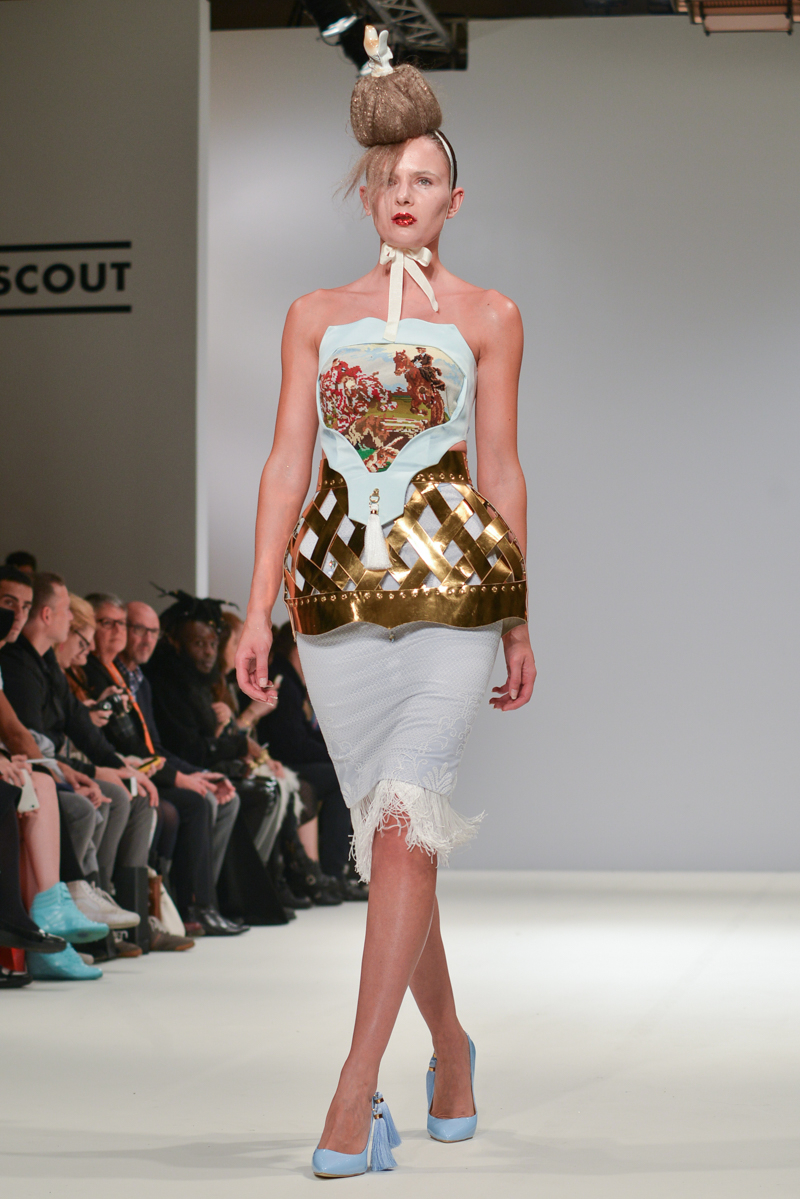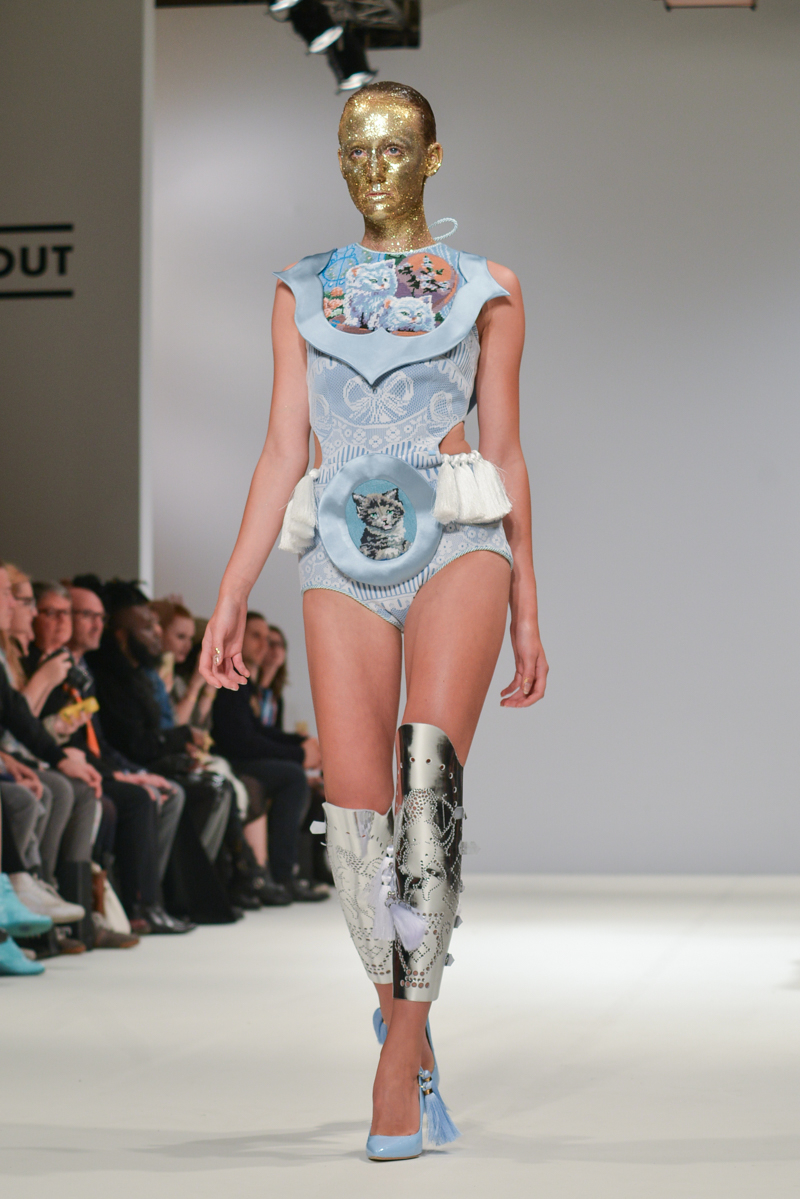 First onto the catwalk, Ana Ljubinkovic showed fantastical Alice-in-Wonderland meets naturalistic tapestries of swans, windmills, deer and kittens, tassels adorning sculptural dresses, forming extended curved shoulders and magnified hourglass hips. Gold glittered faces and necks, and delicate Tower of Pisa-esque buns jauntily clung to models heads, each topped with a china figurine of a dog. LED gum shields flashed in models’ mouths and pink and gold-foiled leathers framed the body with cage-like structures. It was a collection of over-the-top fabulousness in sky-high blue heels for the doll with ‘tude.