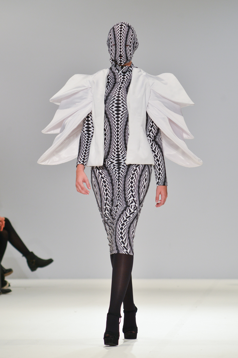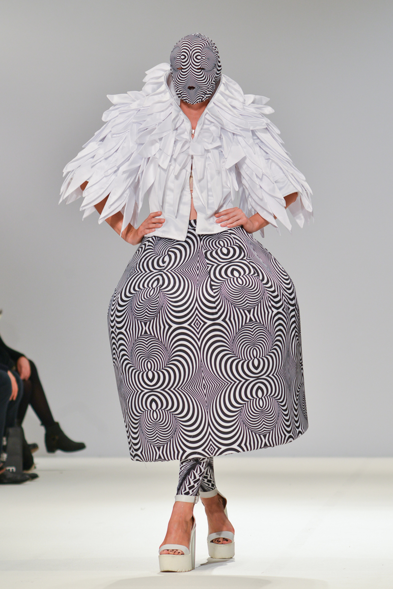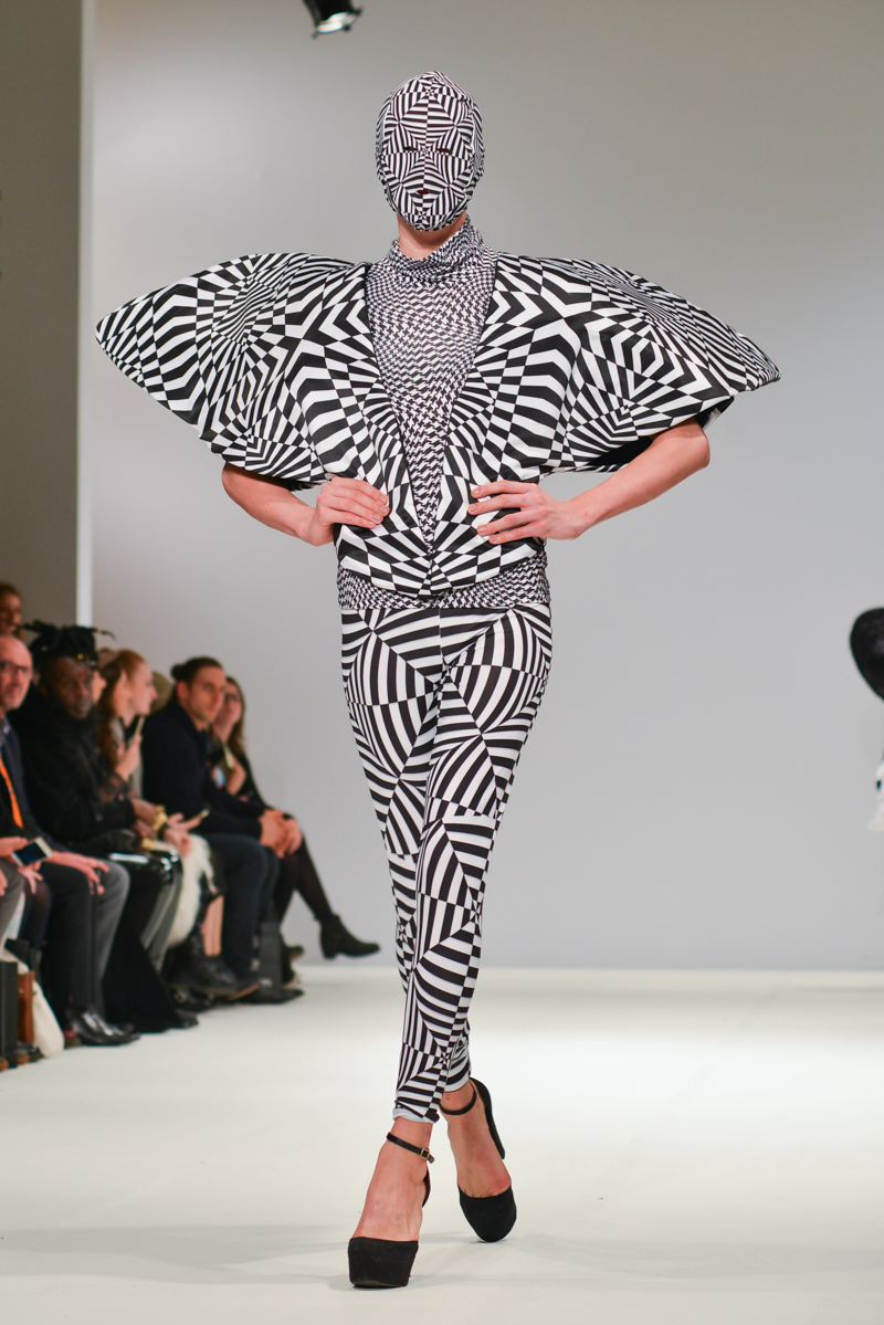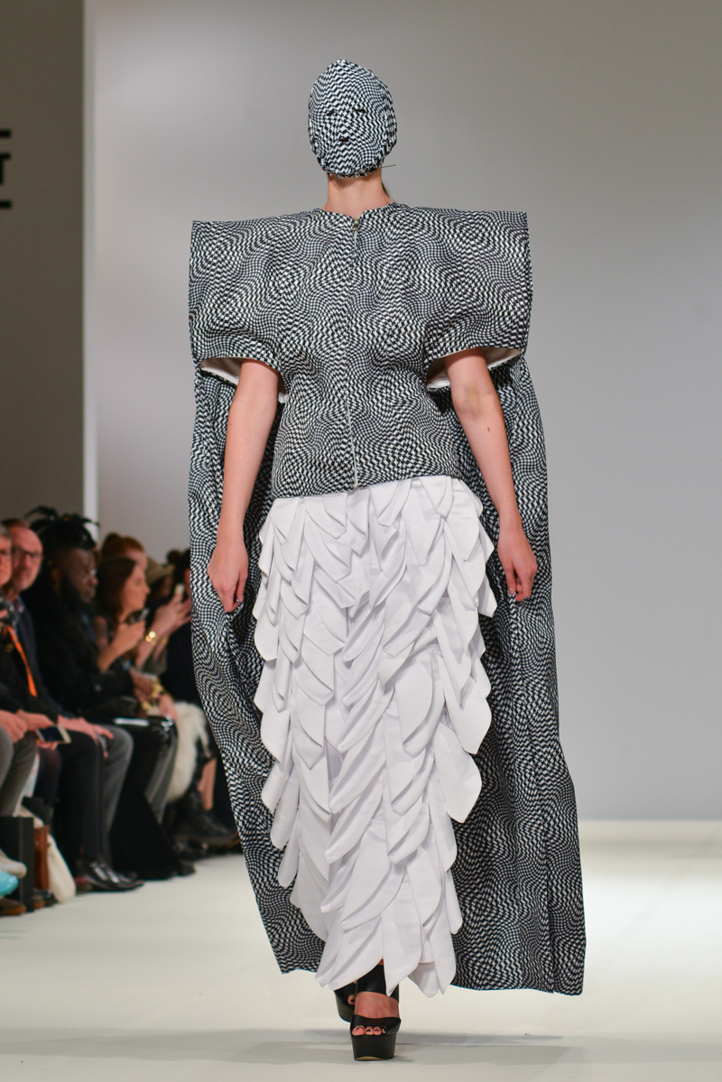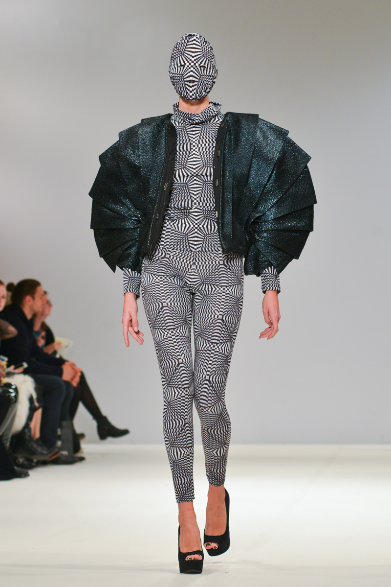 Ivana Pilja showed incredible skill and jaw-dropping structures with her exaggerated leg of mutton sleeves, humungous Victoriana crinolines and early Gareth Pugh-esque cube and aeronautic padded shaping. Faces were covered in kaleidoscopic black and white patterned fabric, continuing onto the forms and accessories such as tights and leggings. This monochromatic body origami added an almost costume feel to the avant-garde designs and having already gathered fans such as Dita Von Teese and Skunk Anansie, this proved an unmissable end to a fantastic show highlighting the artistic talent of these wonderful designers.