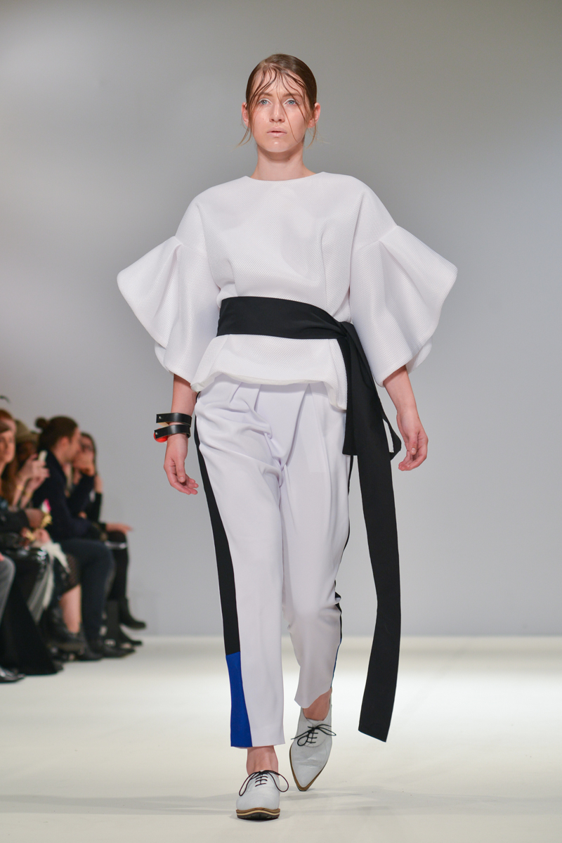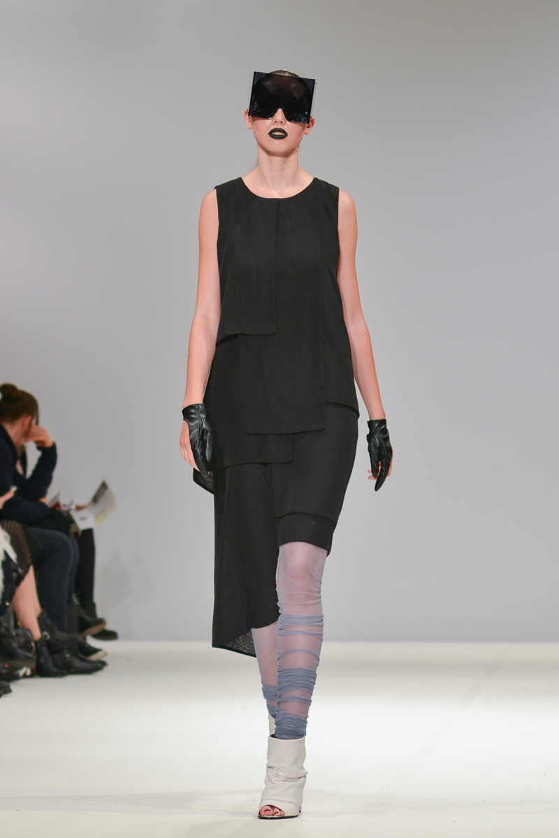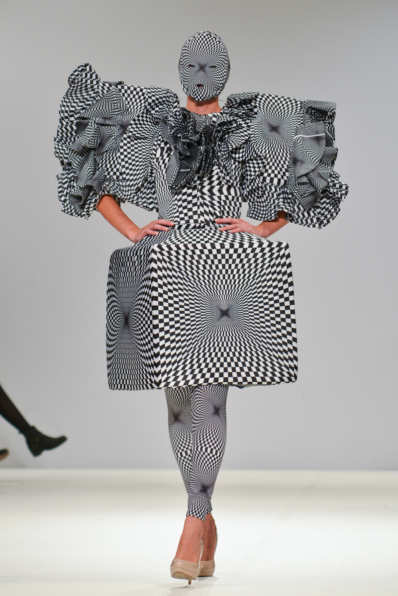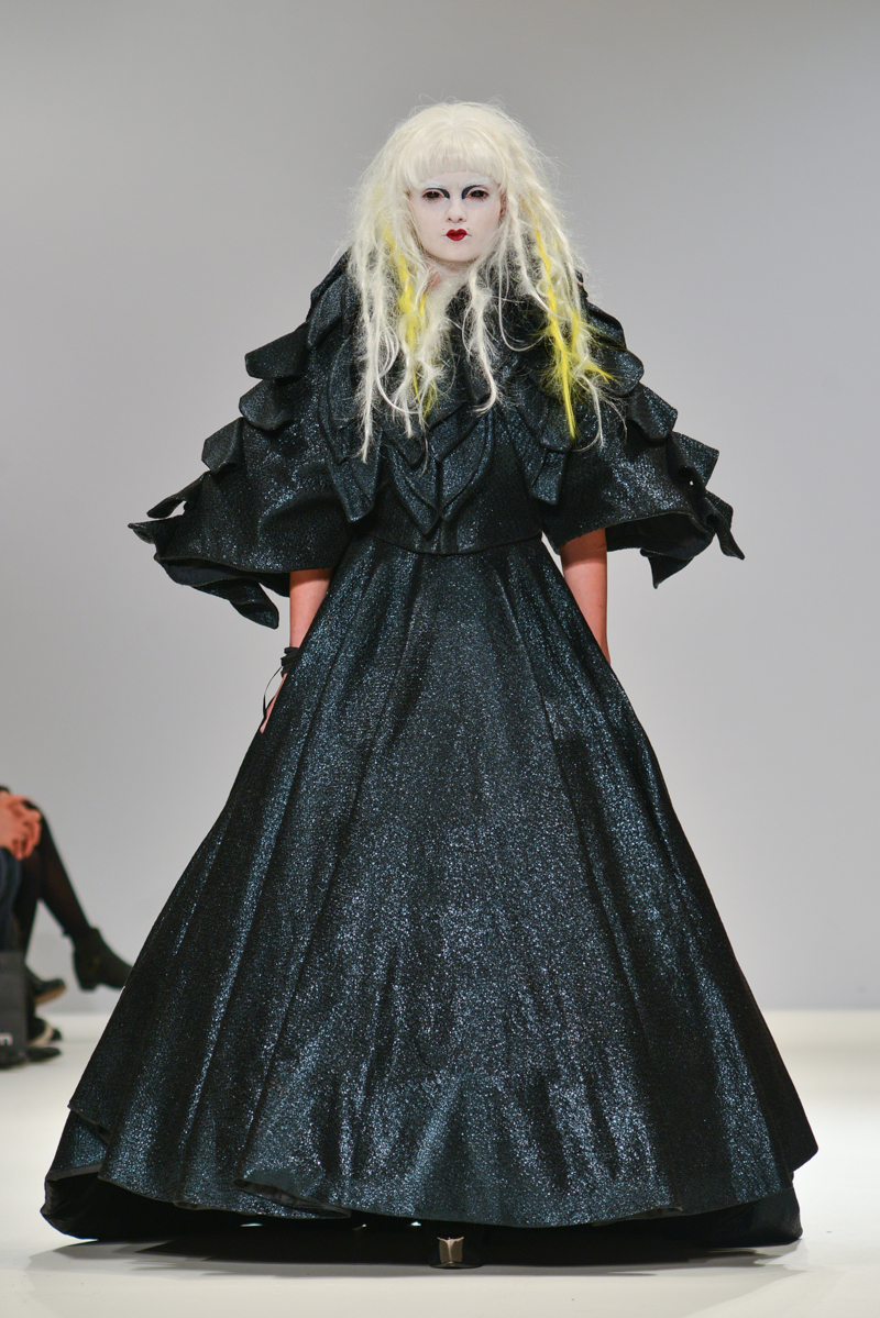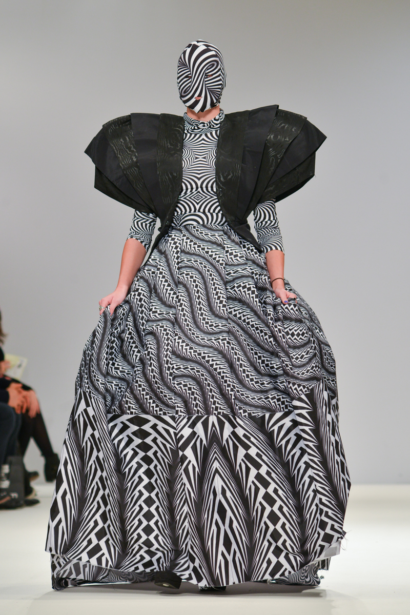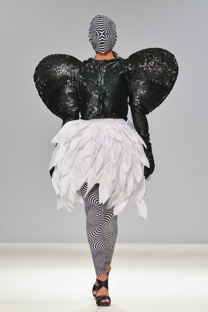 Ivana Pilja showed incredible skill and jaw-dropping structures with her exaggerated leg of mutton sleeves, humungous Victoriana crinolines and early Gareth Pugh-esque cube and aeronautic padded shaping. Faces were covered in kaleidoscopic black and white patterned fabric, continuing onto the forms and accessories such as tights and leggings. This monochromatic body origami added an almost costume feel to the avant-garde designs and having already gathered fans such as Dita Von Teese and Skunk Anansie, this proved an unmissable end to a fantastic show highlighting the artistic talent of these wonderful designers.