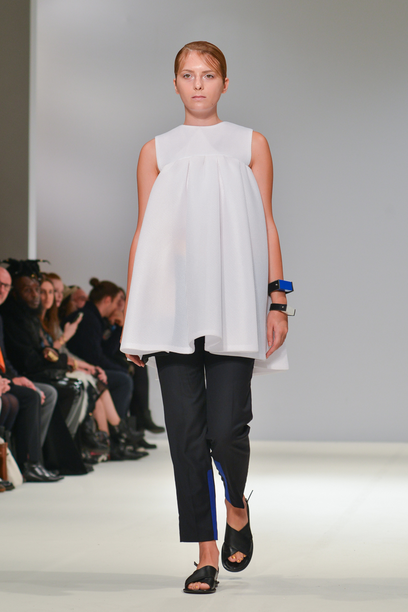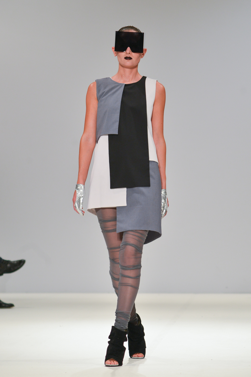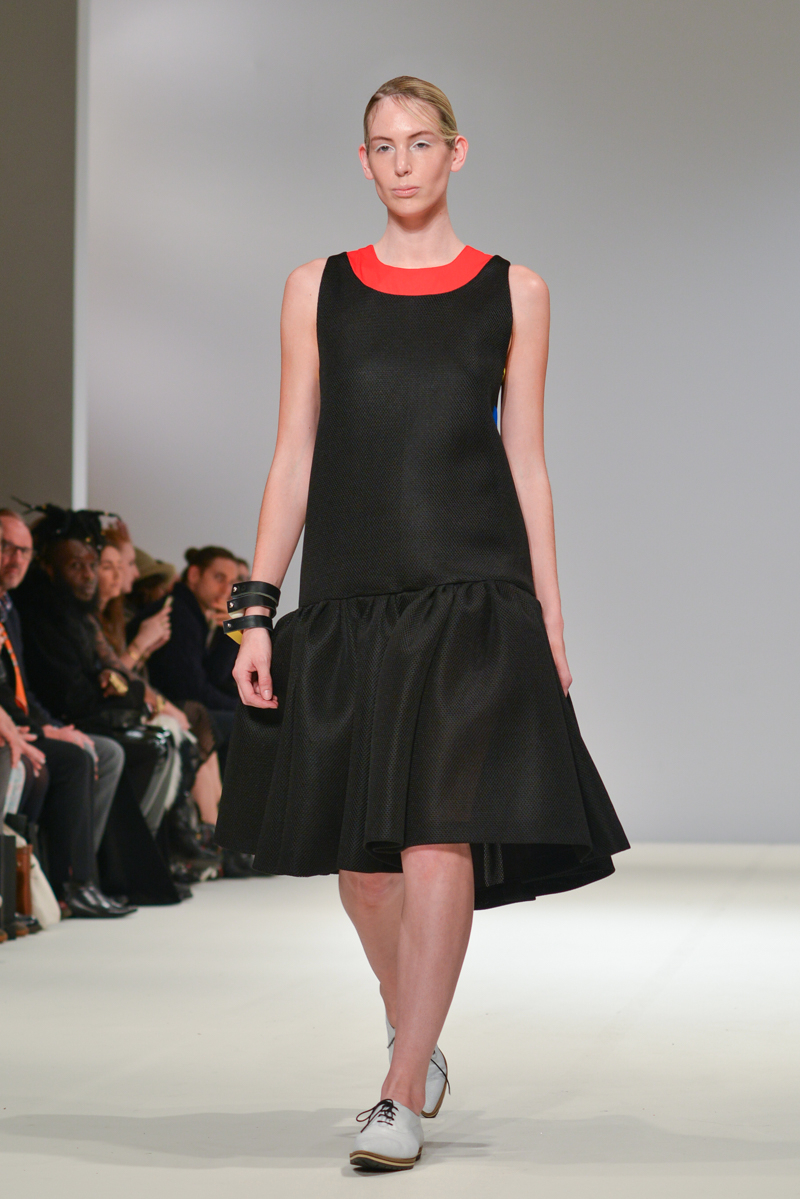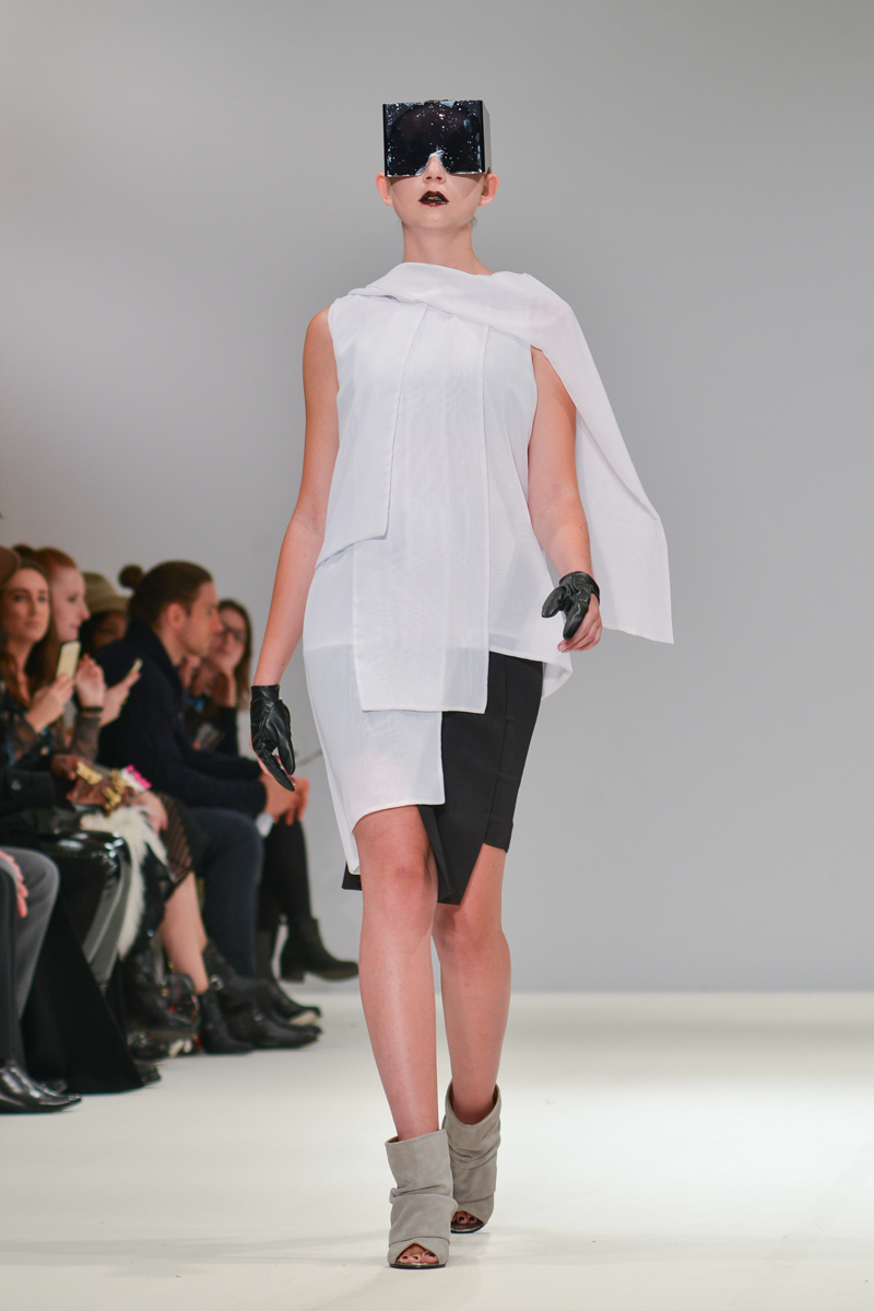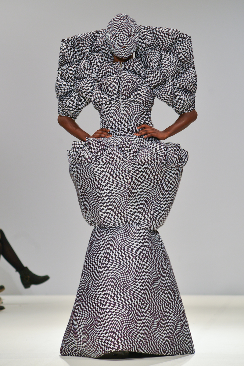 Ivana Pilja showed incredible skill and jaw-dropping structures with her exaggerated leg of mutton sleeves, humungous Victoriana crinolines and early Gareth Pugh-esque cube and aeronautic padded shaping. Faces were covered in kaleidoscopic black and white patterned fabric, continuing onto the forms and accessories such as tights and leggings. This monochromatic body origami added an almost costume feel to the avant-garde designs and having already gathered fans such as Dita Von Teese and Skunk Anansie, this proved an unmissable end to a fantastic show highlighting the artistic talent of these wonderful designers.