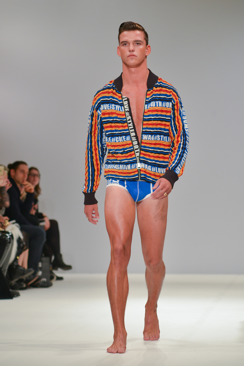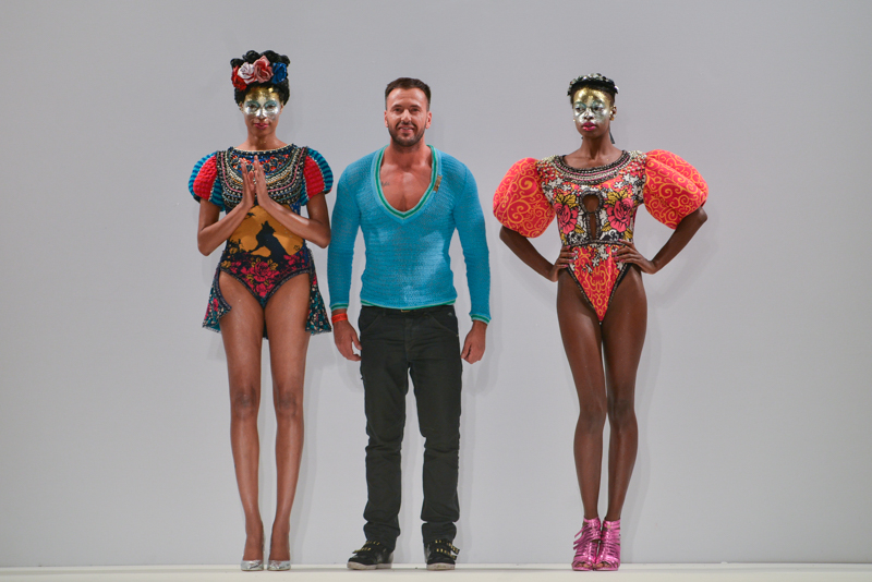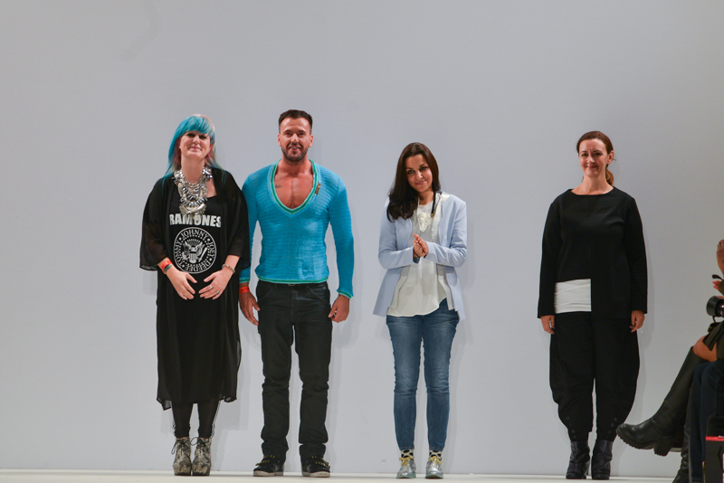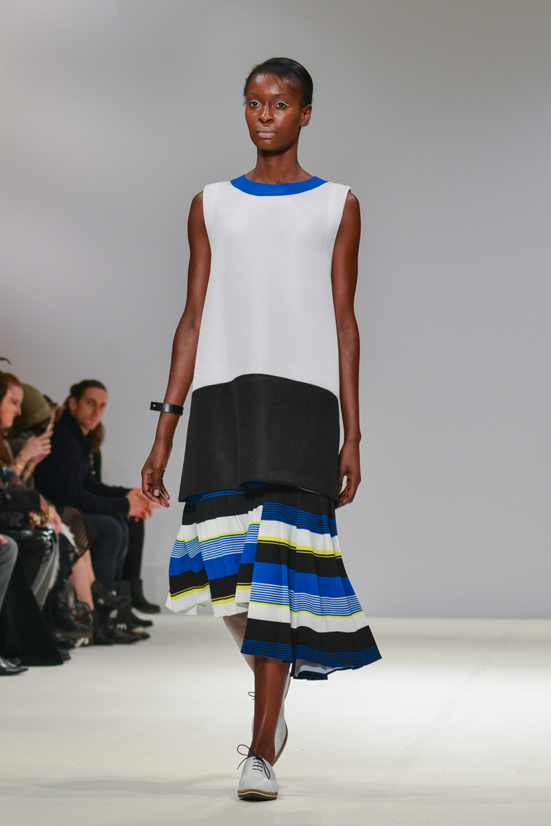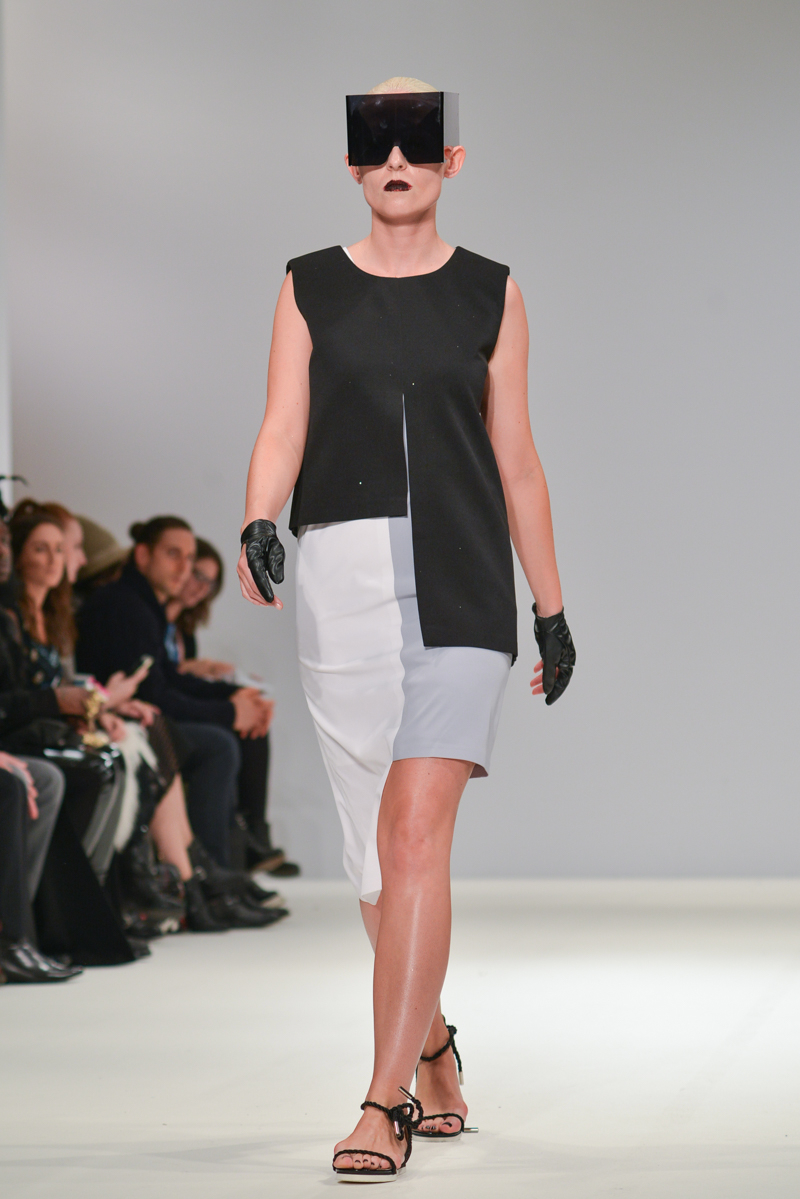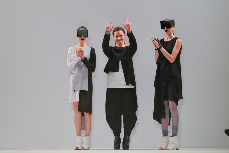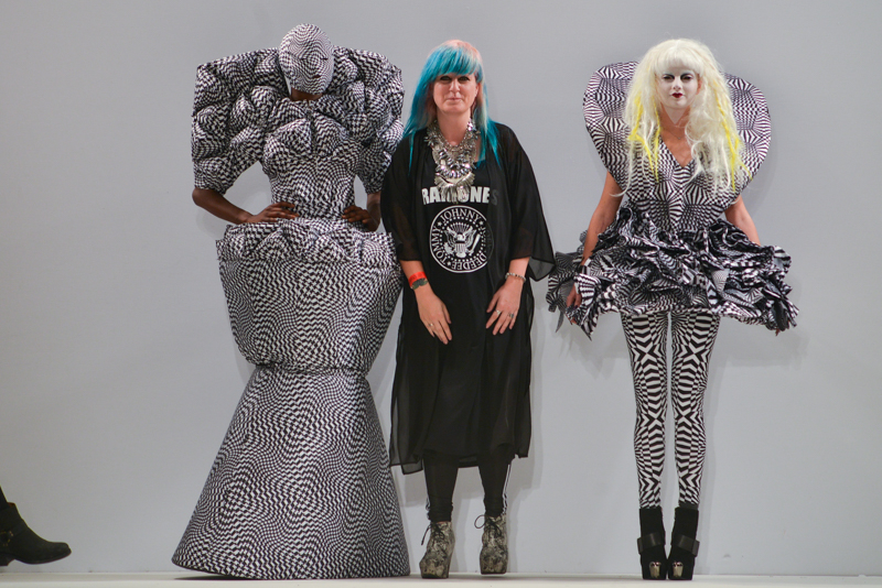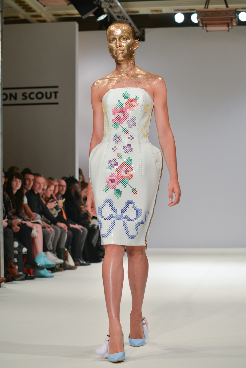 Ivana Pilja showed incredible skill and jaw-dropping structures with her exaggerated leg of mutton sleeves, humungous Victoriana crinolines and early Gareth Pugh-esque cube and aeronautic padded shaping. Faces were covered in kaleidoscopic black and white patterned fabric, continuing onto the forms and accessories such as tights and leggings. This monochromatic body origami added an almost costume feel to the avant-garde designs and having already gathered fans such as Dita Von Teese and Skunk Anansie, this proved an unmissable end to a fantastic show highlighting the artistic talent of these wonderful designers.