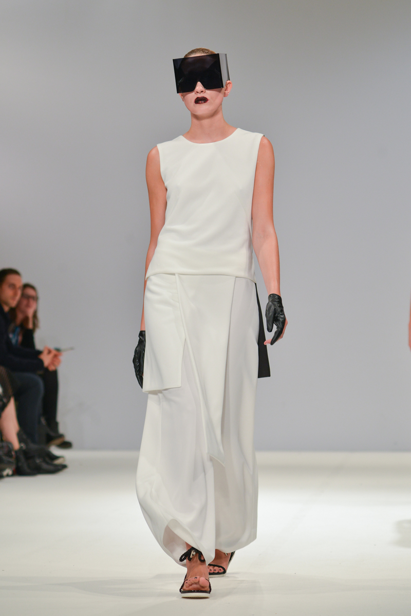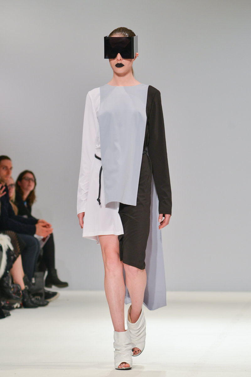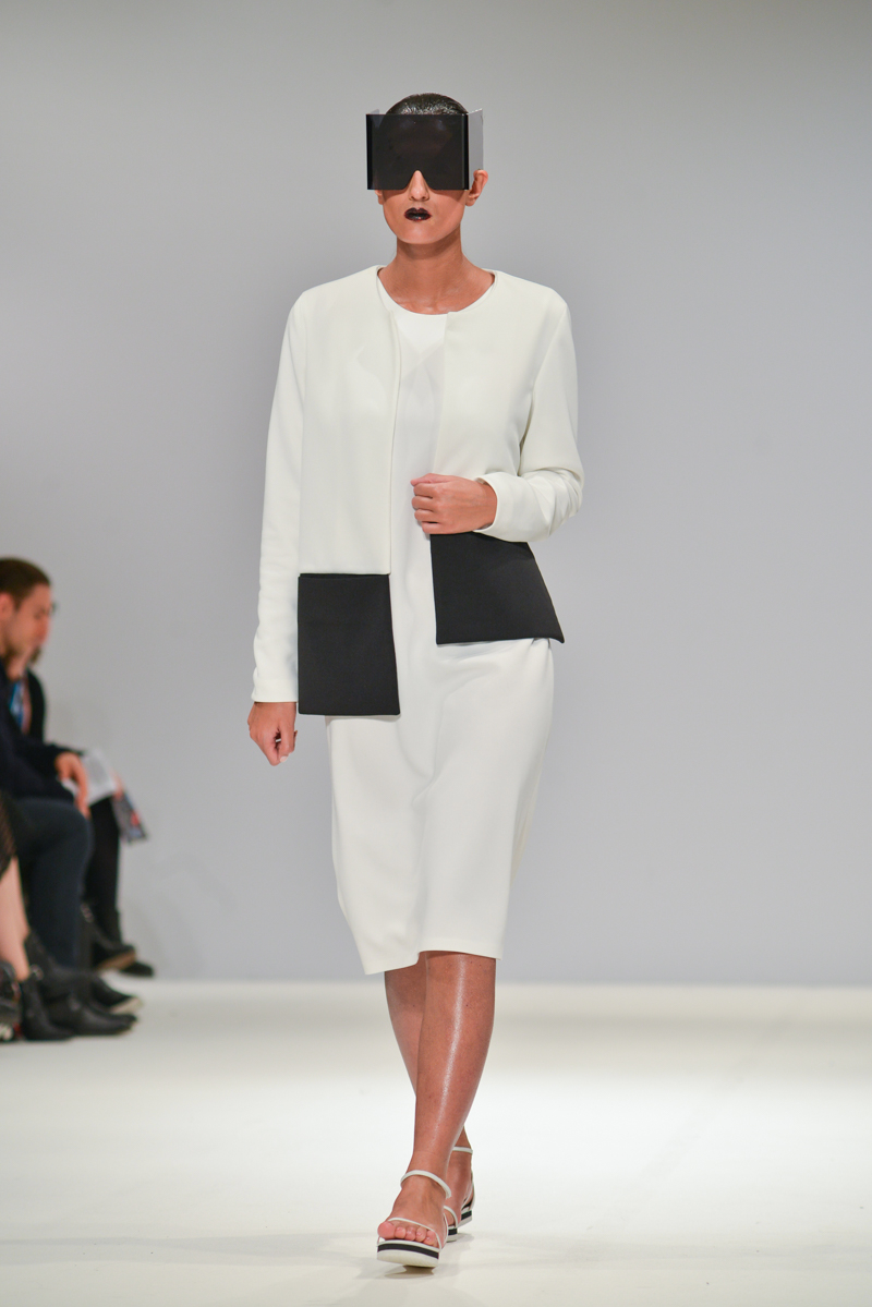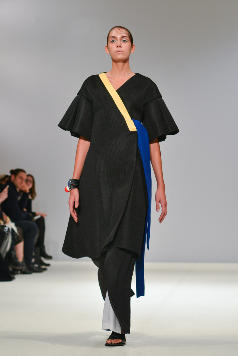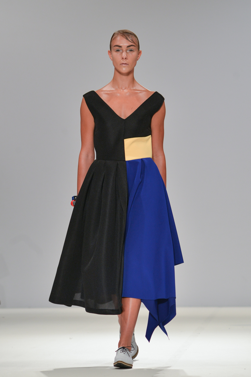 Budislava Kekovic‘s space sirens marched along with perspex acrylic box sunglasses. These architectural aliens walked to intergalactic Martian music with fittingly out of sync pockets and linear mismatched textures, draped in layers on dresses. Geometric architecture, simple linear forms and Japanese culture were all cited as inspiration for Kekovic, in the show notes however to me it was the extra-terrestrial that provided the key to Spring/Summer 2016 at Budislava.
