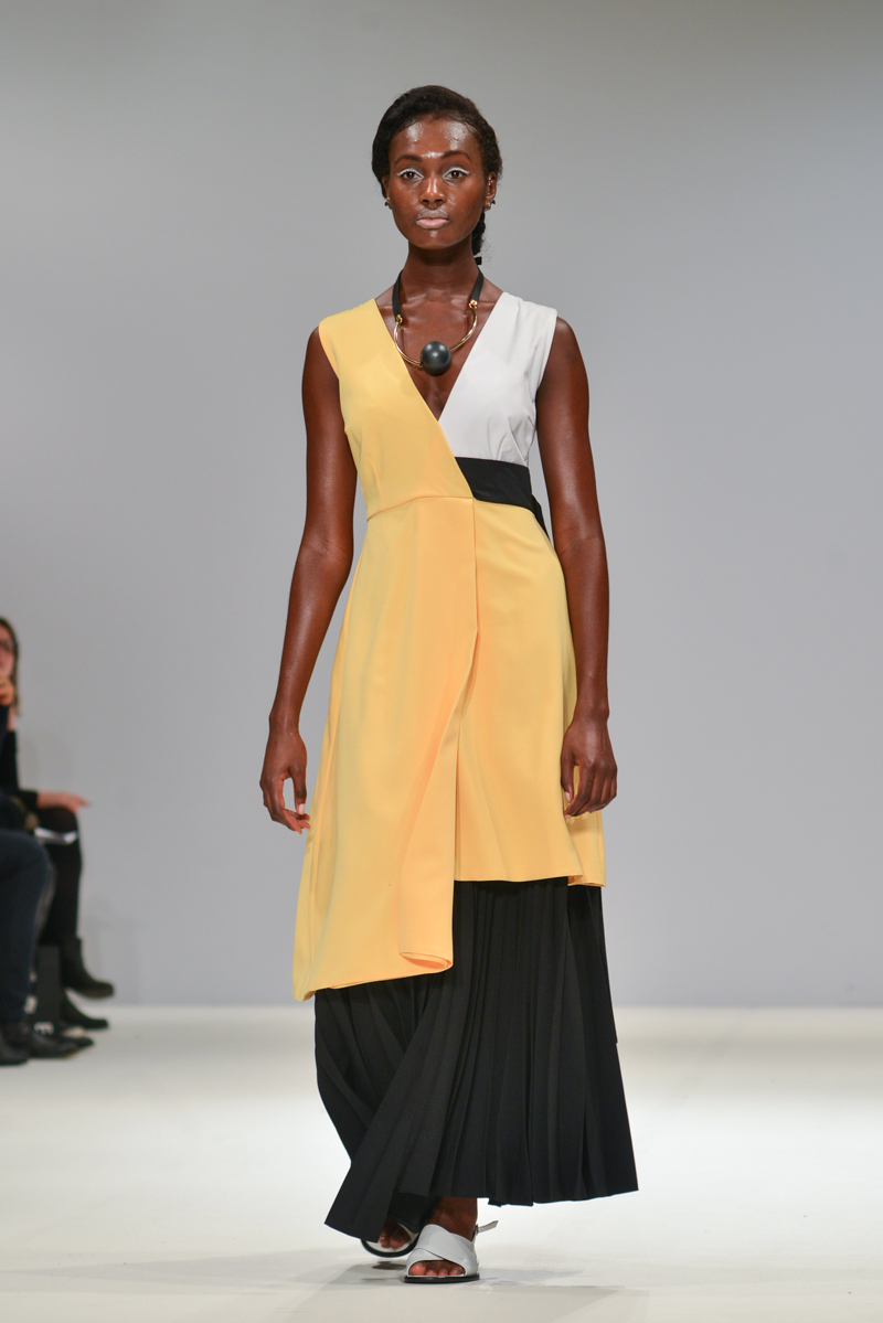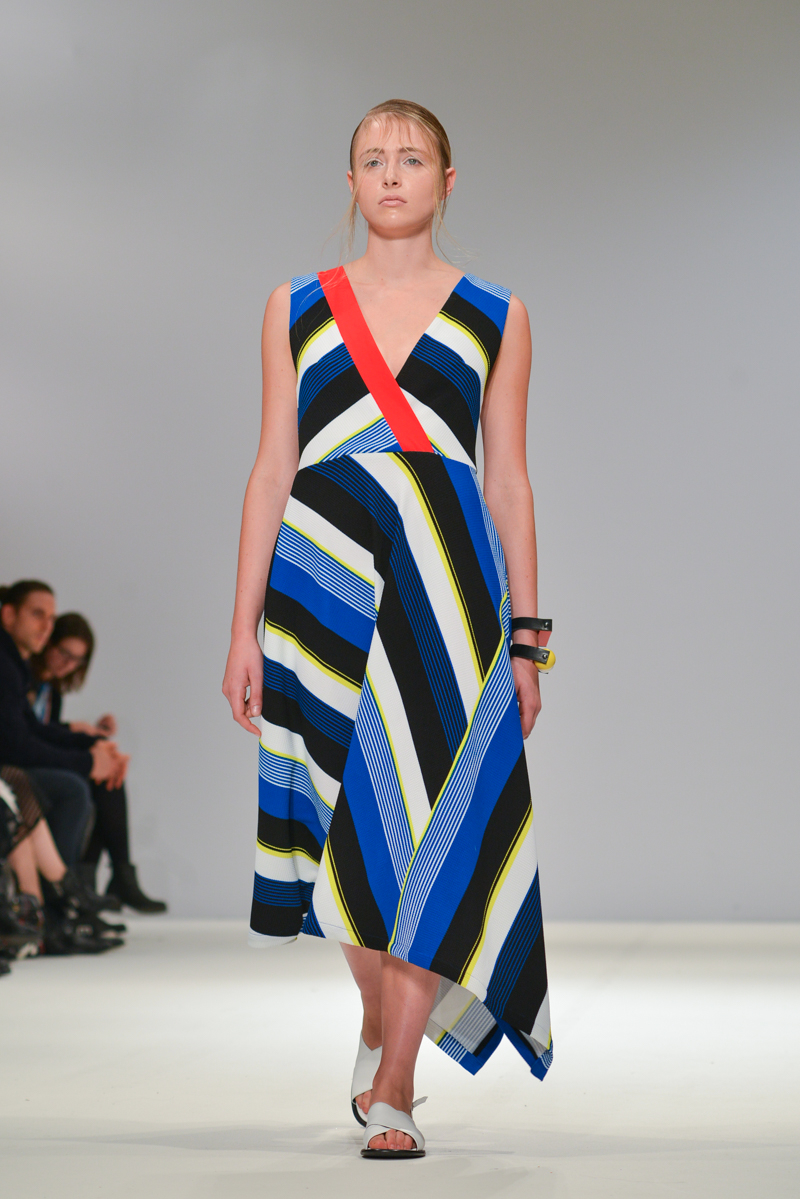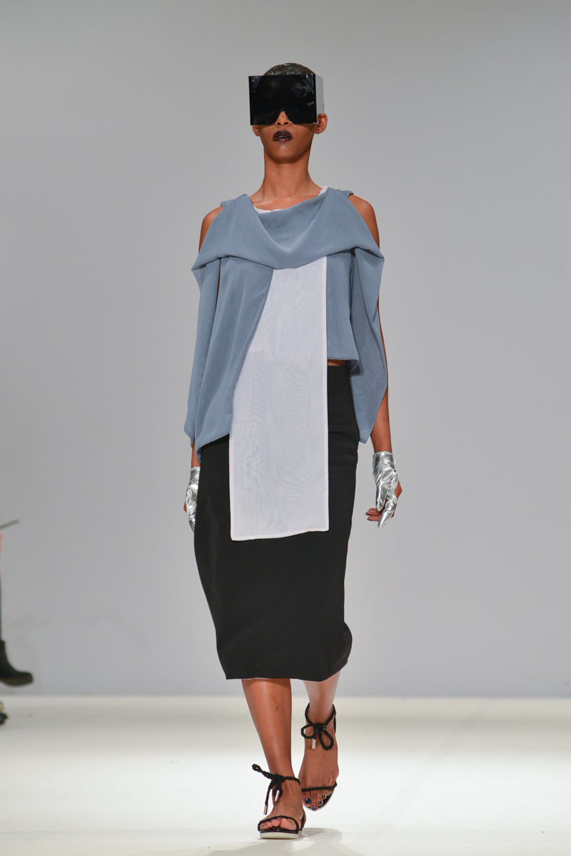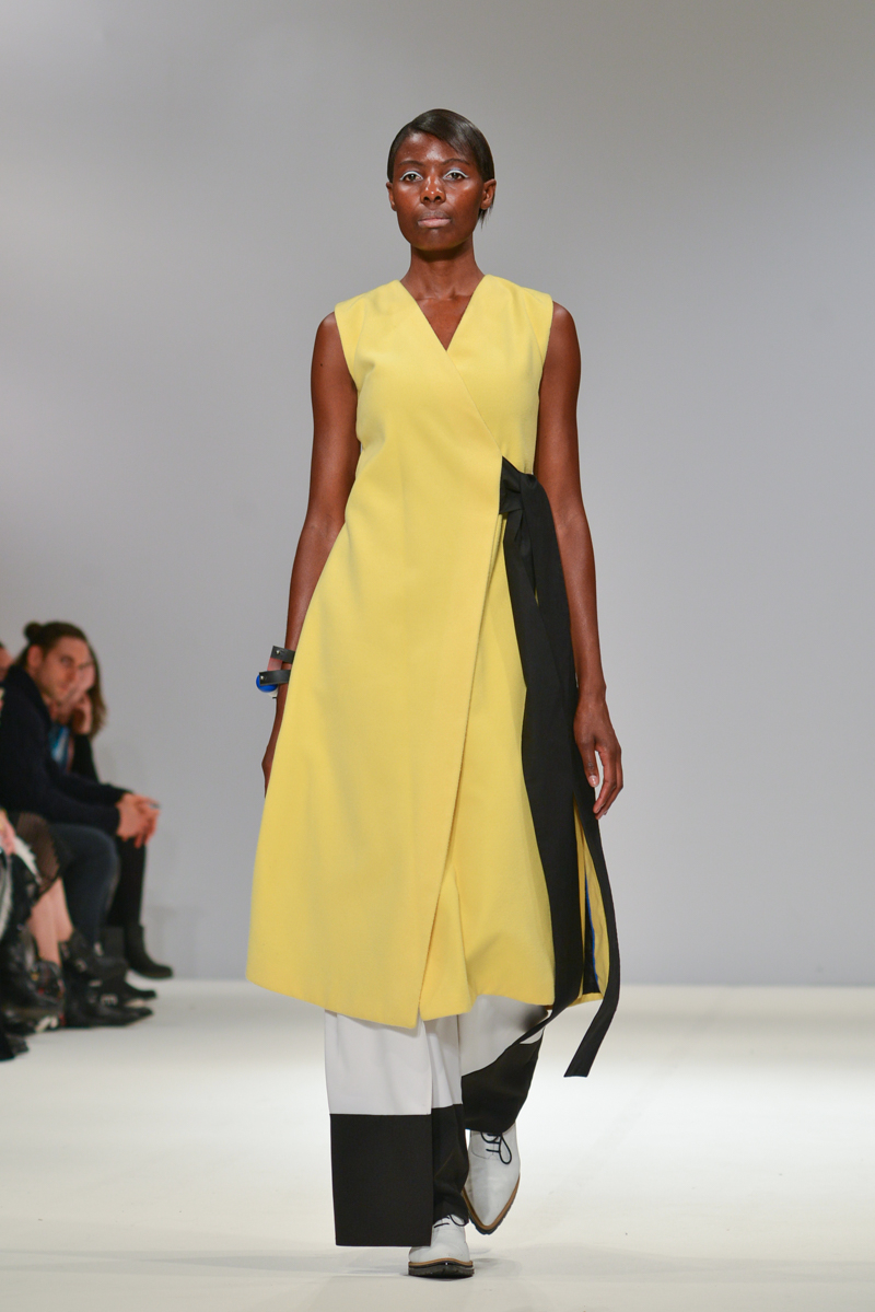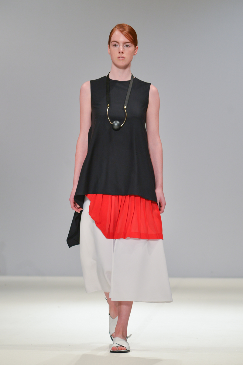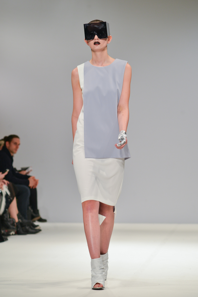 Budislava Kekovic‘s space sirens marched along with perspex acrylic box sunglasses. These architectural aliens walked to intergalactic Martian music with fittingly out of sync pockets and linear mismatched textures, draped in layers on dresses. Geometric architecture, simple linear forms and Japanese culture were all cited as inspiration for Kekovic, in the show notes however to me it was the extra-terrestrial that provided the key to Spring/Summer 2016 at Budislava.