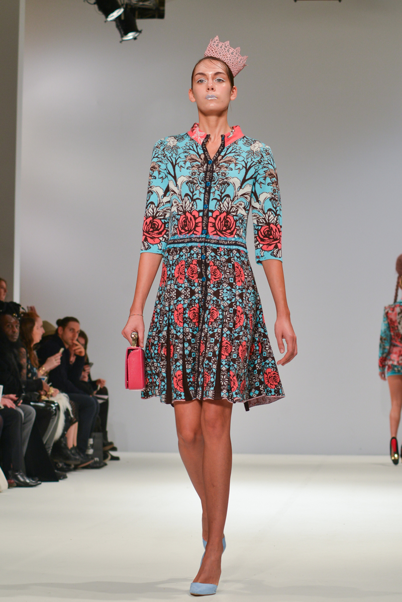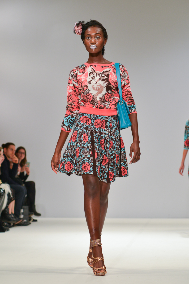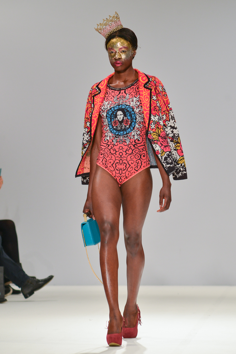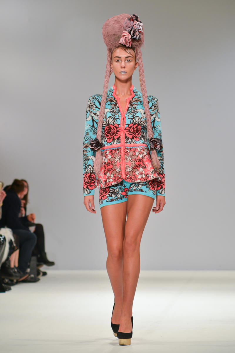 The most well received designer was certainly London-based Serbian designer George Styler. ‘Your make-up is terrible’ blasted over the speakers as gold, silver and turquoise glitter faced models in prom queen crowns and rose festooned hair showed Styler’s intricate knitwear pieces. Motifs included wolves howling, more kittens and the Mona Lisa emblazoned onto coral, aqua, burnt orange and neon pink knitted leotards with puffed Victorian sleeves, pleated midi skirts and bomber jackets. As the Autumn/Winter 2014 One to Watch winner at Fashion Scout, I think we will be seeing a lot more of this brightest of talents.