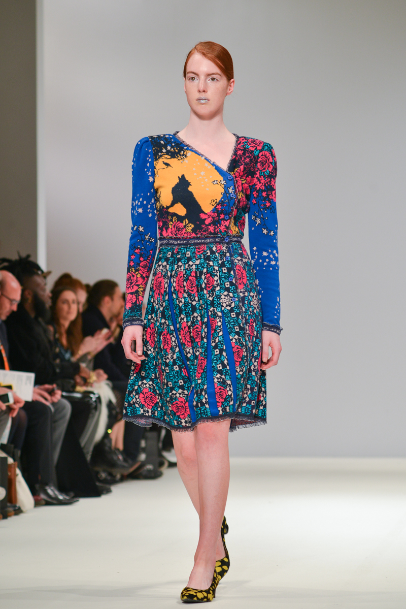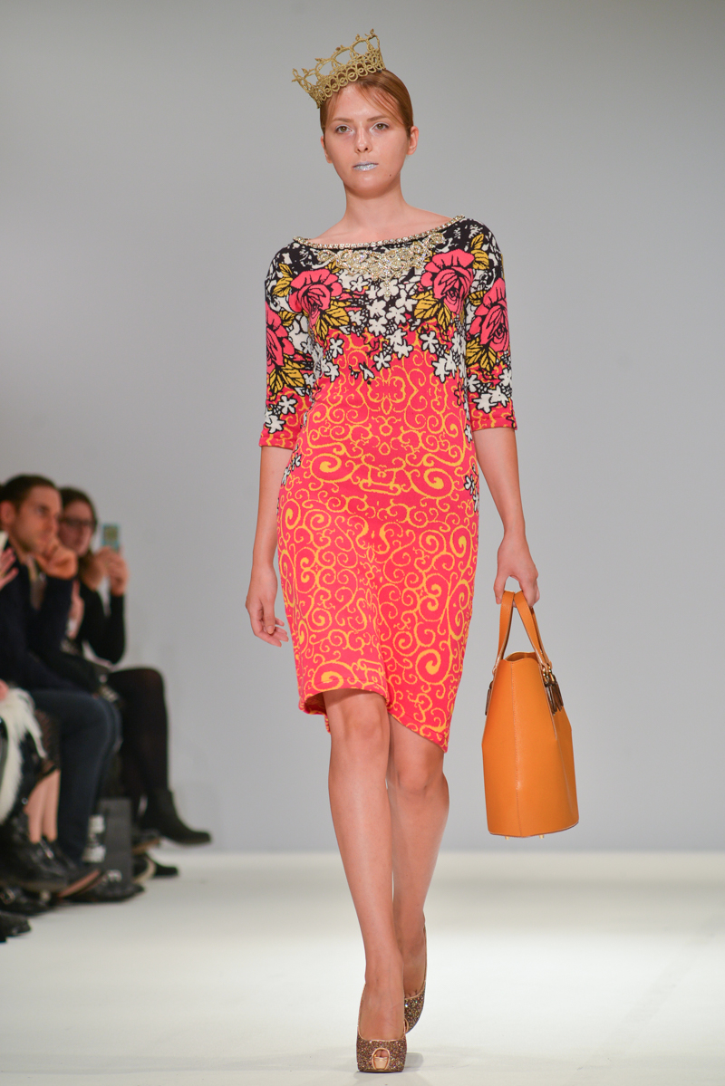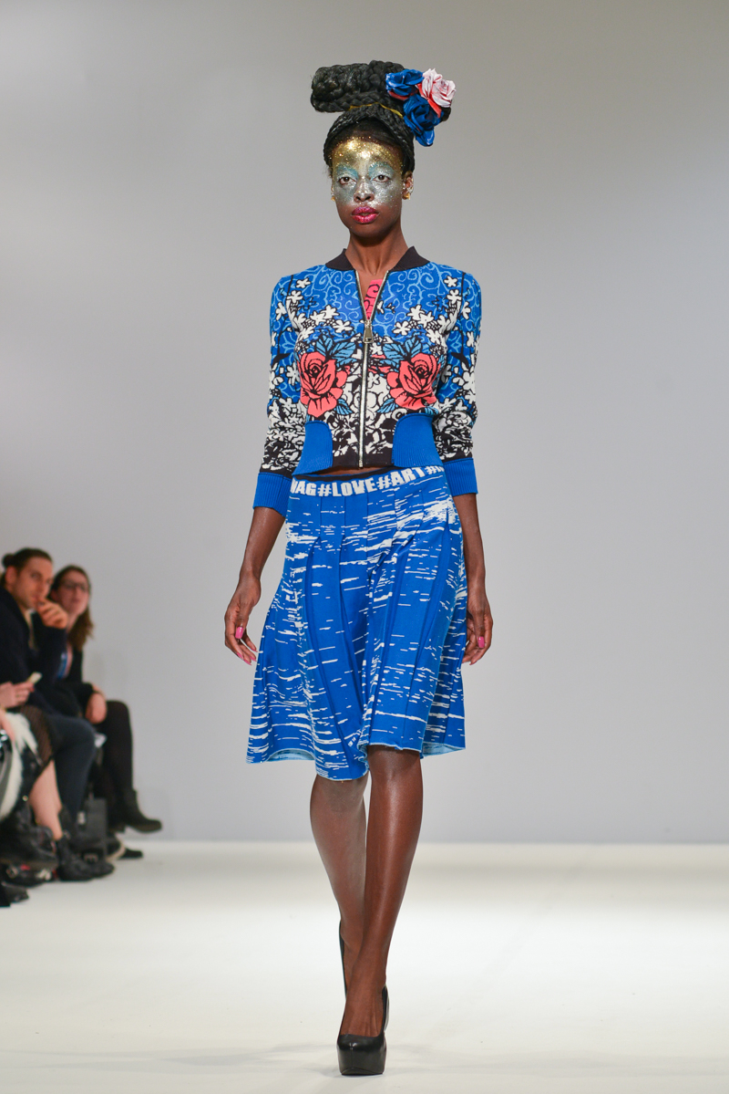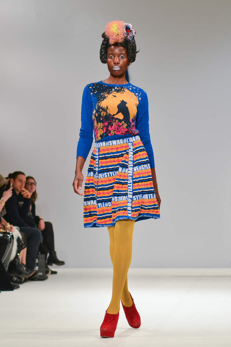 The most well received designer was certainly London-based Serbian designer George Styler. ‘Your make-up is terrible’ blasted over the speakers as gold, silver and turquoise glitter faced models in prom queen crowns and rose festooned hair showed Styler’s intricate knitwear pieces. Motifs included wolves howling, more kittens and the Mona Lisa emblazoned onto coral, aqua, burnt orange and neon pink knitted leotards with puffed Victorian sleeves, pleated midi skirts and bomber jackets. As the Autumn/Winter 2014 One to Watch winner at Fashion Scout, I think we will be seeing a lot more of this brightest of talents.