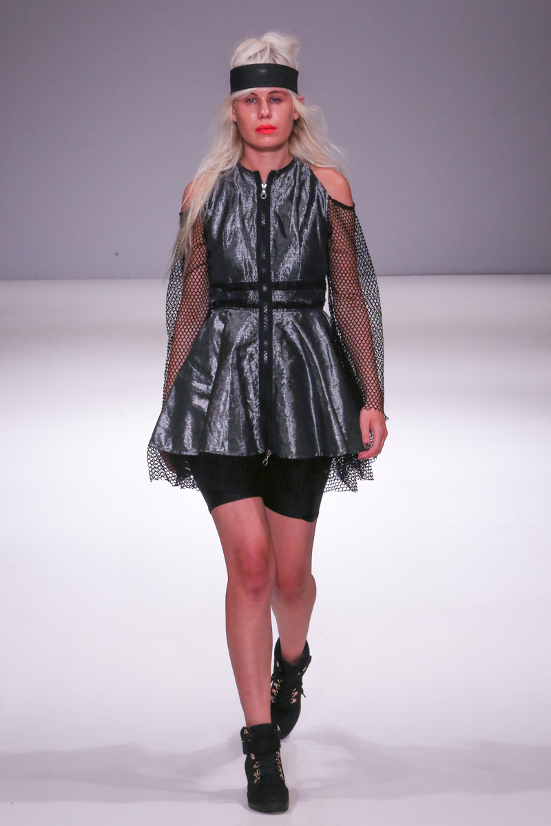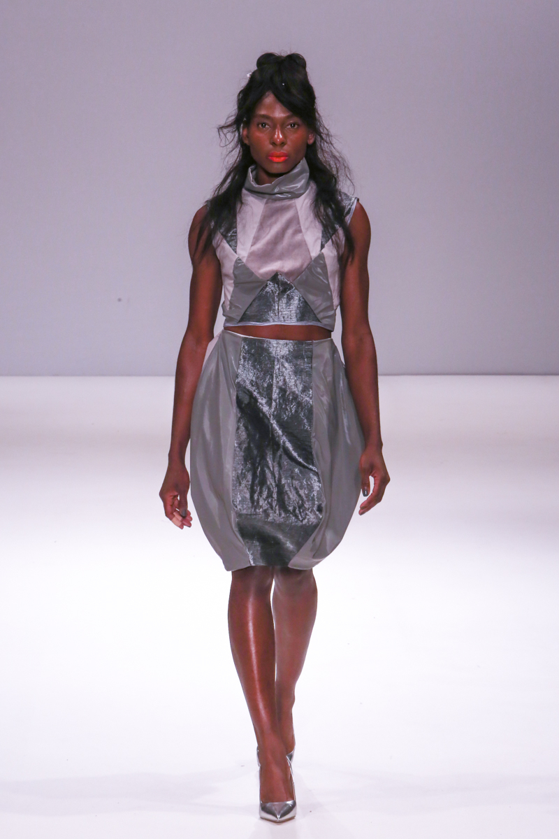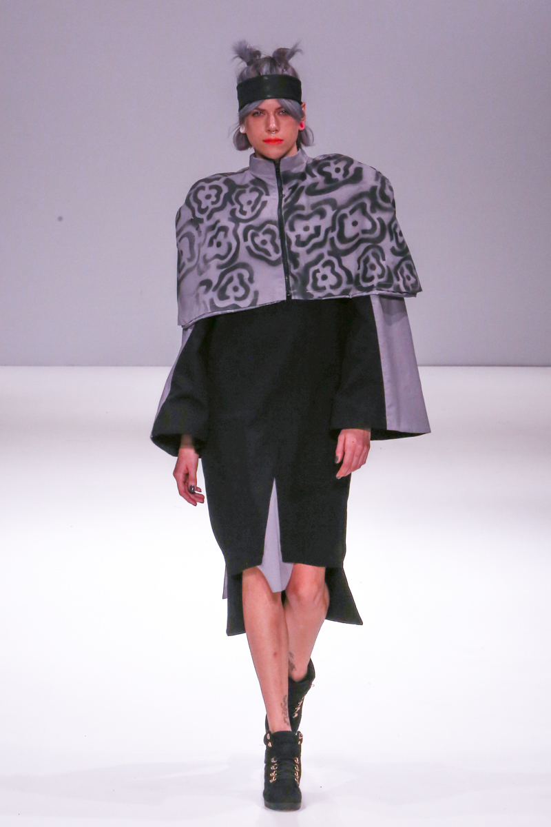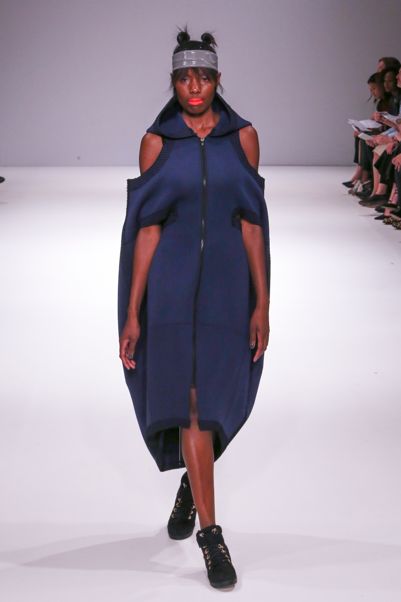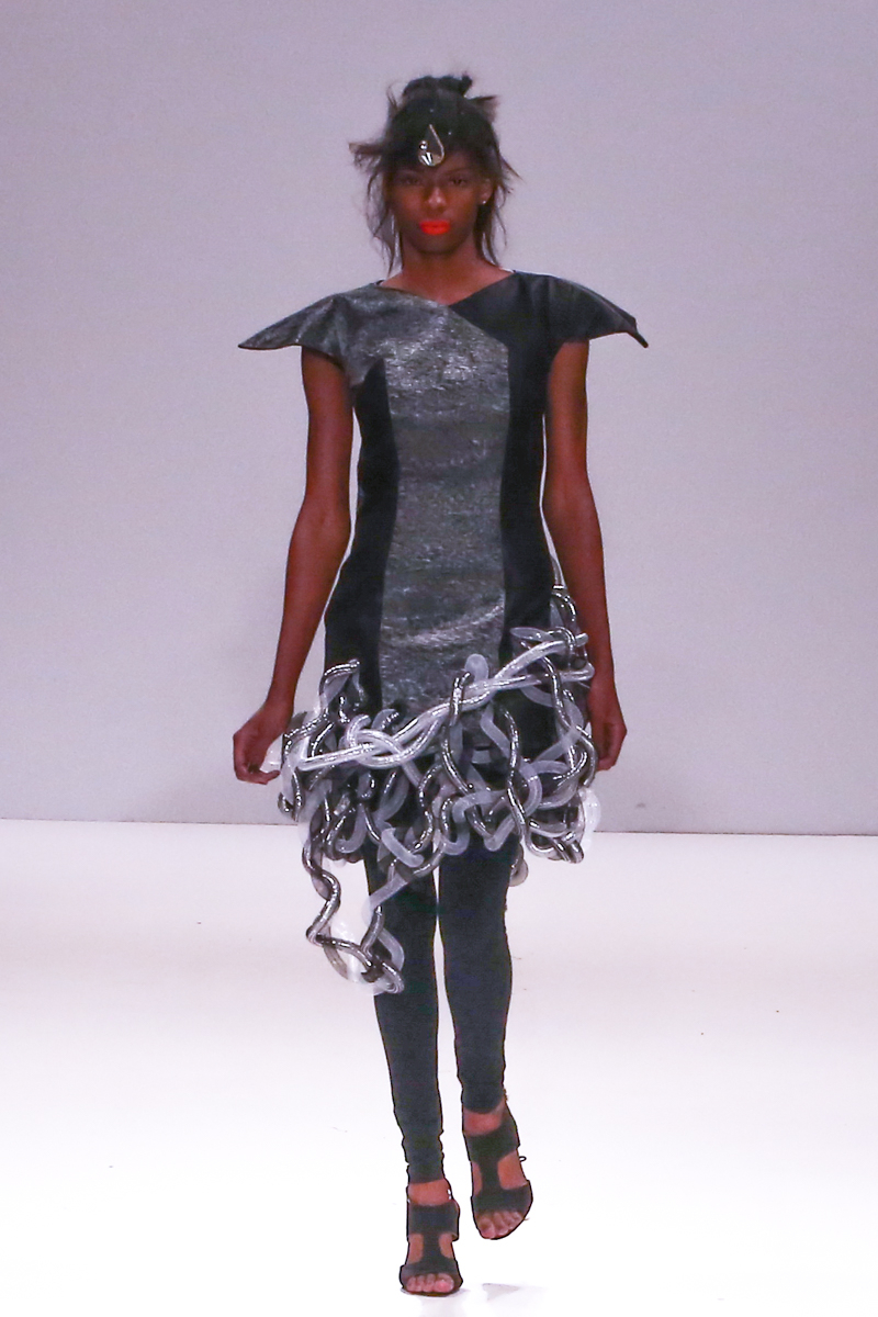 Anakin Telle Nakata impressed judges with an amorphous, navy and black dress with cut-out shoulders and asymmetric hemline, earning her the Technical Excellence award. The unusual design tapped into the current trend for sporty, urban pieces, capturing the sartorial zeitgeist whilst demonstrating a flare for fabric manipulation.