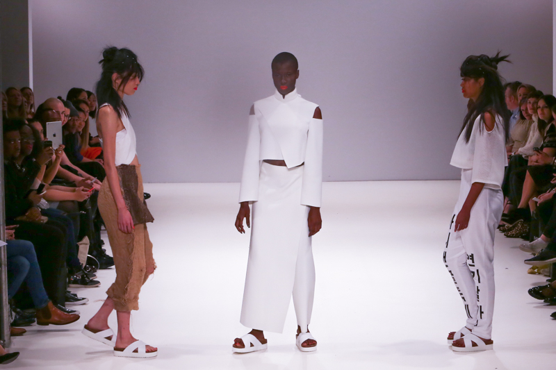 The winner of the overall Fashion Future’s award was Hana Minova, who will now have the opportunity to take on a design placement with George at Asda. Her collection took inspiration from Japanese culture, with striking separates in white and beige paired with platform sandals. Particularly strong was a look that consisted of a white, wrap-around top worn with cropped, loose-fitting pants created from an organic sacking material.