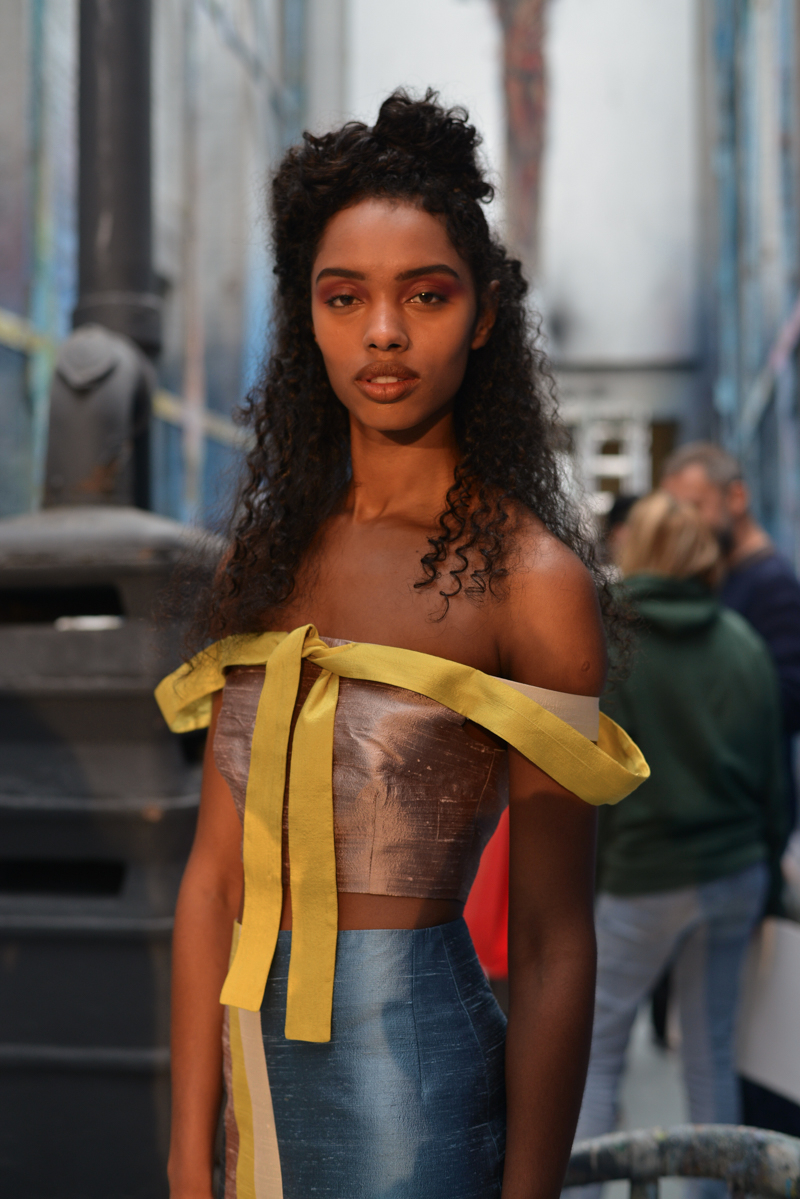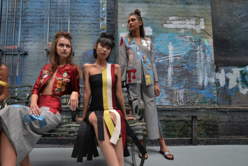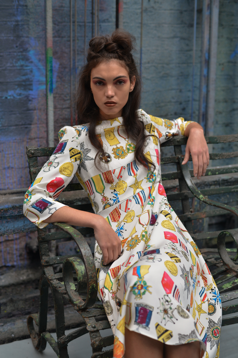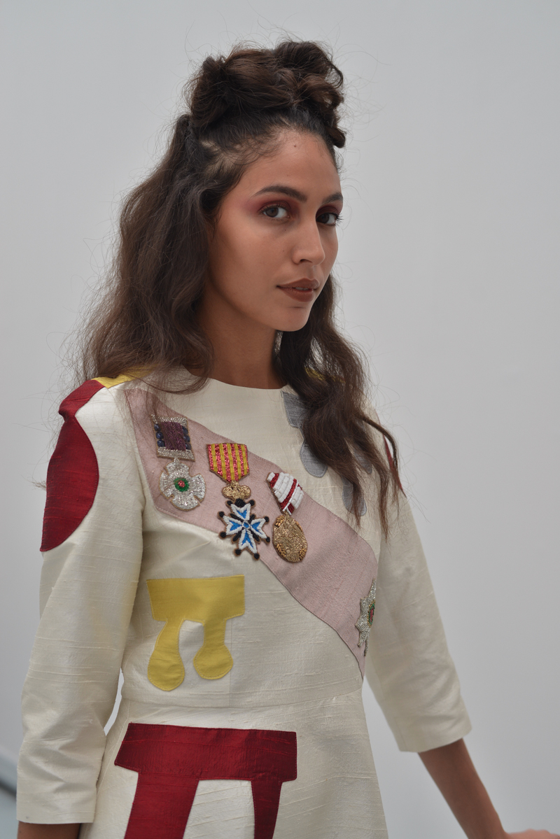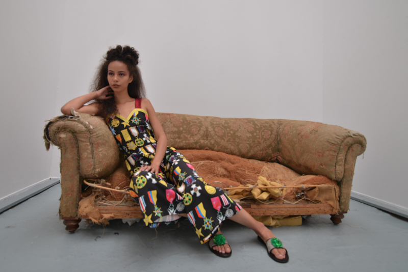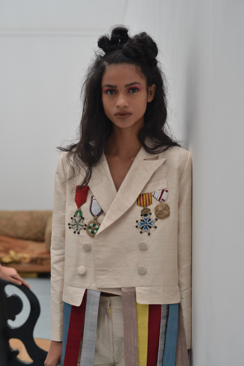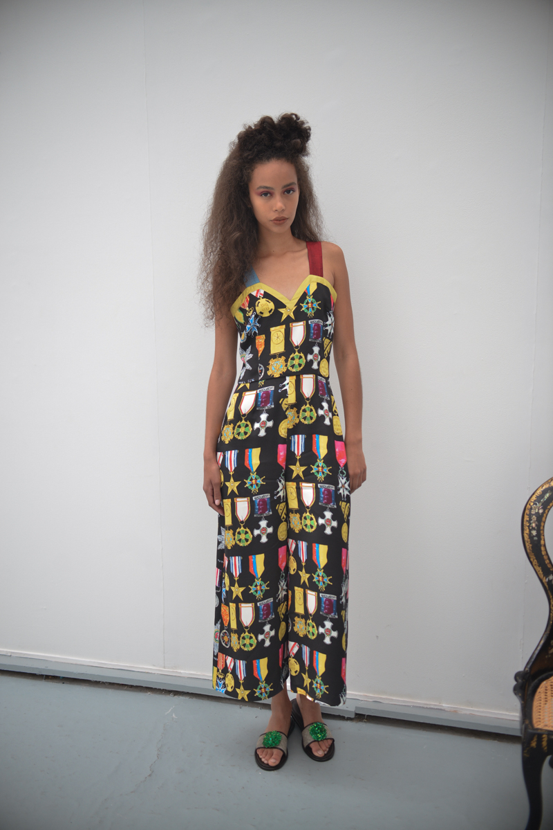 Writer Gabriel Garcia Márquez’s idea of the South American dictator in The Autumn of the Patriarch was evident in Tata Naka’s colour palette, shapes and prints, with military medals on earthy blues, swimsuits in rust orange and tan brown, ivory blouses, golden yellows and leafy Columbian greens. Flat sandals were worn in traditional brown, with some pairs featuring clusters of beaded green flowers echoing this walk through a South American landscape. Margaritas were on tap and a fruit bowl featuring bountiful pineapples, lemons and pears further emphasised the Mexicana theme to guests.