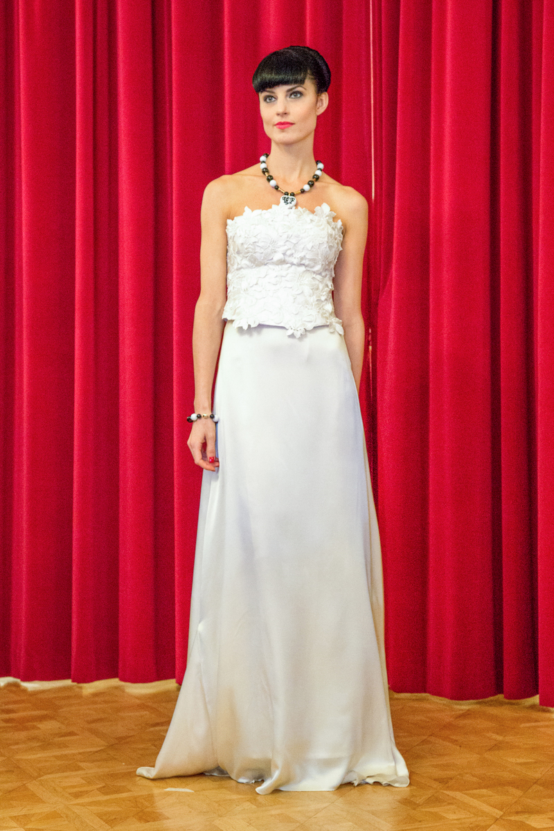 Fine spaghetti straps, open panelled backs and laser cut floral motifs decorated the models, with fine lace and embroidery on corset style tops. Bodis brought geometric, graphic lined cashmeres, silks and mohair in mustard yellow, rouge and burgundy, set on shades of grey, white and black, showing a selection from Autumn/Winter 2015 and a preview of Spring/Summer 2016. The full collection will be shown at Hungarian Fashion Week this October.
