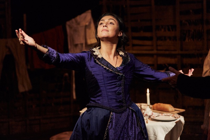 The first act centres on the family home. The small stage gives the audience a sense of the claustrophobia of poverty and an understanding of protagonist Tille’s (Olivia Bernstone) desire to escape. Bernstone plays an energetic and headstrong girl, who is bored of her life as a gravedigger’s daughter in a small Russian town. She delights in posing in the window, in hope of  finding  a  husband,  and  in  winding  up  her  mother (Fiz  Marcus) with a knowing lilt  to  everything  she  says.  This mother­-daughter relationship highlights the differences between the two and grabs the audience’s attention; Marcus’ face portrays worry in every sinew and Bernstone laughs with almost every line, unwilling to share mother’s concerns. The conversation between Tille, her father and capitalist Soskin, is particularly compelling as the patriarchy appears powerless while the money is in the girl’s hands. It is this interaction that really delivers the satirical bite that Yiddish theatre is renowned for.