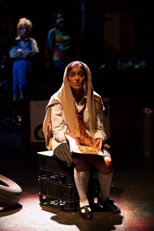 Anita and Me focuses on Meena’s idolatry and eventual emancipation from the pretty, confident Anita (Jalleh Alizadeh). Her portrayal is excellent and the angry confidence with which she stalks across the stage perfectly echoes her character. It is clear she hides her own abandonment with overcompensation. Meena’s emanation is characterised by her attempts to create blonde hair with a cardigan draped over her head, although to us it looks more like a head-scarf. It is not until after Anita’s excitement at trying on Indian clothing that we realise the significance: despite Meena’s attempts to break free of her culture she will always be tied to her family. Anita’s neglect tells us she has never been tied to anyone.