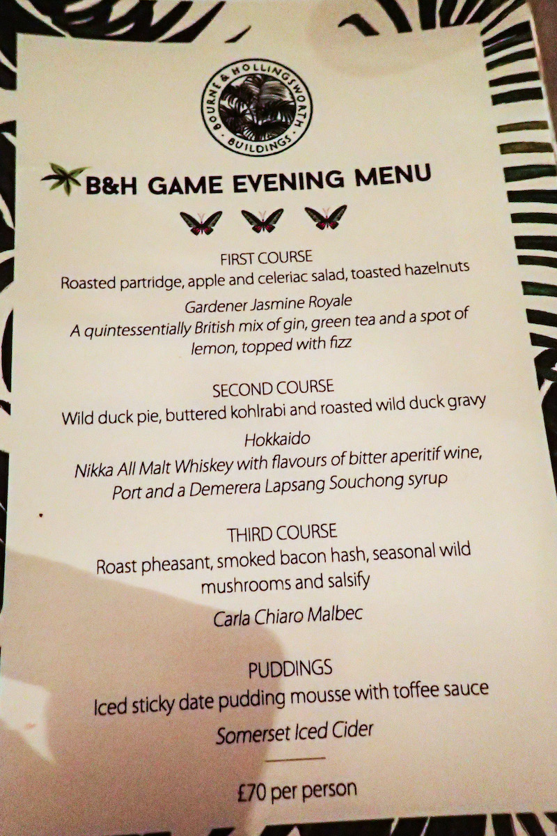 We move through to a verdantly decorated greenhouse conservatory, where hanging plants become the backdrop to our four-course, game-themed banquet, prepared by veteran chef Adam Gray as a promotion for the soon to be launched B&H Cooking School. Upon arrival, Gray comes to greet the large table of guests, talking us through his background, the cookery school and the food he will be preparing for us. As chefs go, (they’re rarely renowned for their oration) this one is interesting and passionate about his work, not hesitating to explain where he sources his game birds from. With his brief complete, Gray retreats to the kitchen and our first course follows.