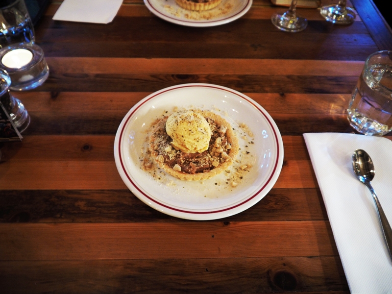 All the same, it is so filling that the prospect of dessert is a daunting one: a big slab of chocolate ganache tart with a boule of pumpkin gelato and a carefree smattering of pumpkin brittle. It’s a tough ask that gets a little easier once the first mouthful is shovelled in. The pastry is light and crisp but devilishly buttery, with a ganache filling that tastes pleasantly like the chocolate coating of a Malteser. The pumpkin gelato is a little disappointing, tasting more of cinnamon (a common theme) than of the promised pumpkin, but the brittle is actually quite pleasing.