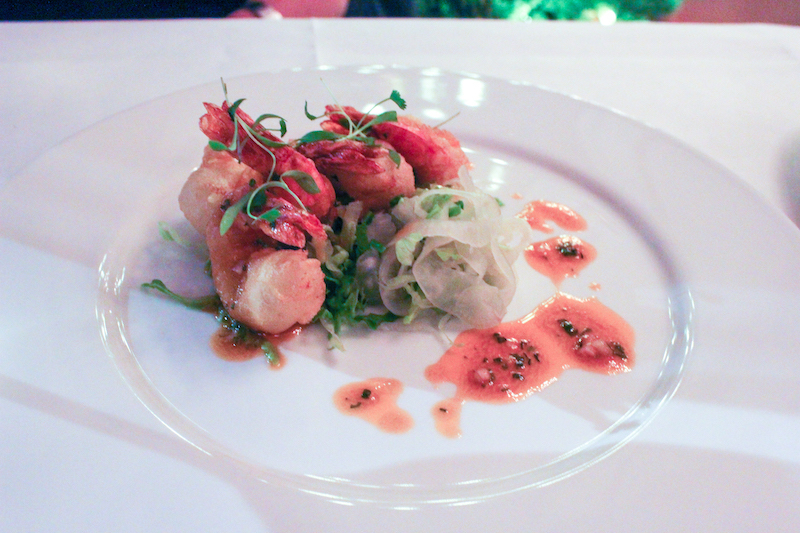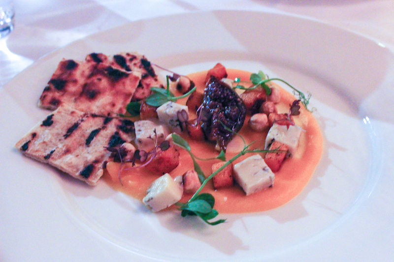 First to arrive is the complimentary flatbread, hummus and baba ganoush. The speed with which these are devoured does justice to how delicious they are. The flatbread is scattered with cumin seeds and served warm so that it is tantalisingly fragrant as it crosses the room. Almost as soon as the bread is finished, the starters arrive. The battered king prawns (with Bois boudran sauce, gem lettuce, and fennel) are exquisite, and receiving four whole king prawns for a starter is a revelation. The butternut squash with gorgonzola and poached fig is equally as scrumptious.