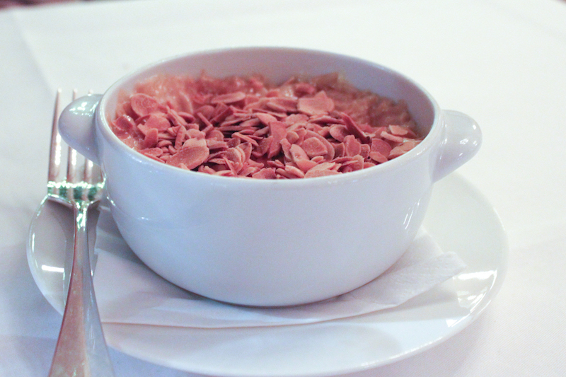 The mains arrive: Traditional Oven-Baked Okra (Bamia) in garlic and coriander sauce and Confit Leg of Duck with mustard fruits and celeriac rémoulade. To accompany them there are baby pitta bread – the softest that ever existed. The okra is served in its own little ramekin whilst the duck leg sits proudly on top of its fruits and celeriac. The course is satisfying but leaves room for a pudding.