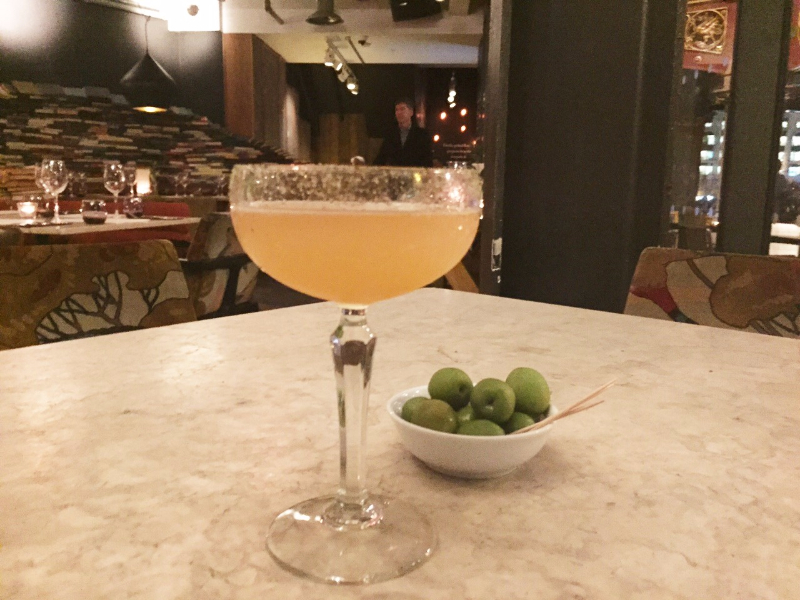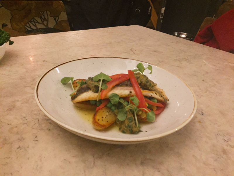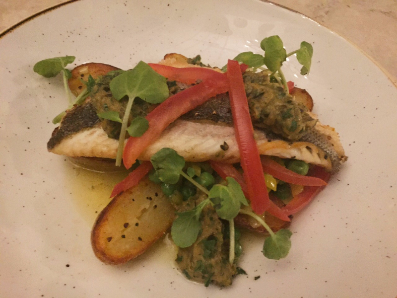 After happily consuming a sugar-rimmed, zesty Caipirinha and a passion fruit-infused, rum-based cocktail, we devoured a light starter of plump green Italian olives with large, stony pits before a colourful plate of perfectly crisp sea bass fillet arrived. This was lavishly adorned with feisty slivers of fresh red pepper and nestled on a bed of roasted potatoes, watercress and some beautifully sweet baby peas. Sea bass can often taste rather bland and is easily over-cooked, yet this tempting offering had just the right amount of seasoning and was delicately soft in texture. The potatoes were fabulously fluffy on the inside and invitingly golden-brown on the outside.