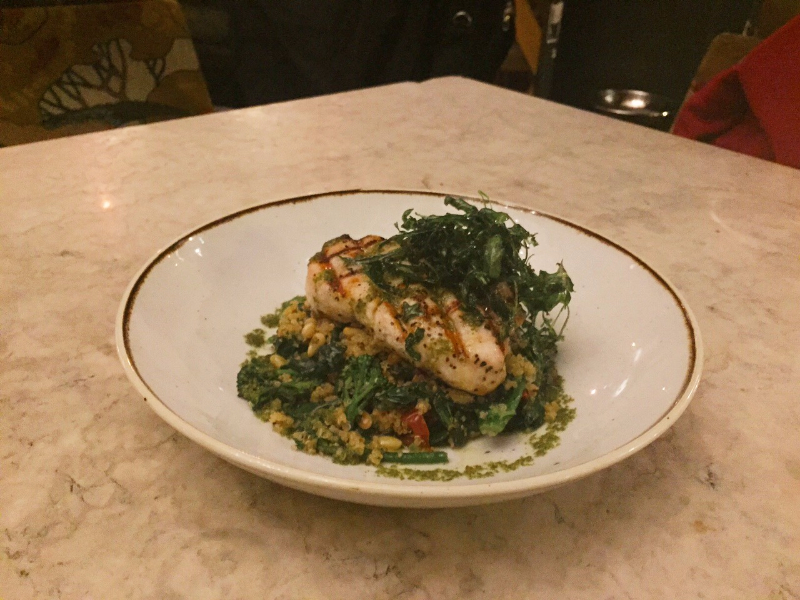 A slab of ethereal white swordfish then arrived, alongside large side dishes of emerald-green tenderstem broccoli and mac and cheese with a breadcrumb topping, oozing with the kind of joy that only fine English cheeses can bring. This fish dish was accompanied by wholesome quinoa, toasted pine nuts and dark leafy greens – the ideal dish to follow a debaucherous weekend. The nuttiness of the pine nuts merged beautifully with the mild flavour of the swordfish, whilst the quinoa and the green vegetables added a welcome earthy dimension to the dish. The steamed broccoli was perfectly al dente and we reveled in the comforting creaminess and piquant flavours of the cheesy macaroni dish, which boasted a delicate balance of mild and mature cheddar.