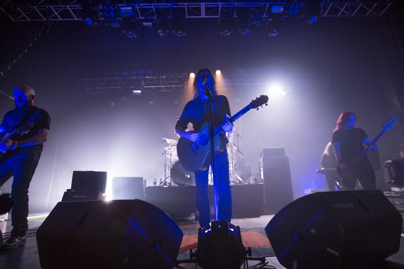 Not overly heavy and surprisingly chilled, the sound was considered and relaxed. There was no heavy bass line, and the music was sober enough to allow conversation in the venue. Justin Sullivan, lead singer and composer, stood centre-stage in a grey-toned spotlight and held his audience’s attention effortlessly – most notably during Breathing, in which almost nobody moved and the lyrics (“I can hear us all breathing”) felt totally appropriate. The passion of drummer Michael Dean was infectious, echoed in the active mosh-pit.