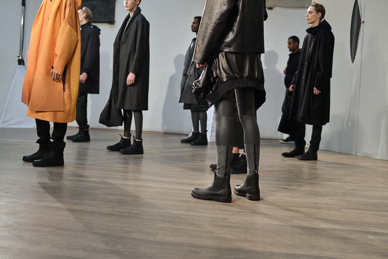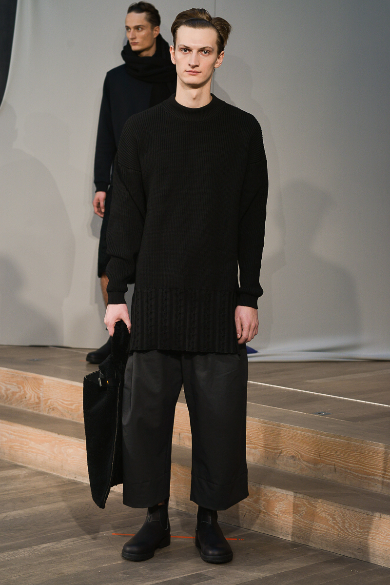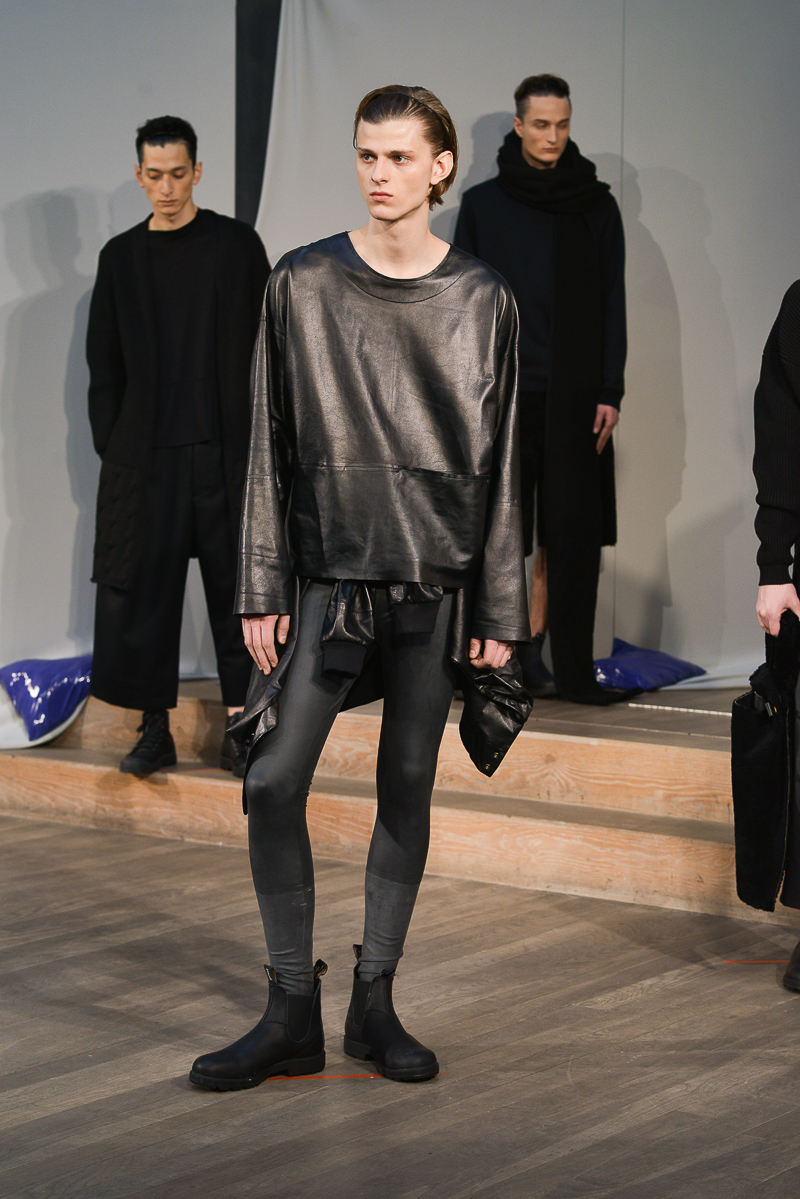 Walther’s work questions the idea of art as a static, unmoving thing, and the grand scale and minimalist structure of his installations have clearly made an impact on Berthold’s own creations. His clothes this season are designed to encase the body in a way that allows it to move freely, exploring the differences between “covering” and “smothering”. In one case, a hand-knitted blanket with sleeves wraps itself around the body, whilst elsewhere crew neck sweaters in rubber or shearling gently enclose the body without restricting it.