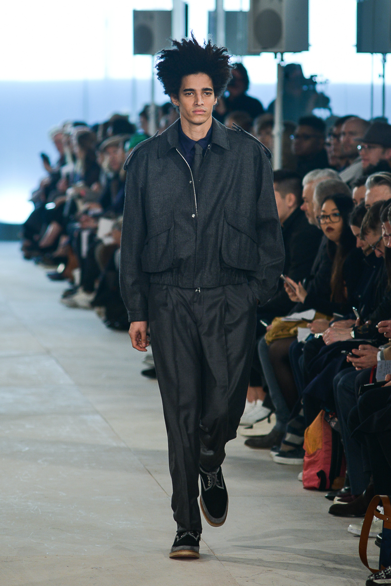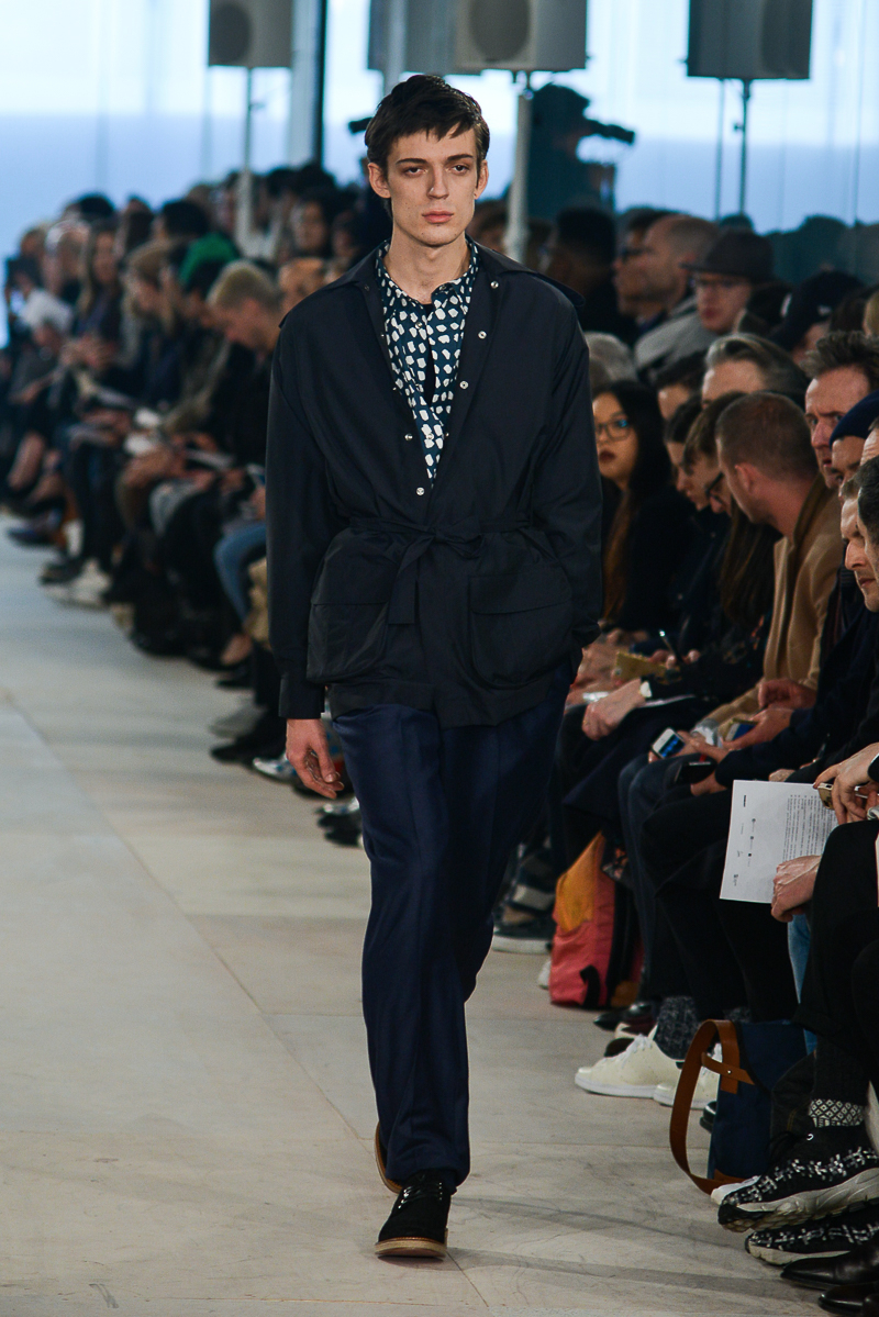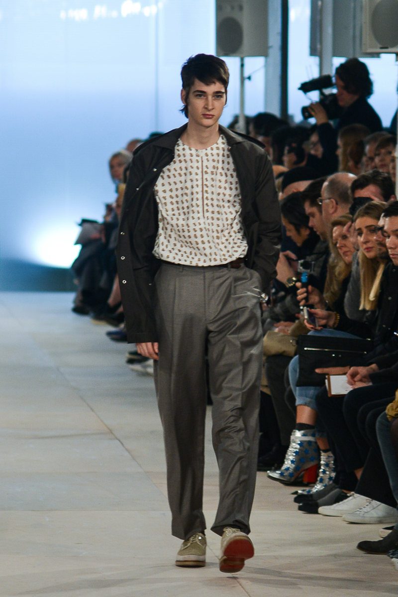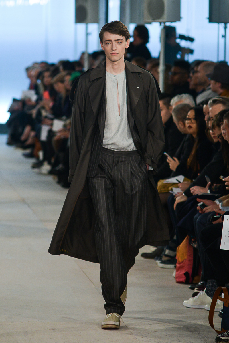 One of the highlights of this collection was undoubtedly Grant’s sophisticated take on the quintessential 1980s shell suit. Lightweight wool or linen shirts were tucked into billowing pleated trousers in matching hues of grey or navy, all belted at the waist to give the free-flowing shapes some structure.