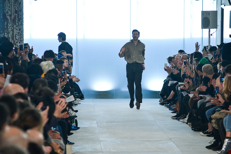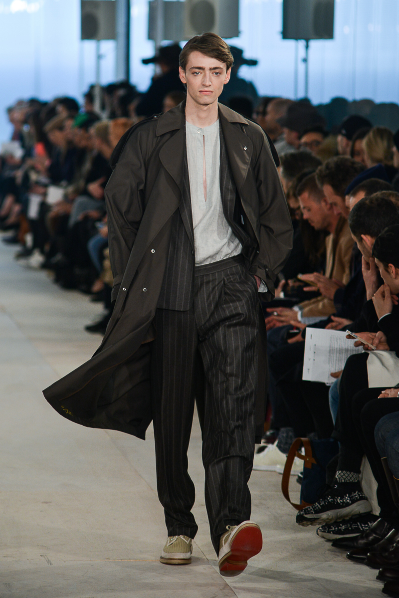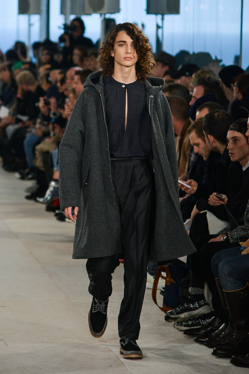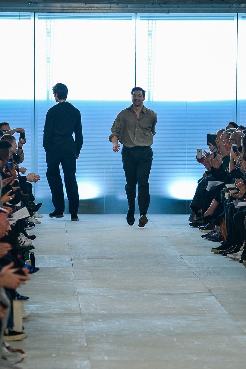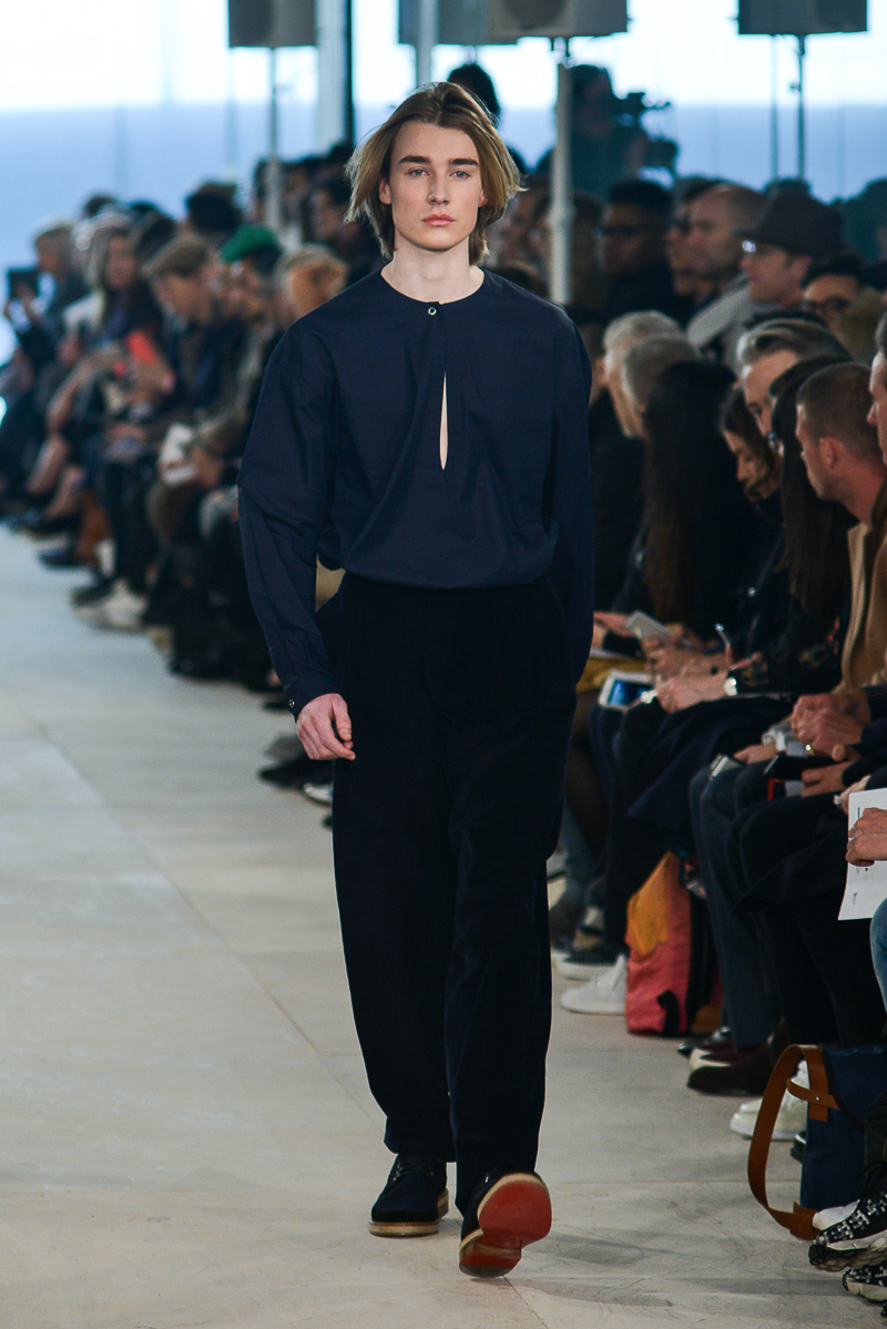 One of the highlights of this collection was undoubtedly Grant’s sophisticated take on the quintessential 1980s shell suit. Lightweight wool or linen shirts were tucked into billowing pleated trousers in matching hues of grey or navy, all belted at the waist to give the free-flowing shapes some structure.