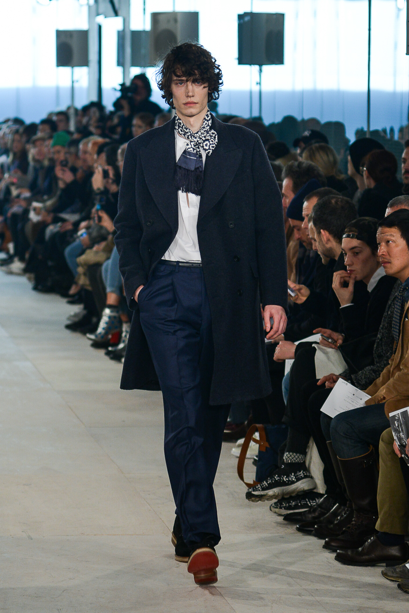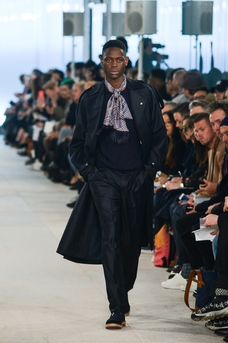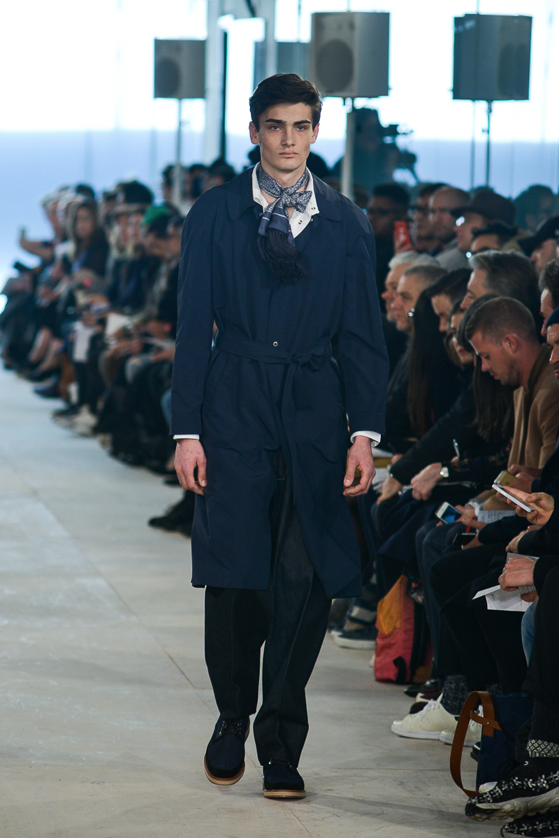 Printed silk scarves finished off many of the otherwise simple, neutral-toned ensembles with just the tiniest hint of retro flamboyance. With his perfectly balanced shapes, classic colour palette and rich textures, Patrick Grant has – somehow – made retro roller disco feel contemporary and cool.