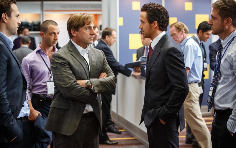 As recounted in sleazy fashion by cunning trader Jared Vennett (Ryan Gosling akin to a Scorsese crime film), the narrative switches between the various “misfits” who accurately predicted the coming subprime mortgage crisis and swam against the tide of popular opinion. These include two very different hedge fund managers: Michael Burry (Christian Bale), an eccentric savant who “reads the numbers” better than anyone else, and Mark Baum (Steve Carell), an abrasive neurotic with a chip on his soldier towards the banking sector after a family tragedy. Rounding out the main cast are two inexperienced investors (Finn Wittrock and John Magaro) who are reluctantly mentored by paranoid ex-banker Ben Rickert (Brad Pitt) after they stumble onto the truth.