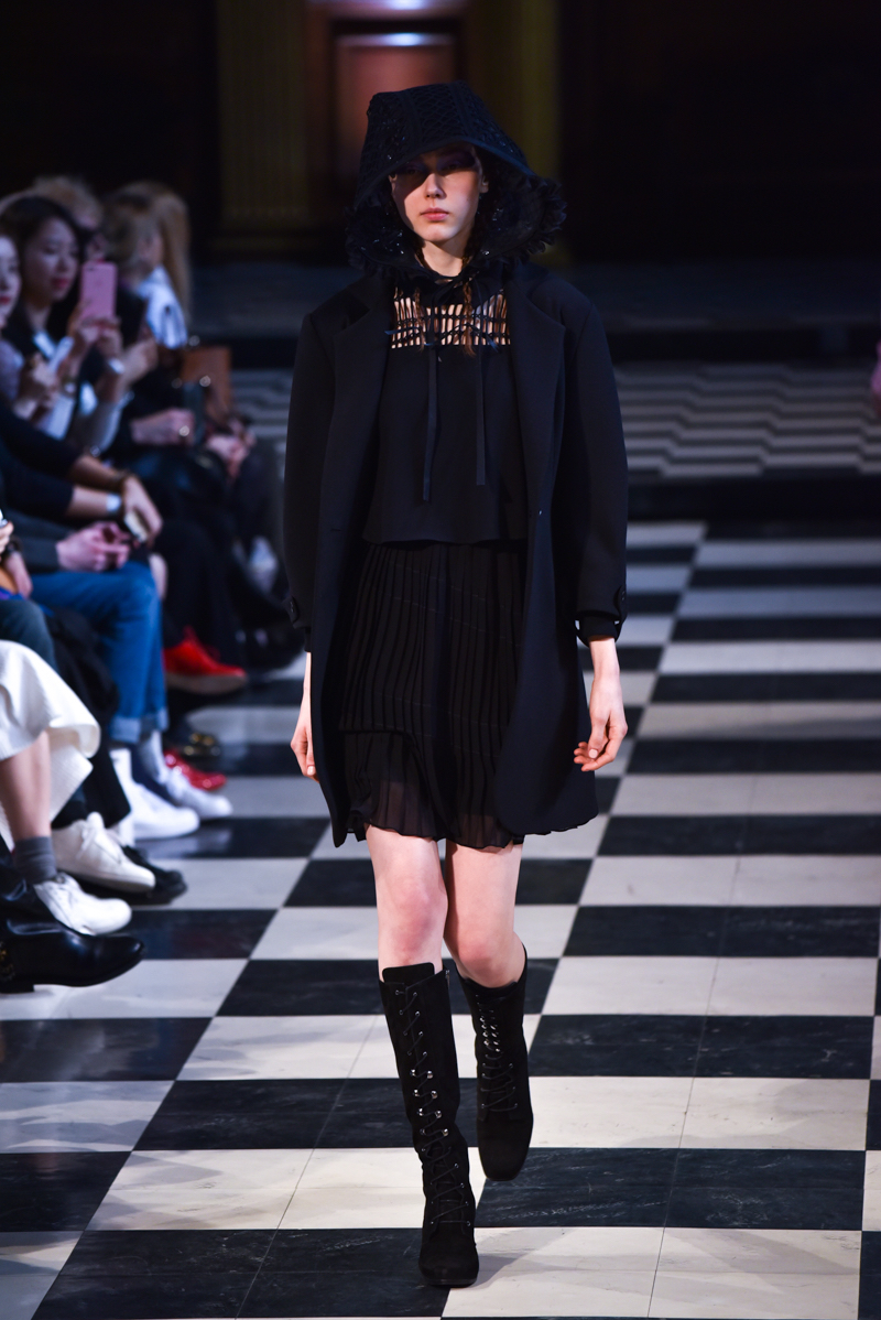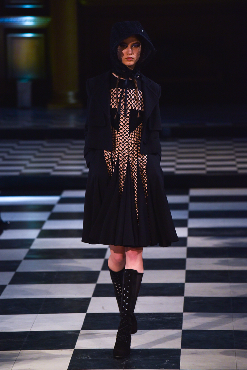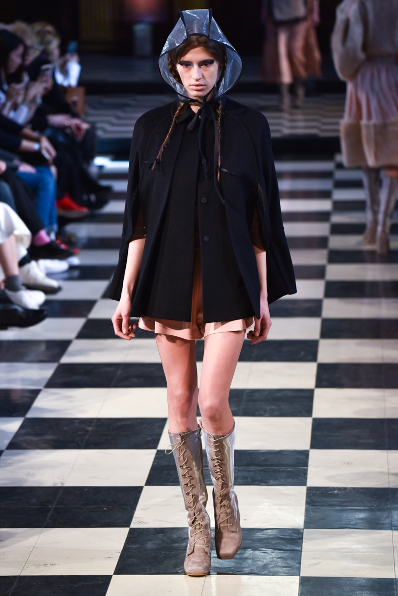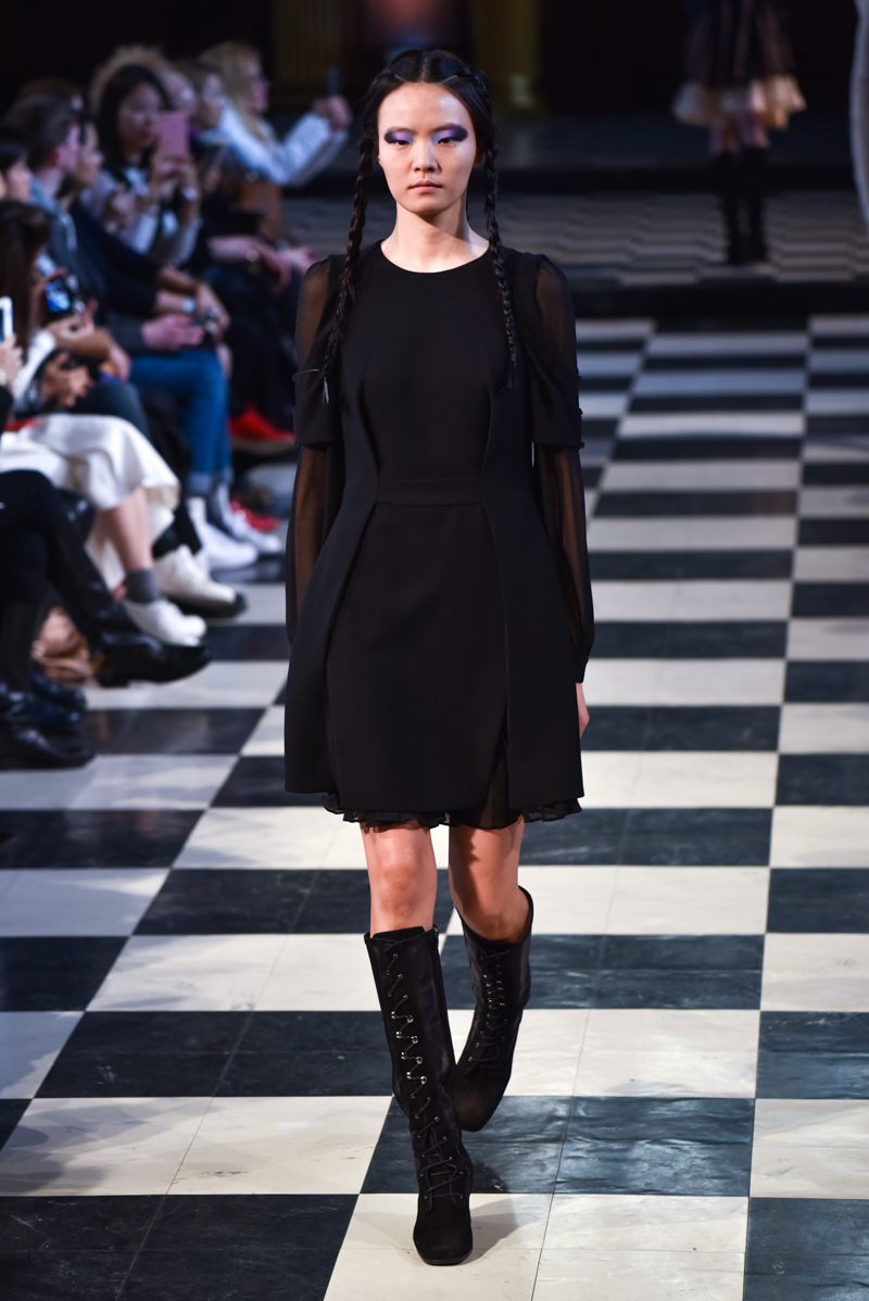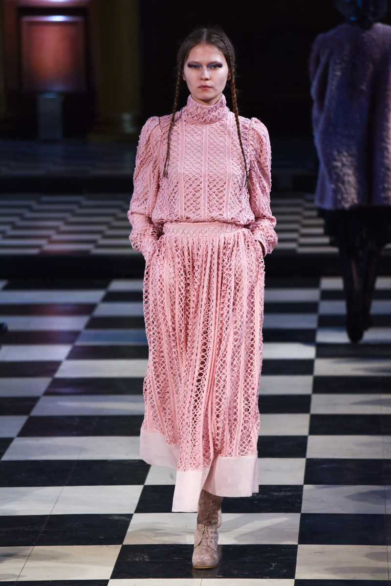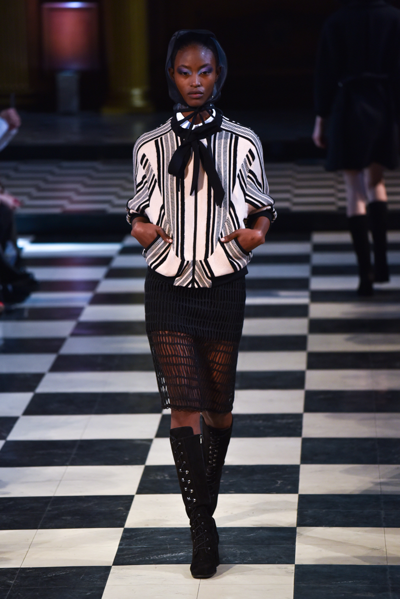 Situated in the main hall of St Andrews church in Holborn, the catwalk ran through the centre of the ancient checkerboard tiled floor. The daylight peeking through the long, narrow windows caught the dusk in a subtly romantic way, perfectly setting the tone for Bora Aksu’s autumn/winter 2016 collection.