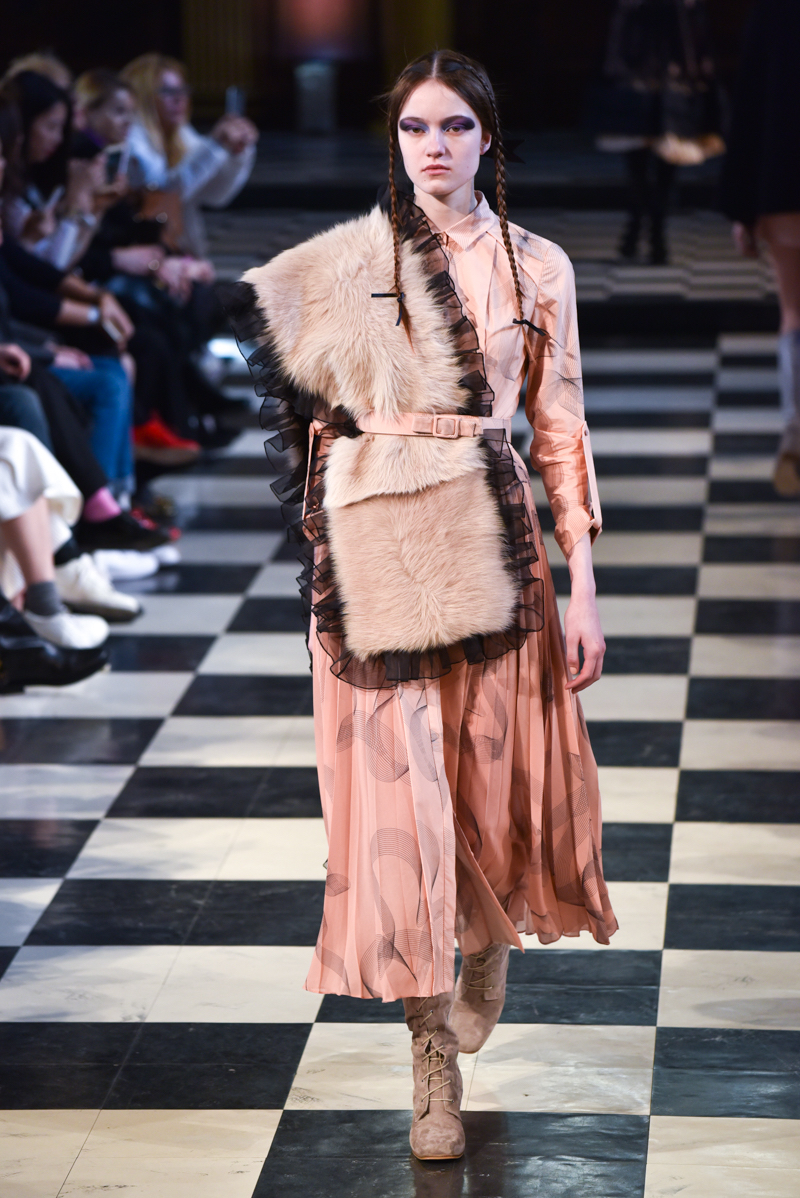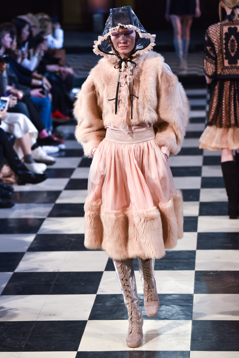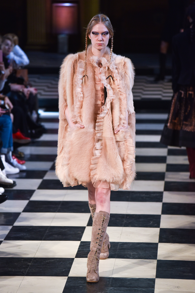 Grand Dutchess Olga of Russia inspired the collection, her complex story tells the tale of a girl who lived life at both ends of the spectrum. She spent many years after the Russian revolution living a very sparse lifestyle, farming and doing household work, a stark contrast to her earlier years which were lived in grandeur. This is translated in the contrasting textures; thick embroidery against soft shearling and leathers. The overall effect is romantic and stunning – a really beautiful collection.