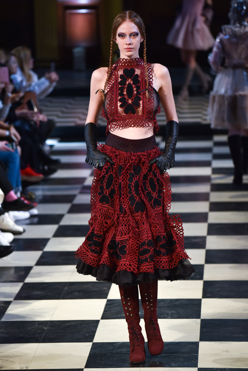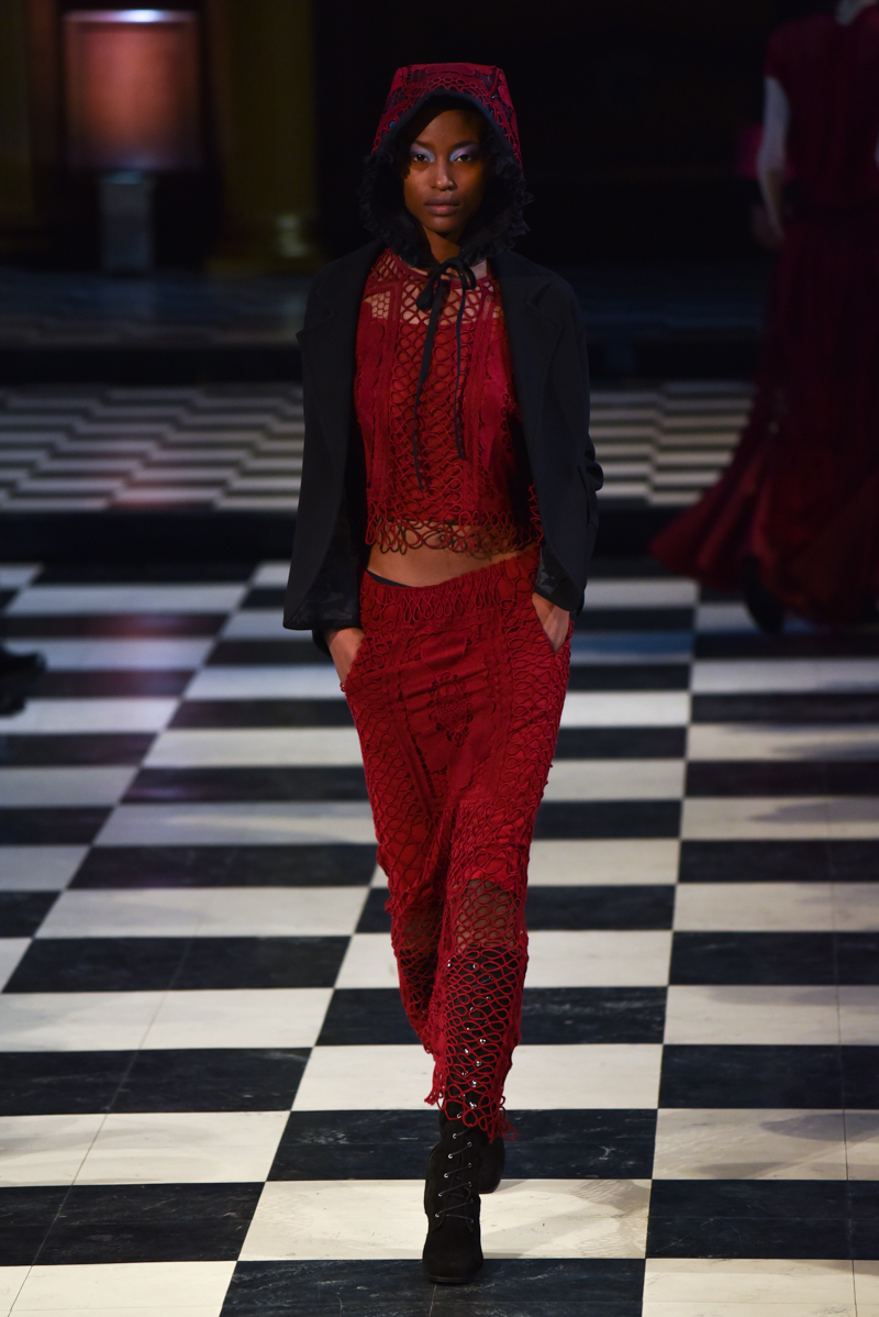 From the moment the music picked up and the first girl walked out on to the floor, dressed in delicate lace, the audience was captivated. The silhouette was feminine and sophisticated; long cocoon coats, cropped tailored jackets, dresses with modest necklines. A warm palette of red, pink, fuchsia and aubergine contrasted with black, added romance and drama to the mood.