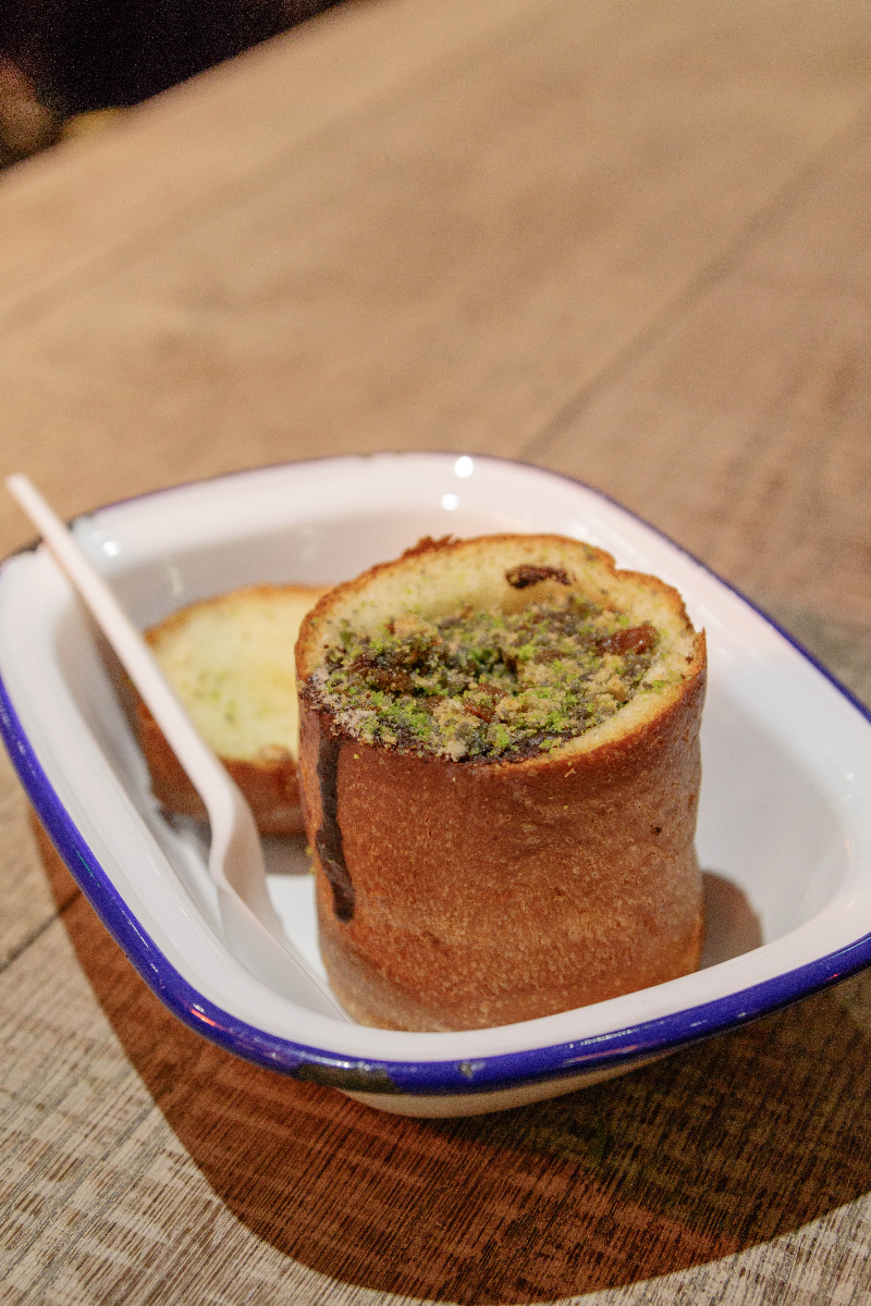 Despite undeniably filling mains and sides, I did opt for Bunnychow’s dessert option: a hollowed out brioche roll stuffed with a rich warm dark chocolate sauce and topped with a nut and raisin mix. Feeling the need to stay on-message, the dessert feels slightly repetitive, given it too relies on a bread roll as a container, but the brioche was light and buttery and the filling rich and moreish without being dense.