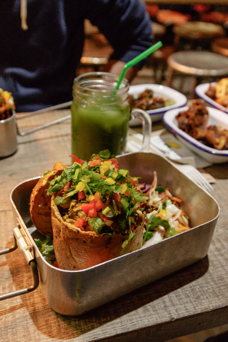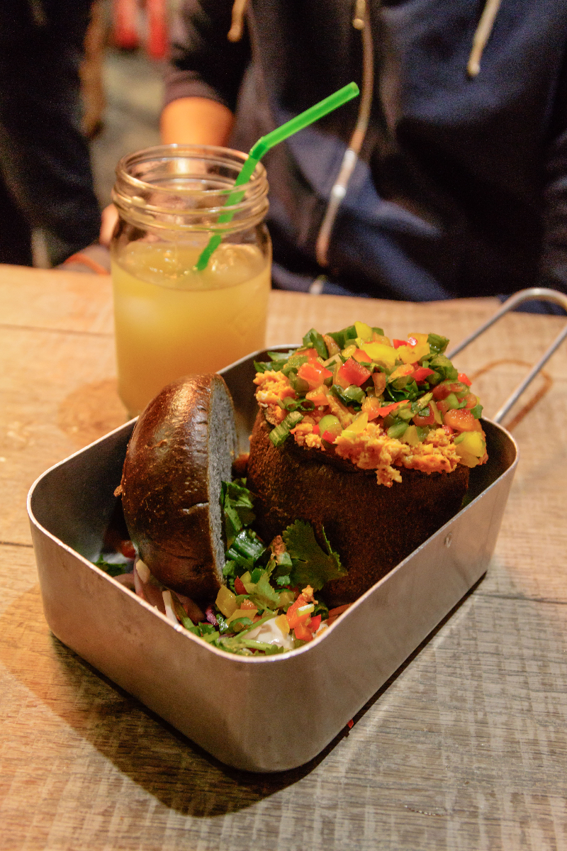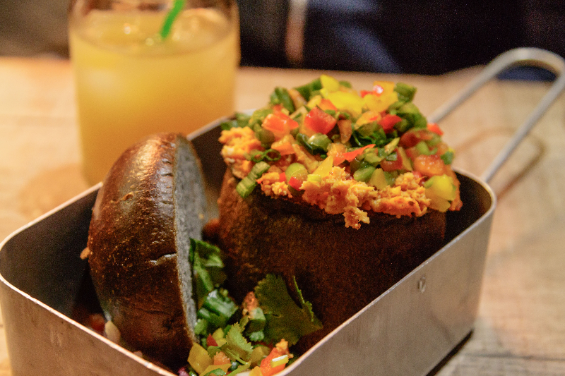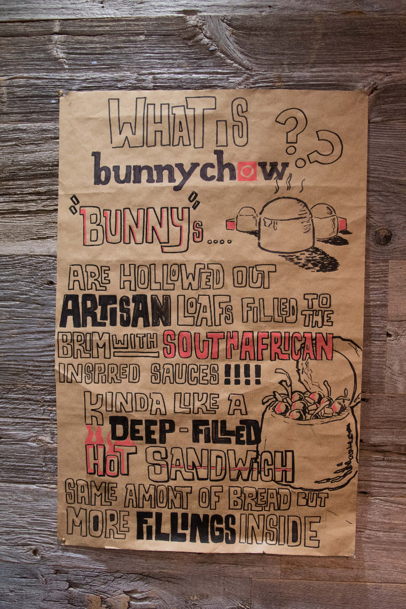 Well into their second year in their Soho premises, Bunnychow has established itself as more than a passing street food trend. The idea of a self-contained meal – from the Cornish pasty to the Sri Lankan Mas Paan – is not necessarily new, but Bunnychow manages to present a take on the concept that feels fresh, modern and fun. The core of this is the “bunny” itself, a hollowed-out loaf of bread crammed full of a spiced filling.