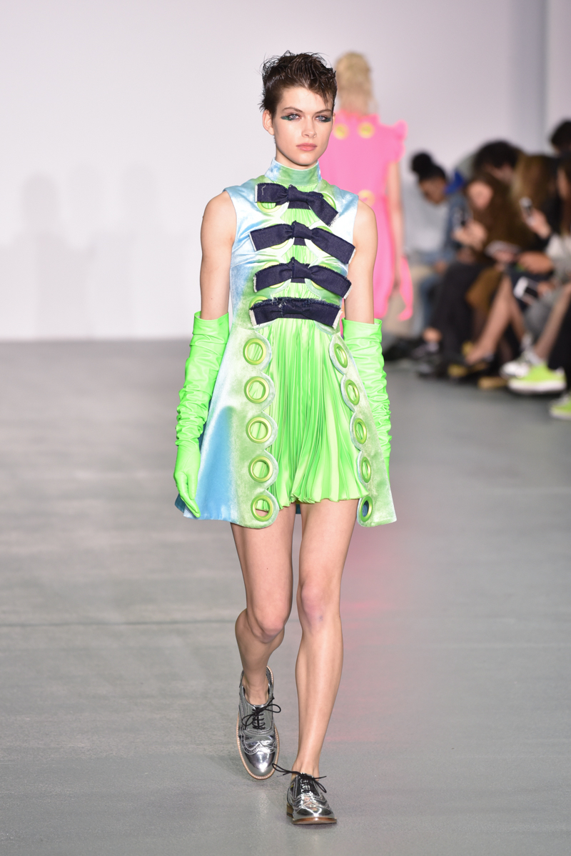 It is easy to dwell on the complex ideas and influences that drive this collection – but that would mean forgetting the point of these clothes, which are above all designed to be fun. Colours and patterns clash wildly across dresses and dramatic cape coats, whilst elsewhere lurid patterned tights are offset by metallic brogues and flared skirts. Elsewhere, giant frills and oversized bows adorn a top or a mid-length gown, with vibrant elbow-length gloves completing the acid-prom look in striking style.