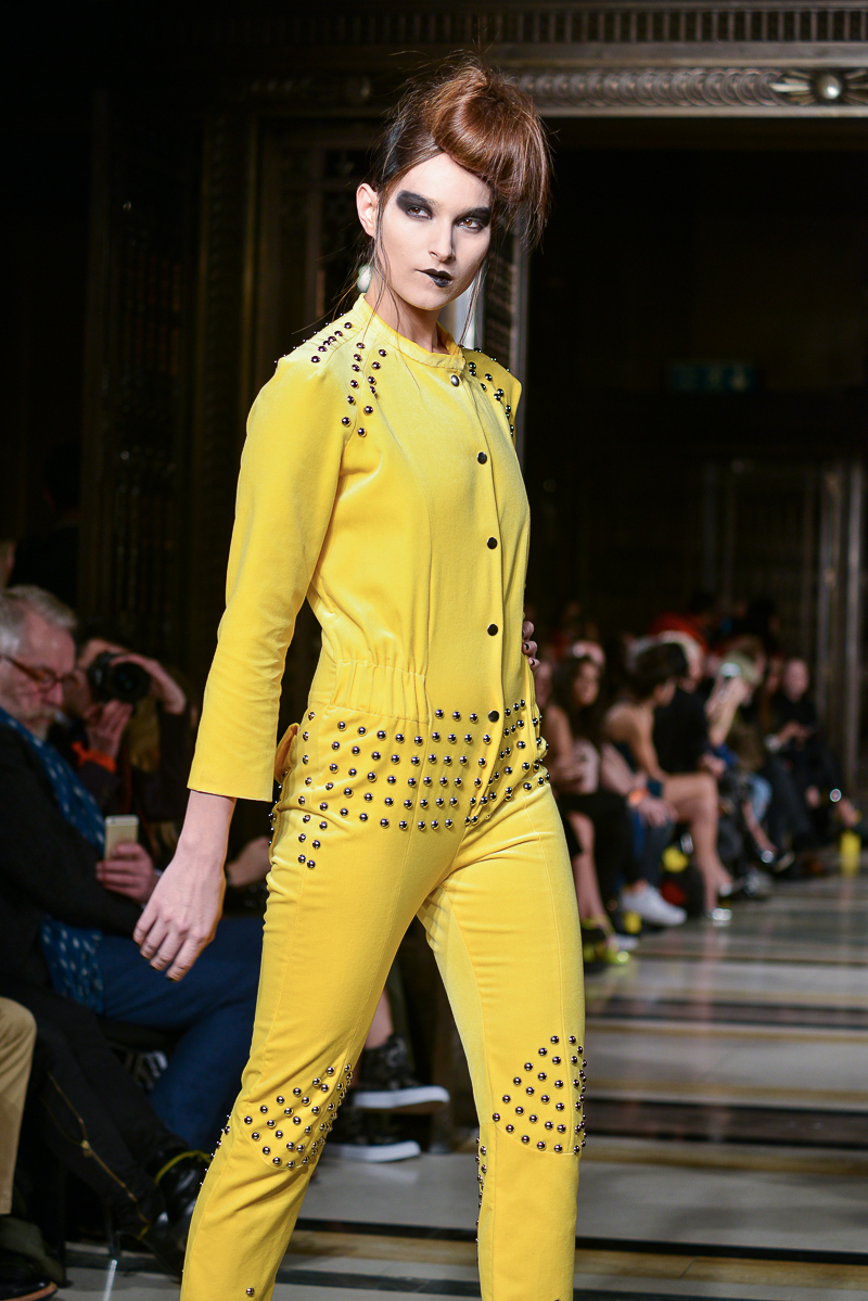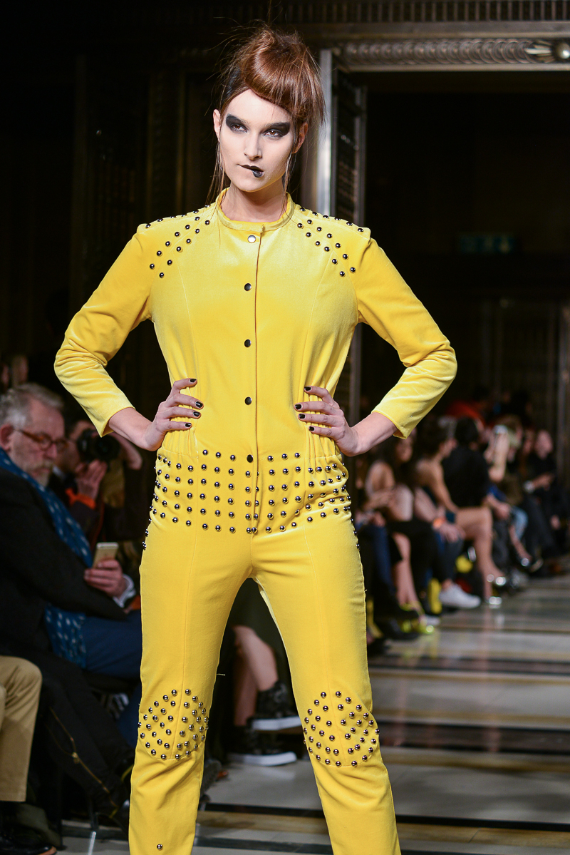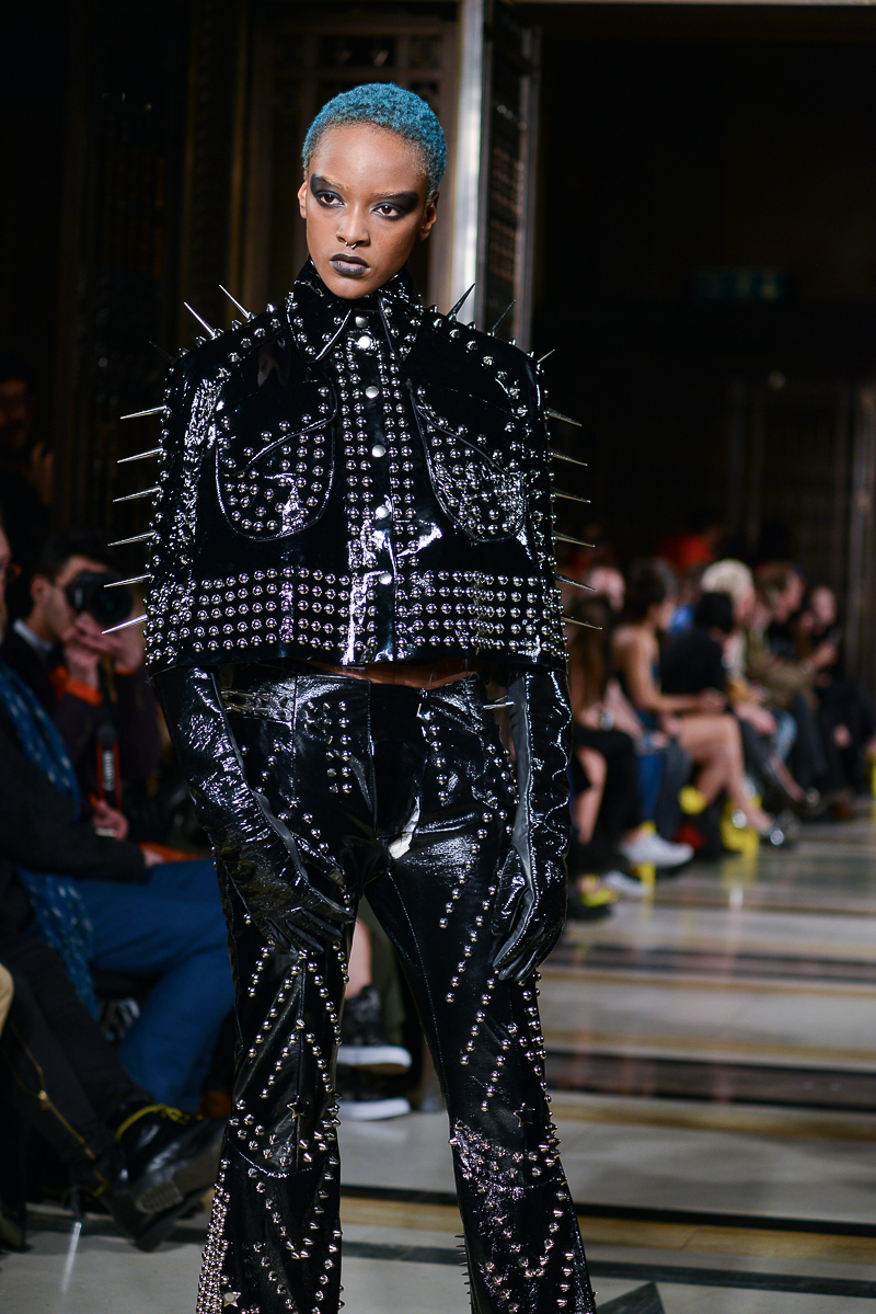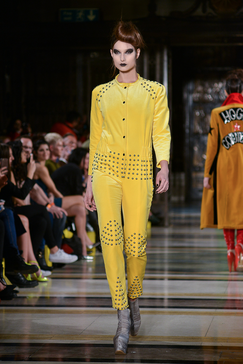 Tough embellishments gave an added edge to Hogg’s latex heavy collection. Black latex biker jackets and duster coats were heavily embellished with an array of spikes, whilst the range saw an added pop of colour with the incorporation of multi-coloured and gold latex catsuits. Bright yellow bell skirts, burnt red coats and matching yellow and green two piece suits embellished with stars, broke up the largely black collection.