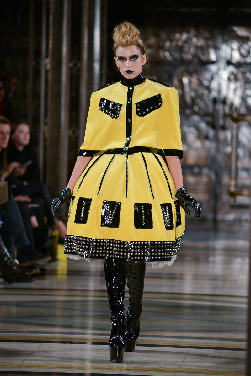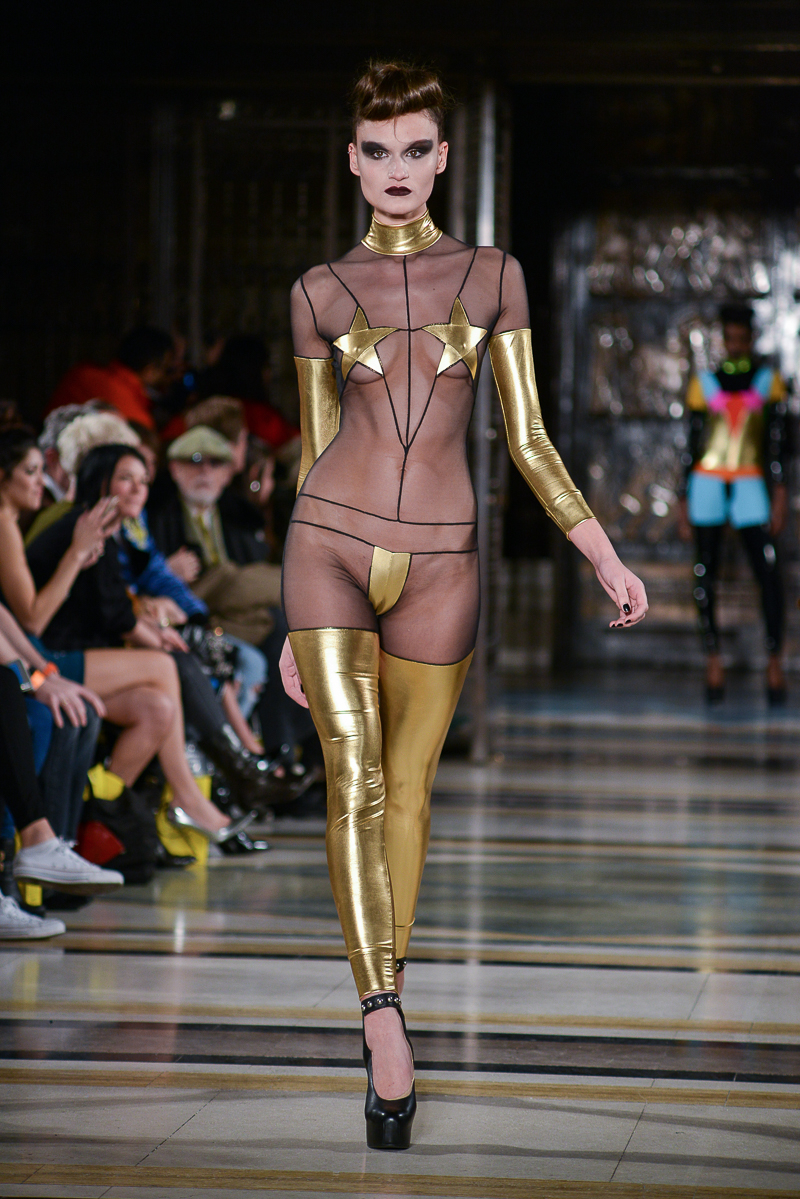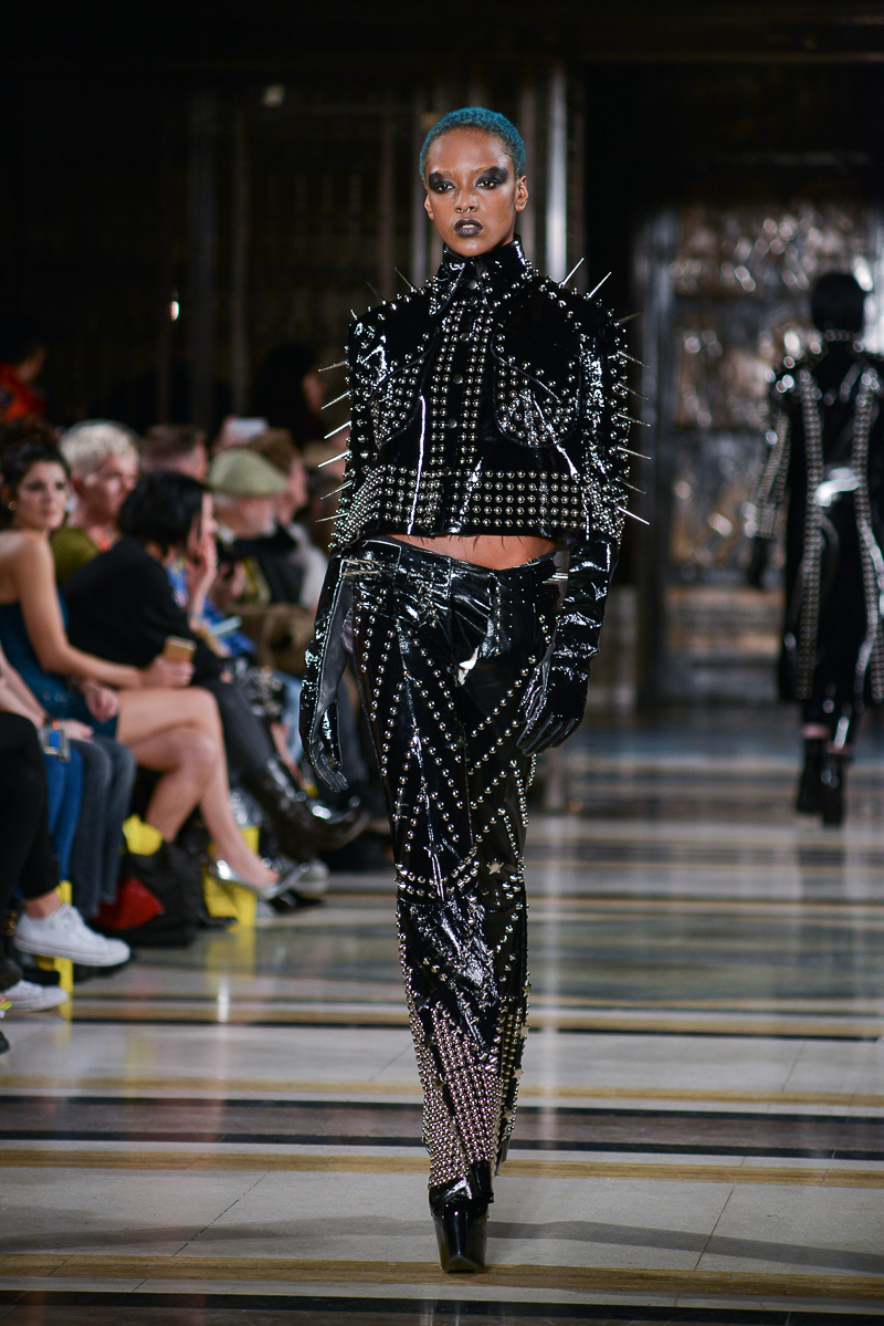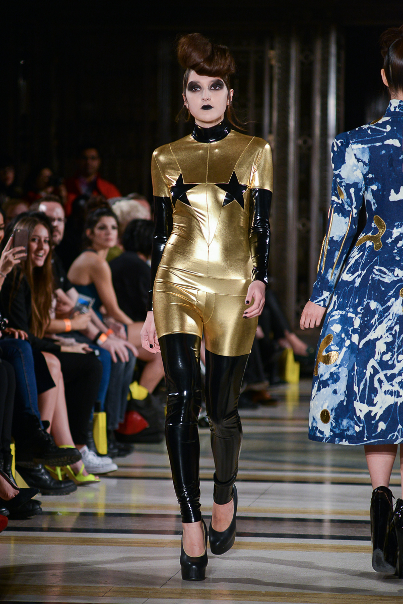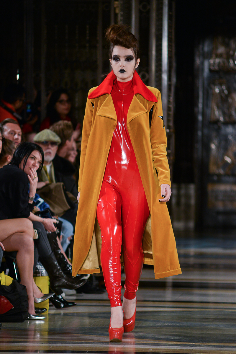 Tough embellishments gave an added edge to Hogg’s latex heavy collection. Black latex biker jackets and duster coats were heavily embellished with an array of spikes, whilst the range saw an added pop of colour with the incorporation of multi-coloured and gold latex catsuits. Bright yellow bell skirts, burnt red coats and matching yellow and green two piece suits embellished with stars, broke up the largely black collection.
