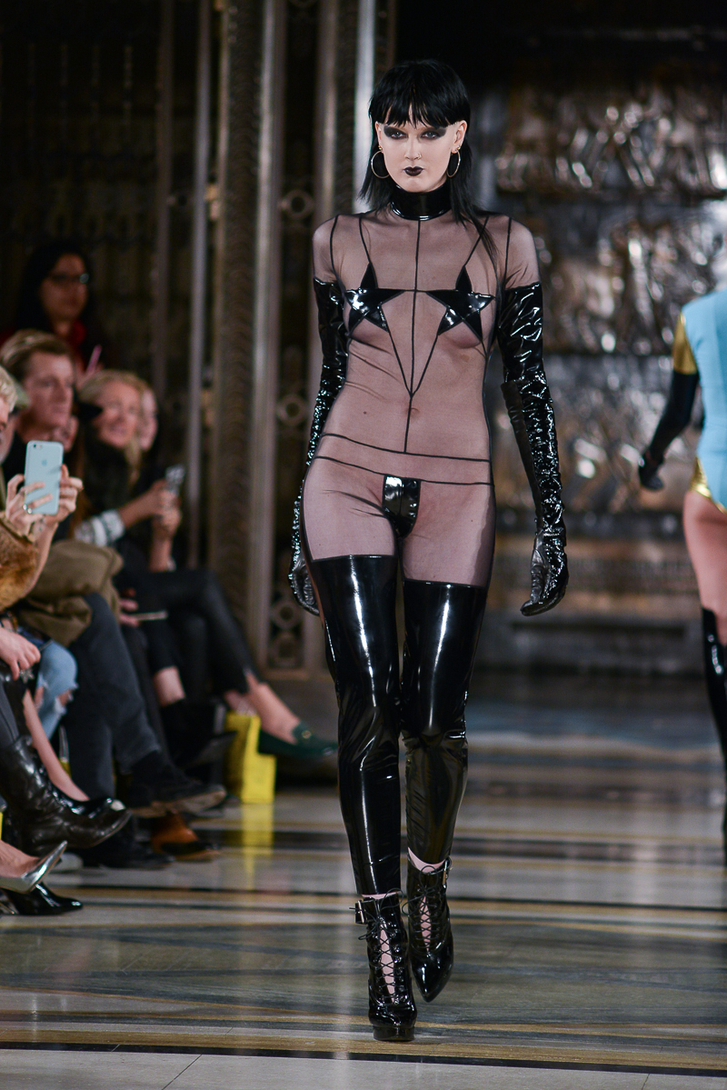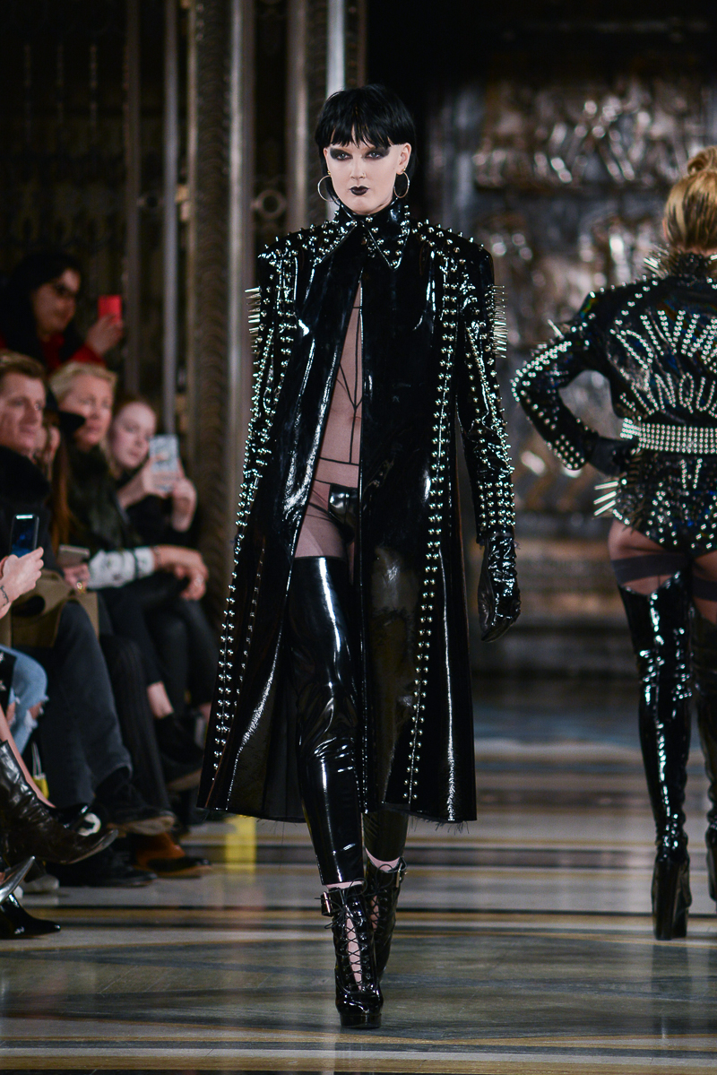 Over the knee latex high-heeled boots and platform heels and smoky black eye makeup and black lips completed the look for autumn/winter 16.